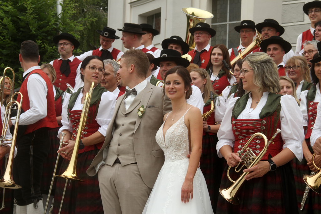 Nachdem einem Musikanten-Gruppenbild auf der Kirchentreppe, für das auch noch zusätzlich eine Fotodrohne zum Einsatz kam, schritt das Brautpaar über den ausgelegten roten Teppich zu einer überdimensionalen Hollywoodschaukel, wo die Fotografen noch ganz spezielle Registerfotos anfertigten.
