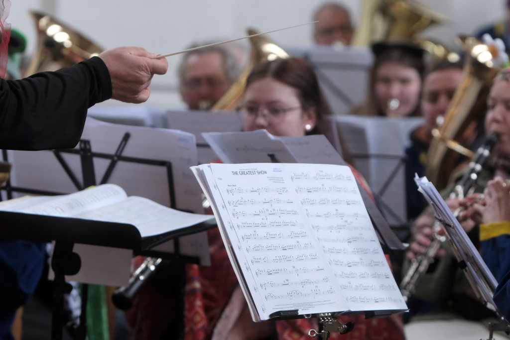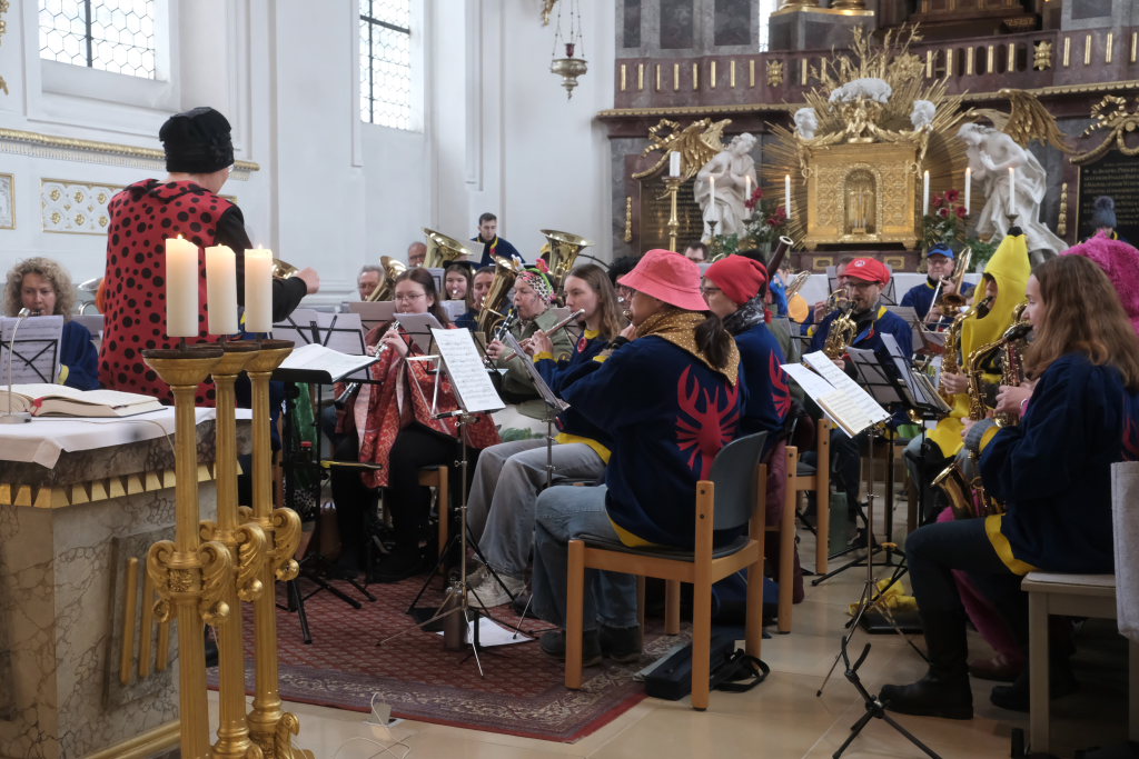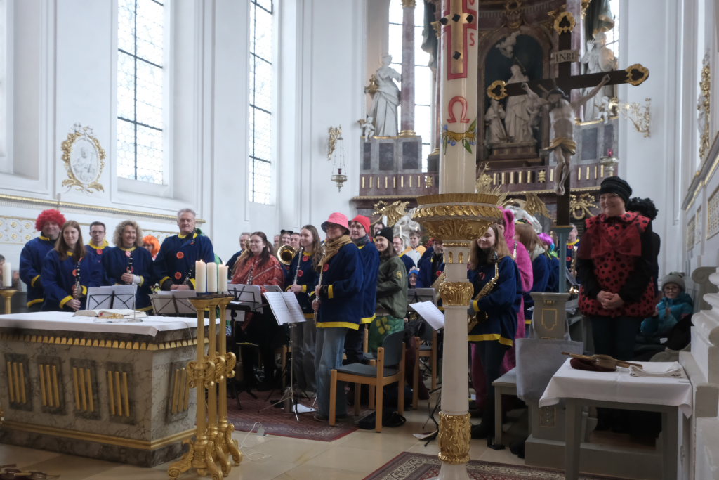 Dass diese Narrenmesse auch zu einem echten Audio-Highlight wurde, dafür sorgte die Stadtkapelle mit ihrer Leiterin Petra Springer. Neben den Liedern aus dem Gotteslob sorgten vor allem ihre Instrumental-Stücke für Kirchenkonzert Feeling. Etwa mit Titeln wie The wishing Well von Rosano Galante oder zur Kommunionbegleitung das kraftvolle „The Greatest Show“. So machte die Stadtkapelle die Narrenmesse zu einer runden Sache. Kein Wunder, dass nach dem Schlusssegen durch Pfarrer Stefan Maier – zurecht – frenetischer Jubel für sie aufbrandete, der sie noch zu der Zugabe „The Wellerman comes“ antrieb.