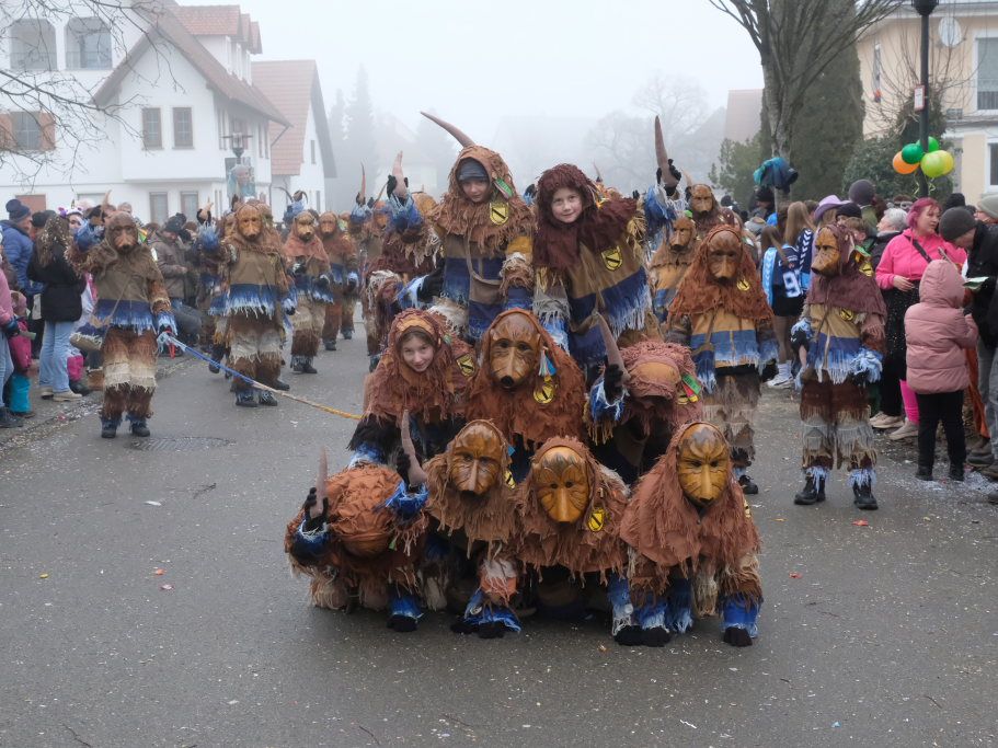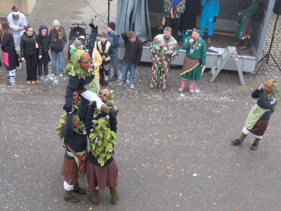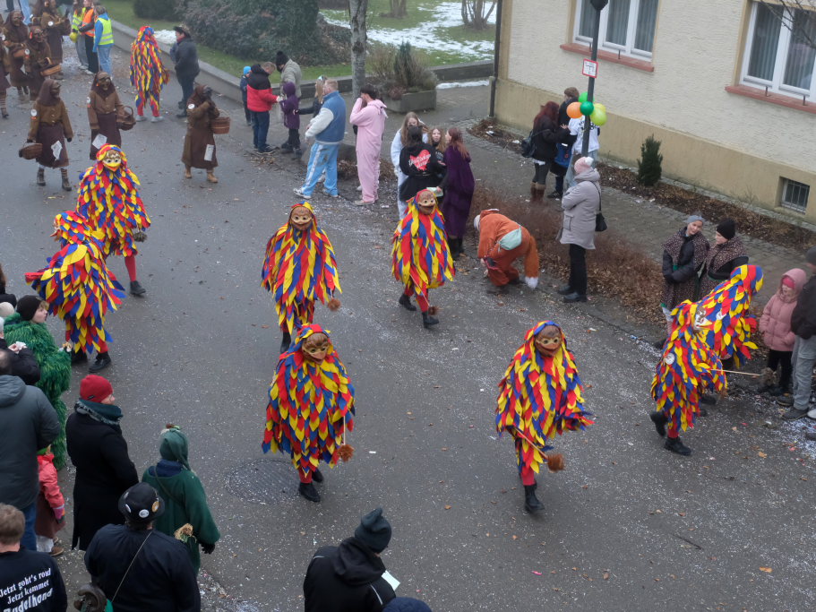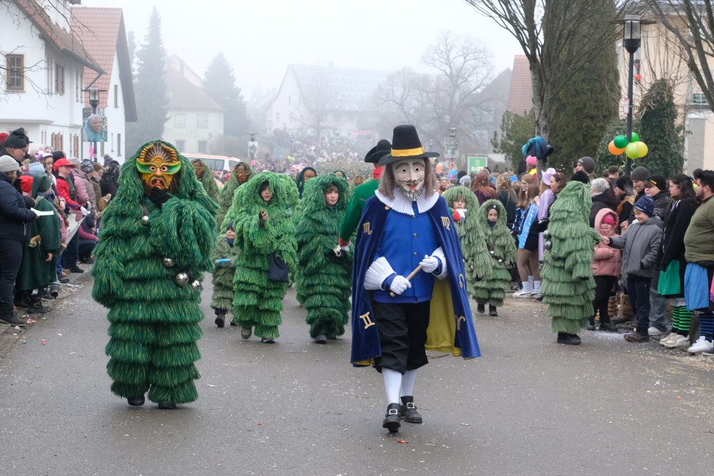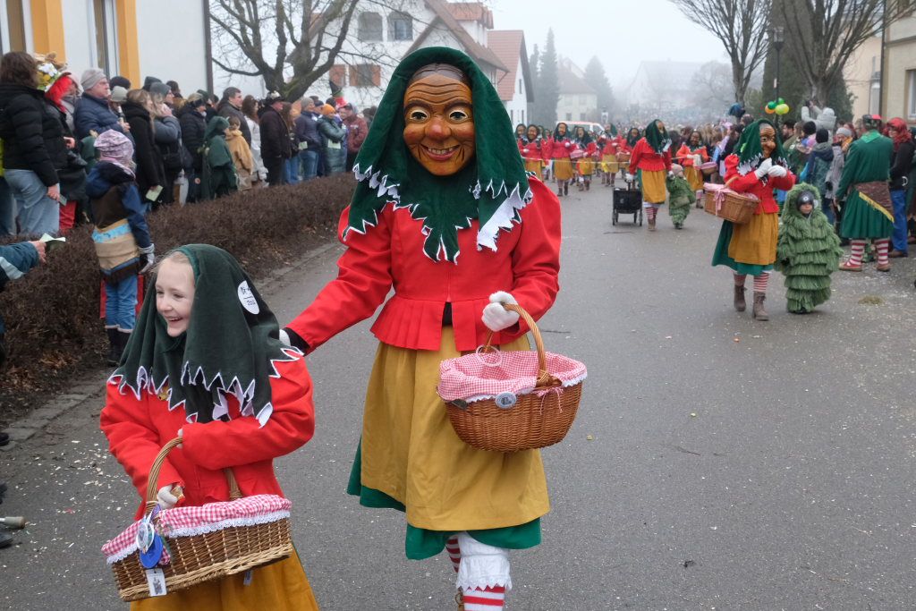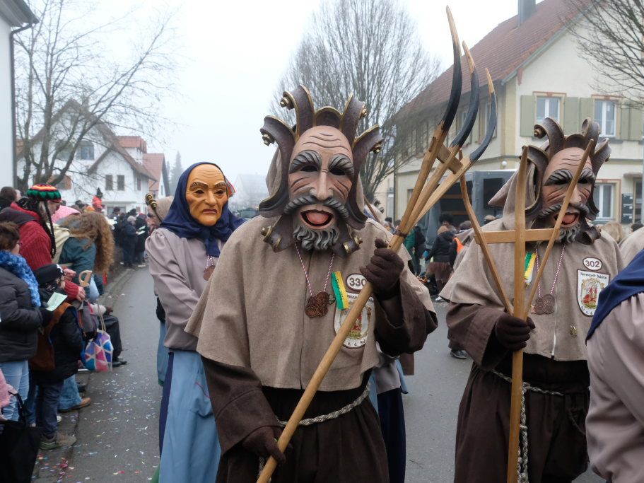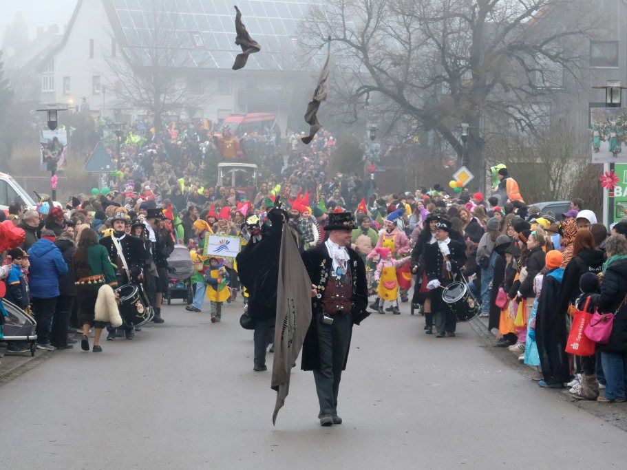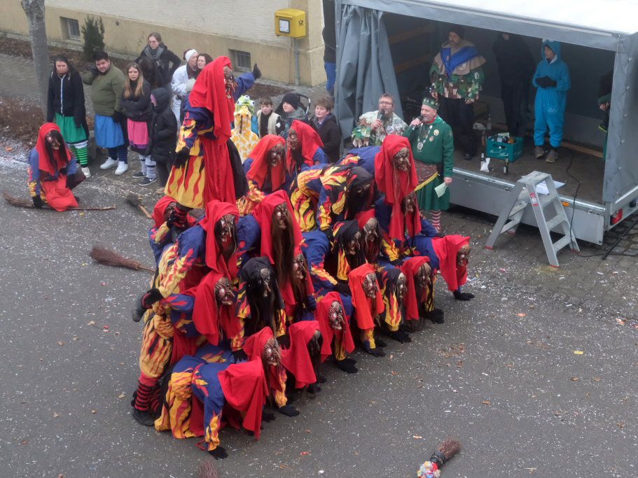 Mit den weitesten Weg auf sich genommen hatten die Lauinger Hexen, die Heimatzunft von Alex Wild sowie die beiden Ulmer Zünfte mit Gauga Ma und Hagelhex. Den Abschluss des Zuges bildete dann der „Mischwald“ bestehend aus einigen Bahwaldbohle und den Baindter Rasplern.