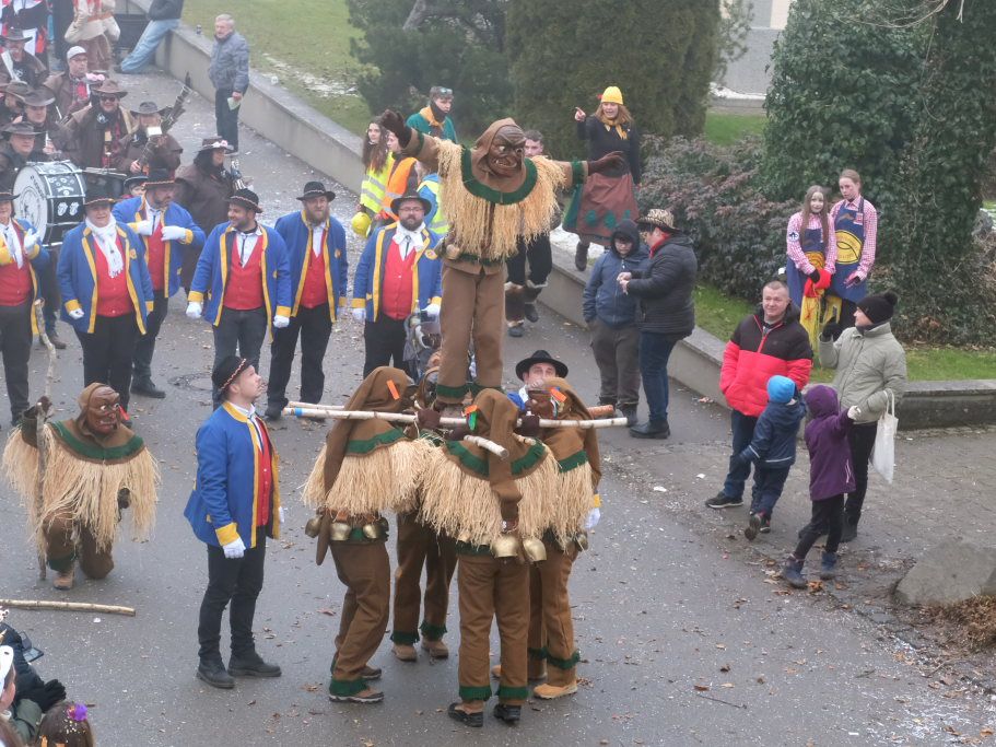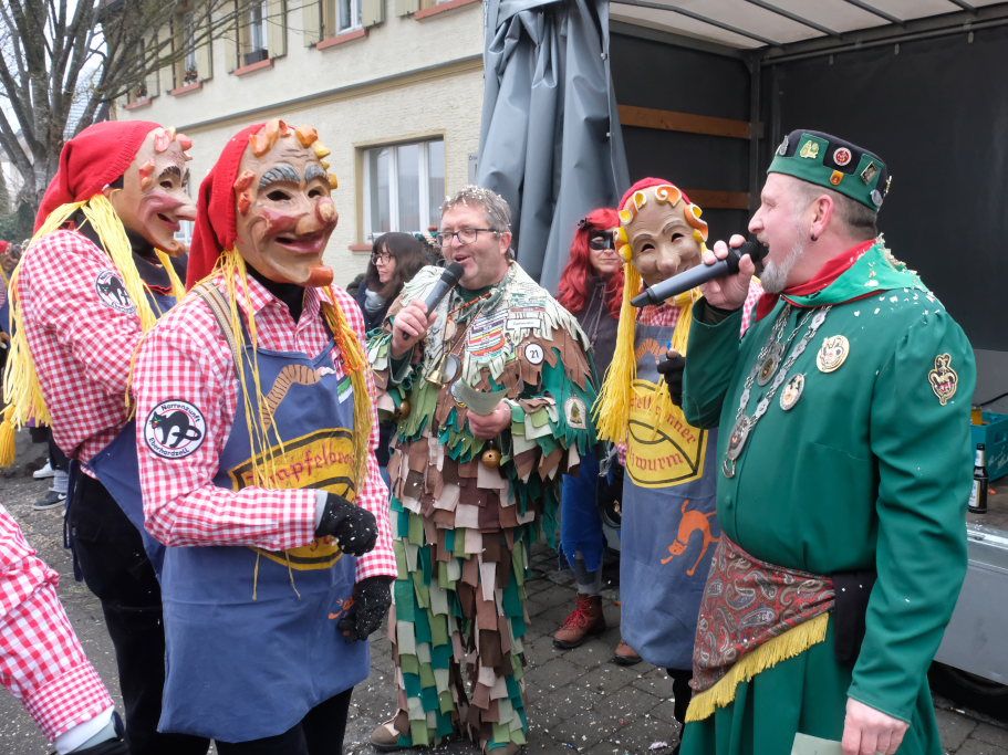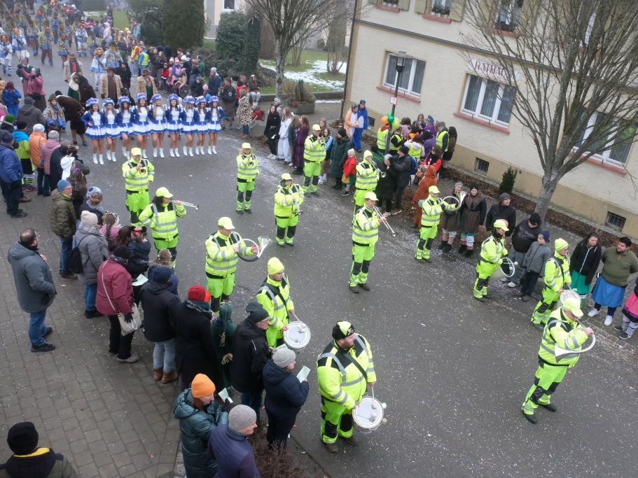 Die Hauerzer Baadgoischdr durften natürlich als Nachbarn nicht fehlen. Und D´Langjupp Seibranz hatte sich im Gefolge der Vollgasbänd die Dienste eines ganz prominenten Däfeles-Bua gesichert: der Seibranzer Zunftmeister Willi „WilliBu“ Butscher höchstpersönlich kündigte seine Narrenzunft mit der überdimensionalen Langjupp-Figur an. Einen ganz besonderen „Chef“ hatten auch die Schalmeien d`Riedspatza dabei: Wolfgang Lahl ist im Hauptberuf Bürgermeister von Weil im Schönbuch. Die dritte „Musik“ war der Fanfarenzug Bad Wurzach, der im vergangenen Jahr seinen 60er feierte und sich dafür fasnetlich neu einkleidete, mit topmodischer Leo-Hose und Lila Kunstpelz-Jacke.