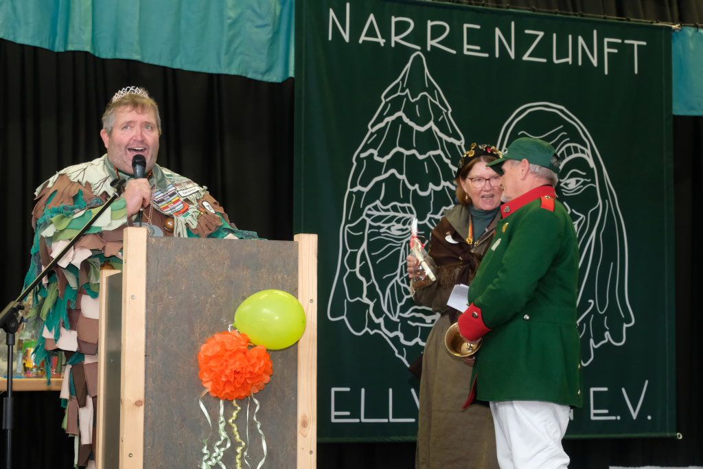 Bereits vor dem Sprung war viel los im Festzelt beim Sportplatz und der Elbach-Halle. Traditionell eröffnet die ausrichtende Narrenzunft immer den Narrensprung. In Ellwangen ticken die Uhren anders: Hier eröffnete der Kindergarten mit seinen Ellbachzwergen hinter dem Fanfarenzug Zell Graf zu Erbach-Erbach den Ellwangener Narrensprung. Ihm folgten mit allen 55 (plus drei ehemaligen) Schülern samt ihrem Lehrpersonal die Waldwichtel der Grundschule Ellwangen-Dietmanns. Ihnen folgten die Bobohle aus Rot an der Rot, dem Ort, zu dem auch Ellwangen gehört. Kein Wunder, dass sich beim Ellwanger Rathaus, wo Turbo Angele und Alex Wild als männliche Sonja Schreckleins das närrische Geschehen kommentierten, sich auch der Roter Bürgermeister Andreas Maaß einfand.