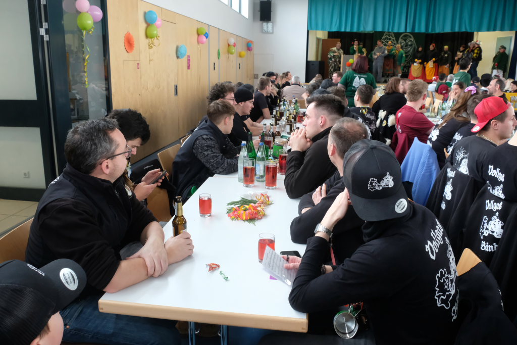 Zum Umzug trugen alle Vereine des Ortes ihren Teil bei, um die zahlreichen Narren und Gäste zu versorgen. So gab es bei der Feuerwehr Kaffee und Kuchen, in der Halle und um die Halle sorgte die Zunft für die Verpflegung. Bei der Grundschule versorgte der Musikverein Ellwangen die Narren und Zuschauer mit Leberkäs-Wecken, die so gut mundeten, dass „Neandertaler“ Walter Engeser schon während des Umzugs den Ausverkauf vermelden musste. Aber Flüssignahrung – zwei Bier ersetzen eine ganze Mahlzeit – half dem einen oder anderen über diesen Schmerz hinweg.