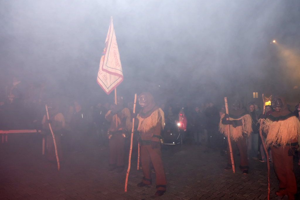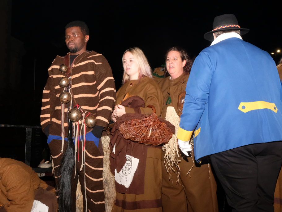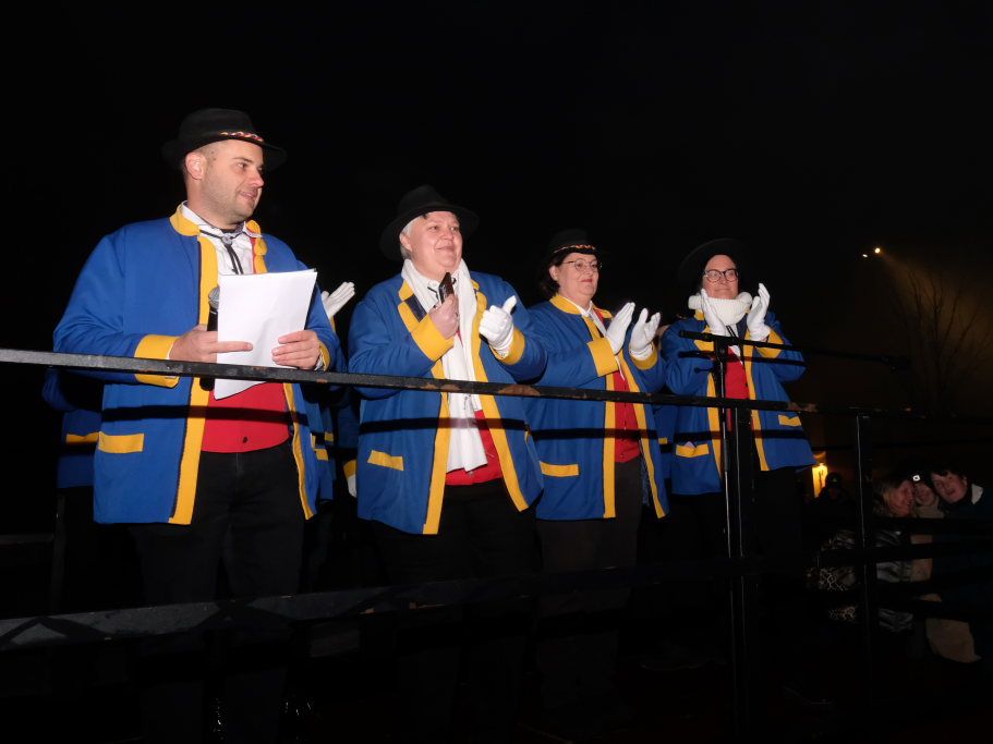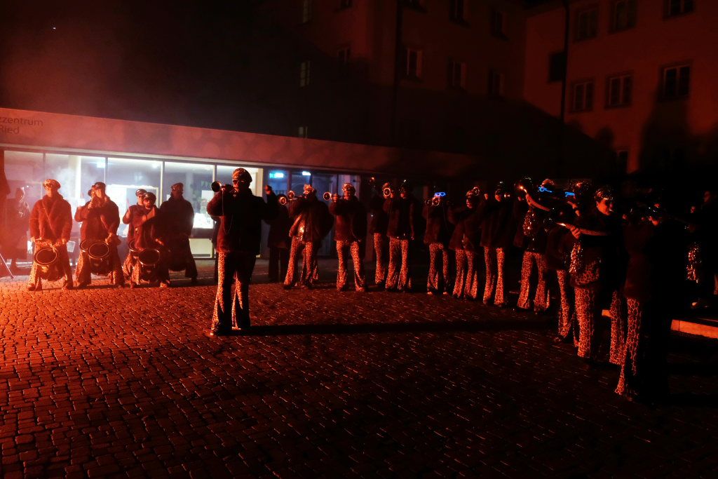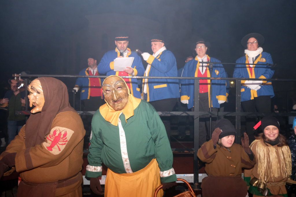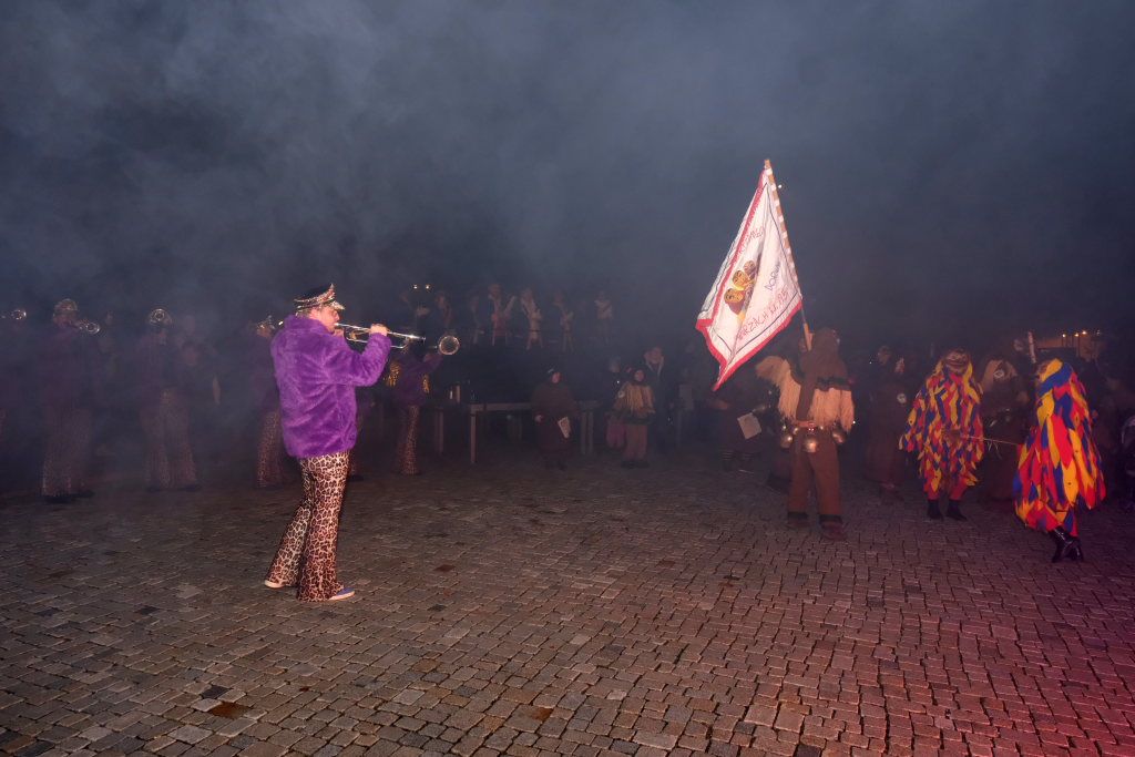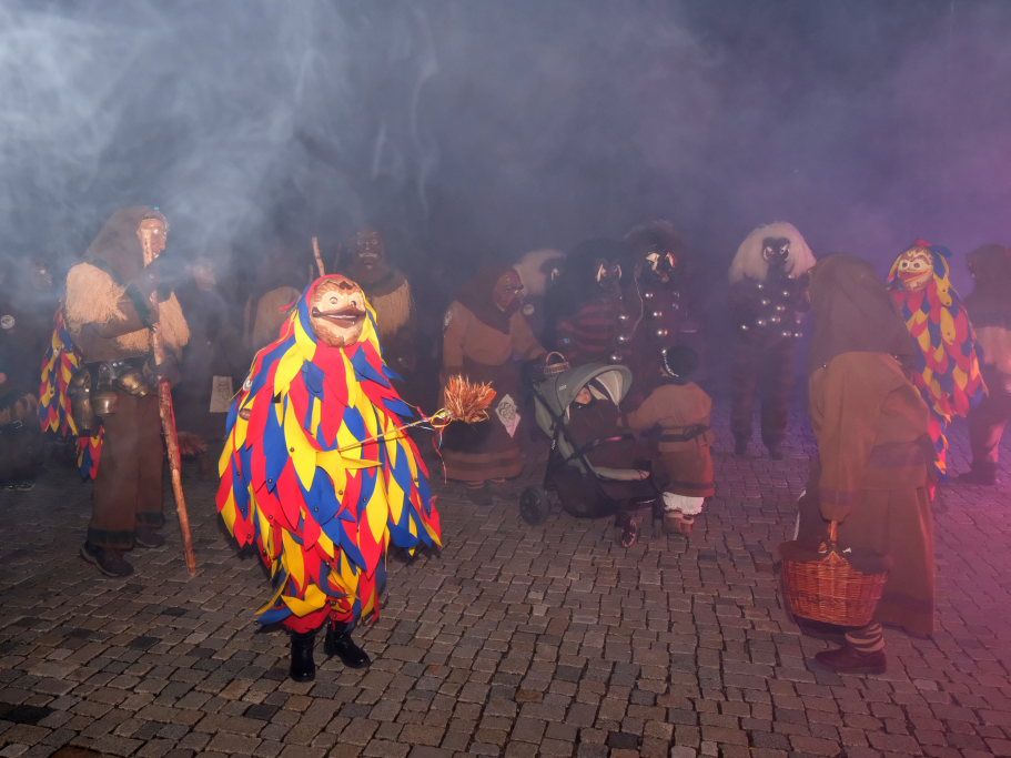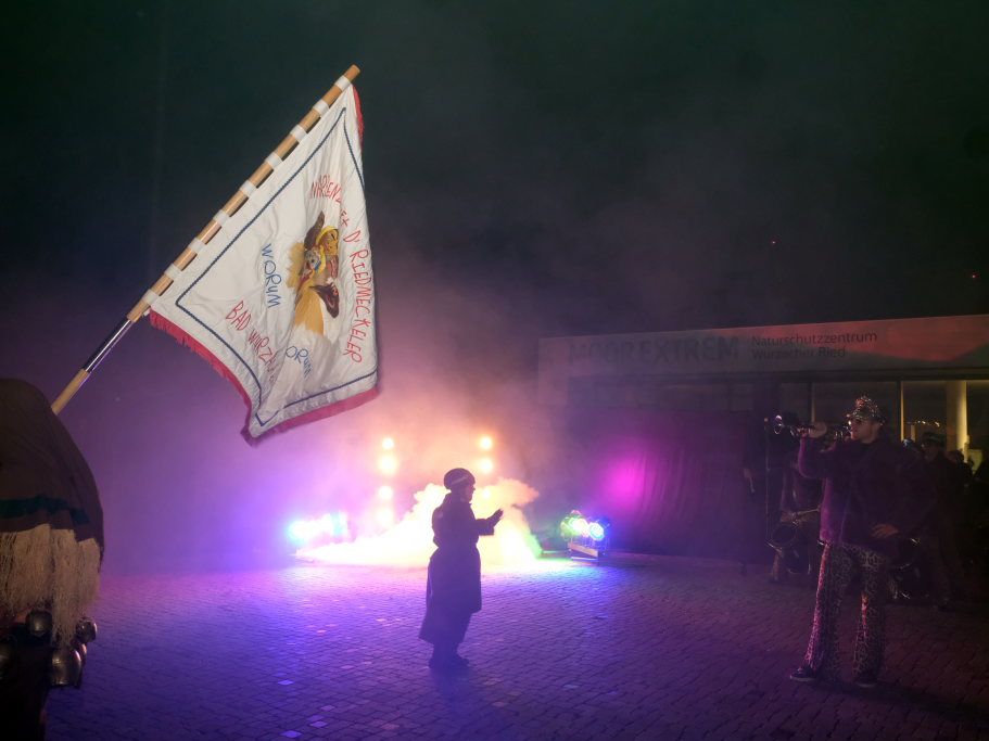 Zunftmeister Dominik Neher trug die traditionellen Geschichten und Sagen zu den einzelnen Narrenfiguren vor, während diese durch den künstlichen Nebel ins Rampenlicht vor die kleine Bühne zu Füßen von St. Verena und Maria Rosengarten traten. Beginnend mit dem Namensgeber der Zunft, dem Riedmeckeler, dem das Moorweibla, die Einzelmaske der Burgfrau und das Schnepfle in seinem in den Stadtfarben gehaltenen „Federkleid“ folgten. Den Abschluss machten dann die wilden Muetes. Mit dabei: Die Zunftfahne, auf die später die Täuflinge der Zunft die Treue schwören durften.