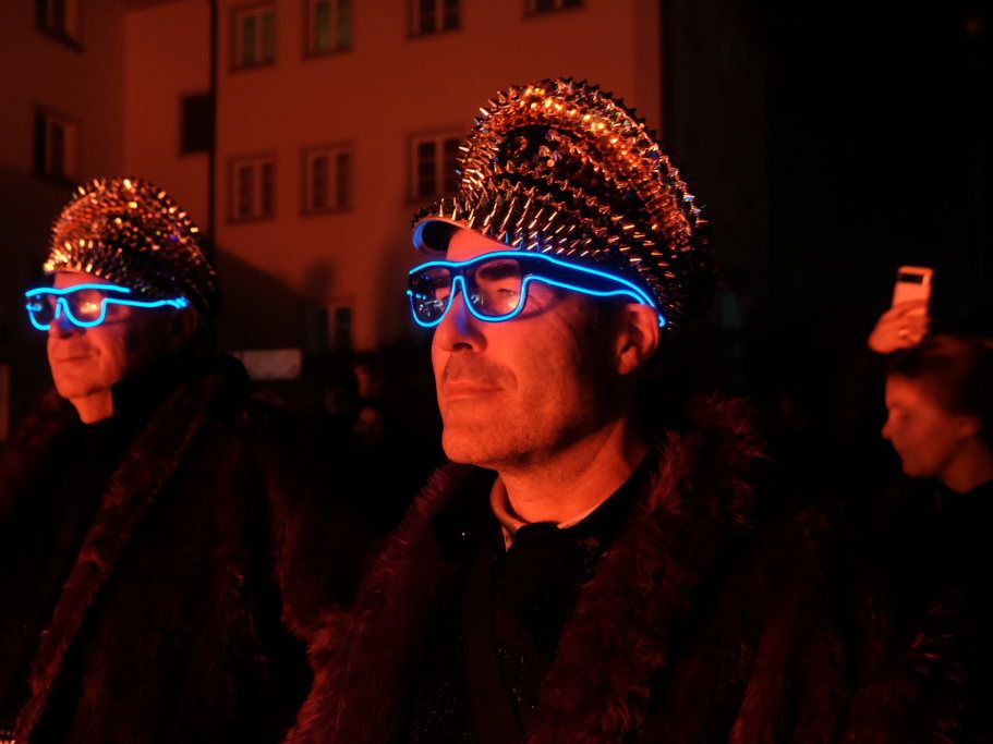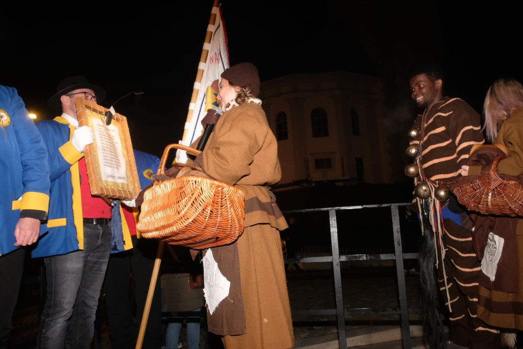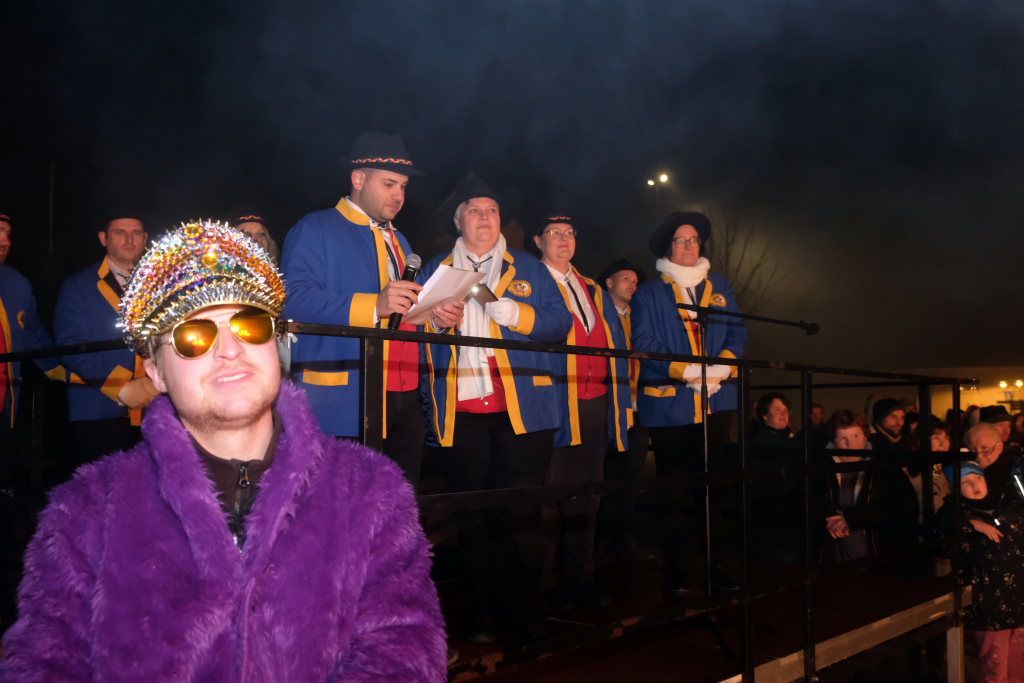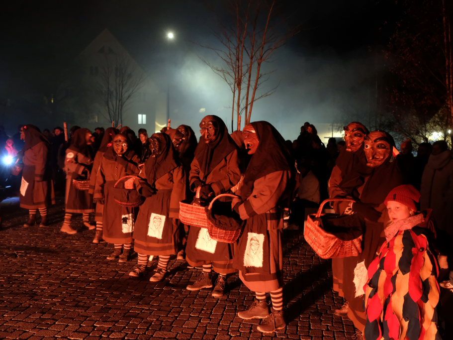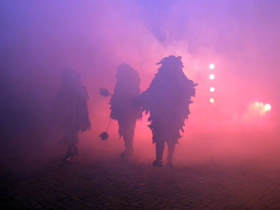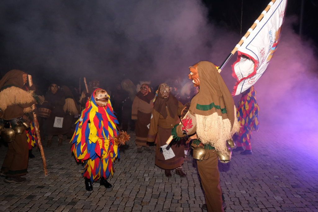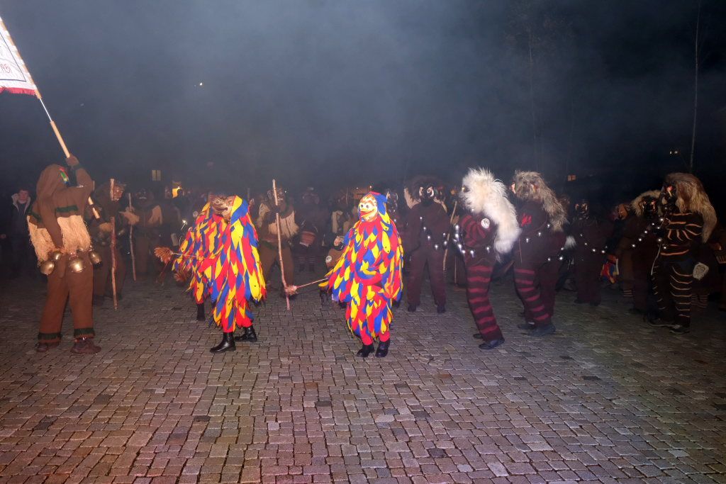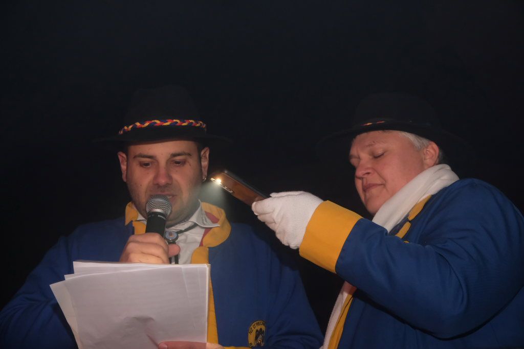 Zunftmeister Dominik Neher trug die traditionellen Geschichten und Sagen zu den einzelnen Narrenfiguren vor, während diese durch den künstlichen Nebel ins Rampenlicht vor die kleine Bühne zu Füßen von St. Verena und Maria Rosengarten traten. Beginnend mit dem Namensgeber der Zunft, dem Riedmeckeler, dem das Moorweibla, die Einzelmaske der Burgfrau und das Schnepfle in seinem in den Stadtfarben gehaltenen „Federkleid“ folgten. Den Abschluss machten dann die wilden Muetes. Mit dabei: Die Zunftfahne, auf die später die Täuflinge der Zunft die Treue schwören durften.