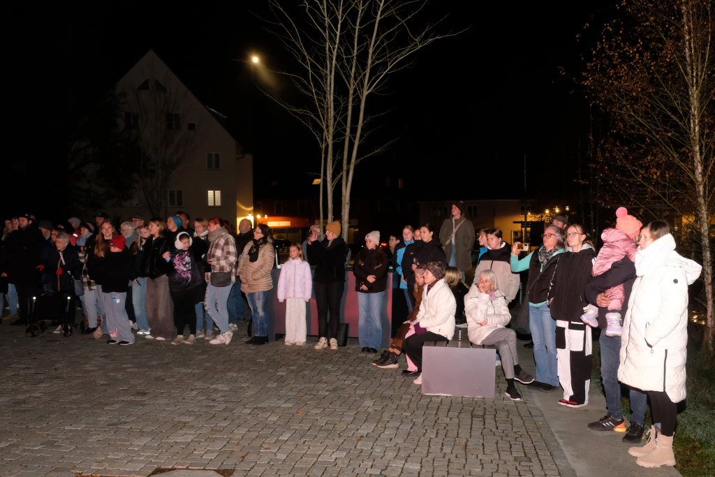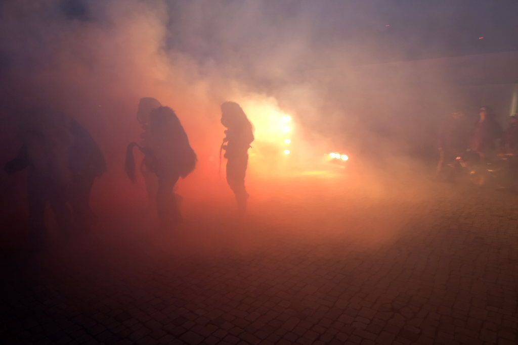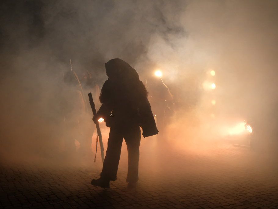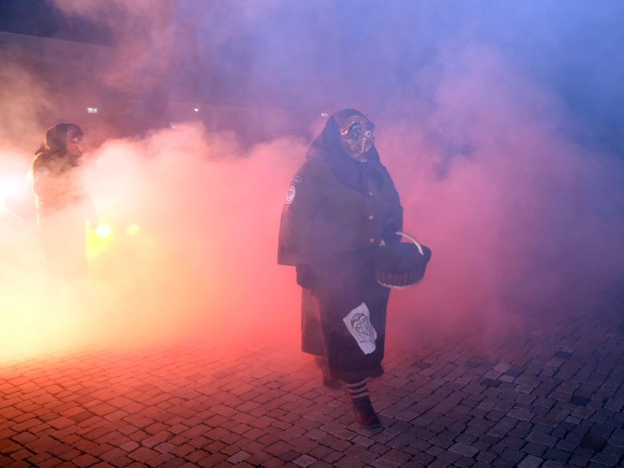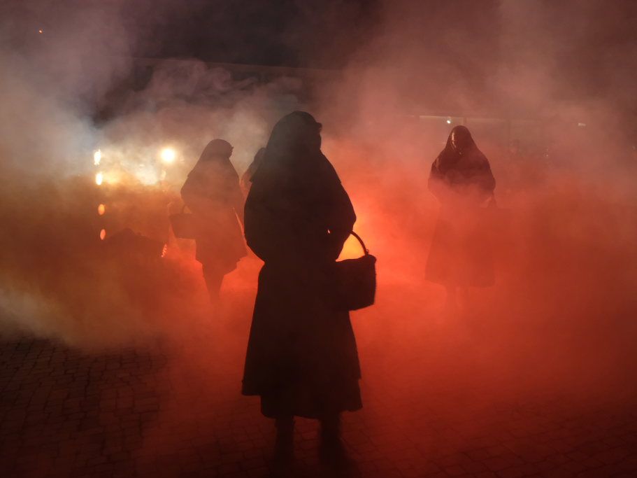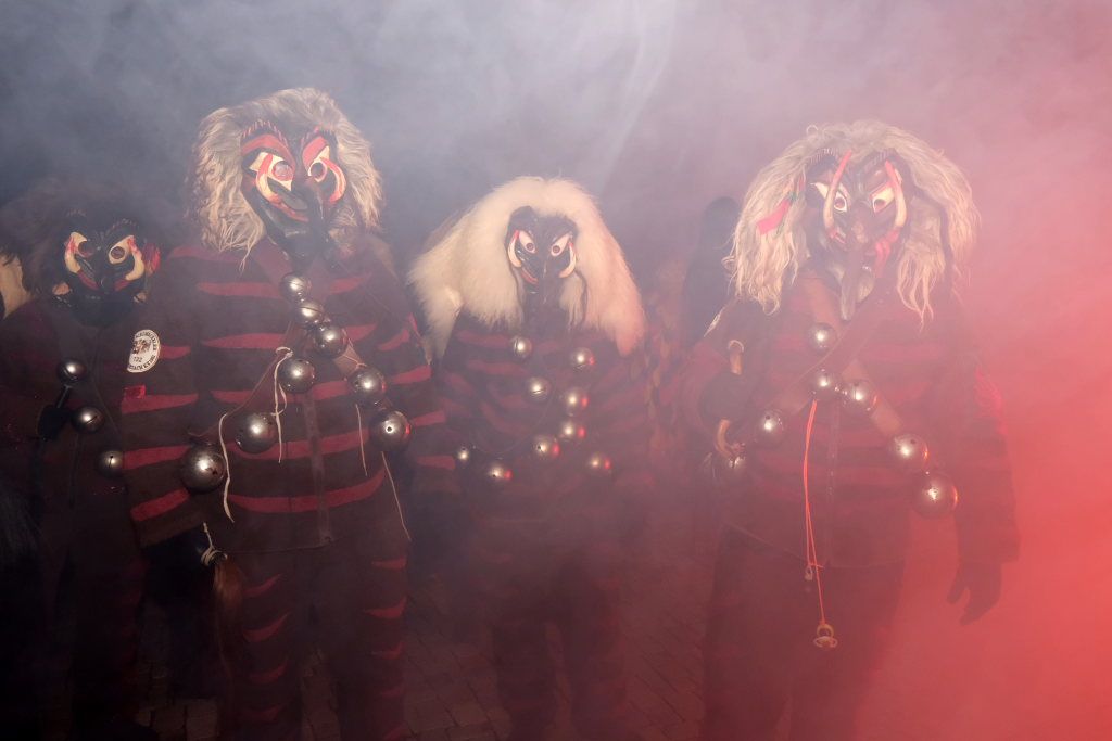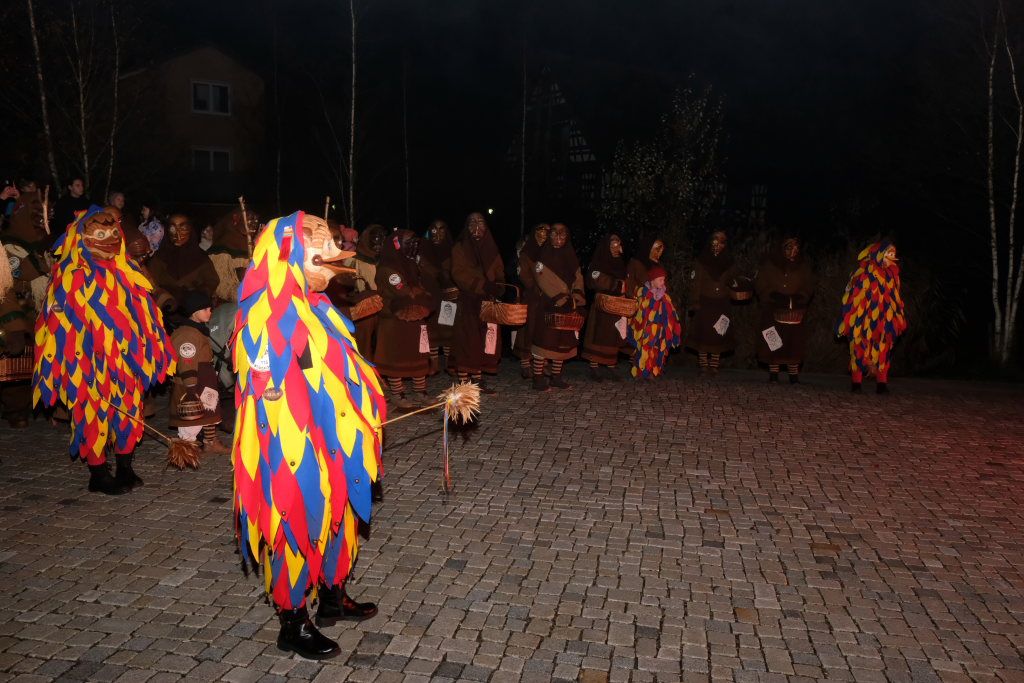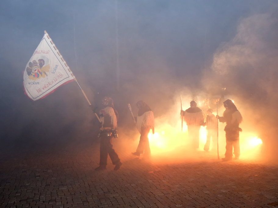 Zunftmeister Dominik Neher trug die traditionellen Geschichten und Sagen zu den einzelnen Narrenfiguren vor, während diese durch den künstlichen Nebel ins Rampenlicht vor die kleine Bühne zu Füßen von St. Verena und Maria Rosengarten traten. Beginnend mit dem Namensgeber der Zunft, dem Riedmeckeler, dem das Moorweibla, die Einzelmaske der Burgfrau und das Schnepfle in seinem in den Stadtfarben gehaltenen „Federkleid“ folgten. Den Abschluss machten dann die wilden Muetes. Mit dabei: Die Zunftfahne, auf die später die Täuflinge der Zunft die Treue schwören durften.