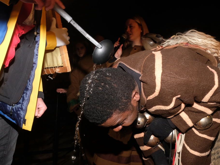 Franzi Hierlemann eröffnete den Reigen der Täuflinge. Jasmin Lach, Natalie Hornung, Carina Bormann, Sabrina Heine, Carina Hofmann, Selina Bracciale, Toni Okoye, Andy Hlawati und Marco Bosch waren die weiteren diesjährigen Neuaufnahmen. Die Täuflinge bekamen dazu eine Kopfdusche, mit einem Schöpflöffel aus einem Eimer gefüllt mit feinstem Achwasser. Bevor sie einen kräftigen Schluck eines Spezialgebräus und einem ordentlichen Schluck von einem Hochprozentigen zu sich nehmen durften, mussten sie die Eidesformel auf den Narrenverein schwören. Darin heißt es unter anderem: „Hiermit schwöre ich, dass ich nach bestem Wissen und Gewissen für die Belange der NZ Bad Wurzach einstehe, aktiv am Vereinsleben teilnehme und versuchen werde, ein vorbildliches Mitglied zu sein.” Mit einem Kuss auf die Vereinsfahne wurde ihre Mitgliedschaft endgültig besiegelt.