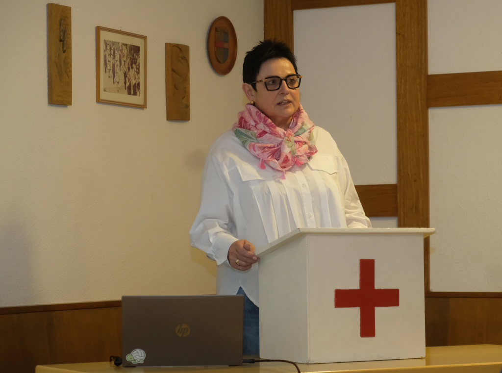 Petra Greiner eröffnete ihren Bericht mit einem Zitat von Clemens Theodor Perthes: „Gott hat uns Hände gegeben, nicht um sie über dem Kopf zusammenzuschlagen, sondern um mit ihnen Gutes zu tun.“ Genau das hätten die Kameradinnen und Kameraden im vergangenen Jahr getan. „Im Zeichen der Menschlichkeit setzen wir uns für das Leben, die Gesundheit, das Wohlergehen, den Schutz, das friedliche Zusammenleben und die Würde aller Menschen ein. “ Es gebe aber auch Themen, die uns als Gesellschaft zutiefst erschütterten. Und die außer Mitgefühl auch das Handeln aller verlangten. „Eines dieser Themen ist die immer brutaler werdende Zeit, in der wir heute leben.“ Besorgt zeigte sie sich darüber, dass immer häufiger auch Helfer Ziele von Angriffen werden. Diese Angriffe seien gegen alle Werte unserer Gesellschaft gerichtet: Menschlichkeit, Mitgefühl, Solidarität. Auch deswegen sei das große Zusammengehörigkeitsgefühl der DRK-Mitglieder sehr wichtig, weshalb über die Übungsabende hinaus auch viele gesellige Termine in den Berichten vorkämen. Ein Ausflug zum THW in Augsburg, Grillfest, Kässpätzleessen, Maiwanderung oder die monatlichen Henry-Treffs: „Das alles sind Teile, die unsere Kameradschaft eng zusammenschweißen und dann die Vielzahl der Aufgaben in unserem Verein besser bewältigen lassen.“ Dann ging sie in ihrem Jahresbericht auch auf die Mitgliederzahlen und -Struktur ein: Der Ortsverband zählt aktuell 144 Mitglieder (80 weibliche und 64 Männer), es seien neue Mitglieder dazu gekommen. Das Alter der Mitglieder liege zwischen acht und 86 Jahren. Ein besonderes Highlight ist alljährlich das JRK-Zeltlager, das in diesem Jahr sein 50jähriges feierte.