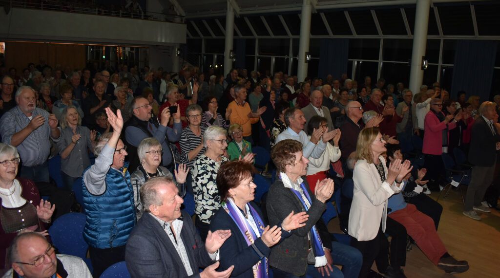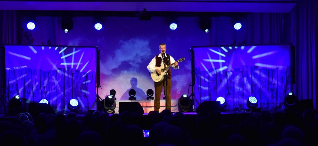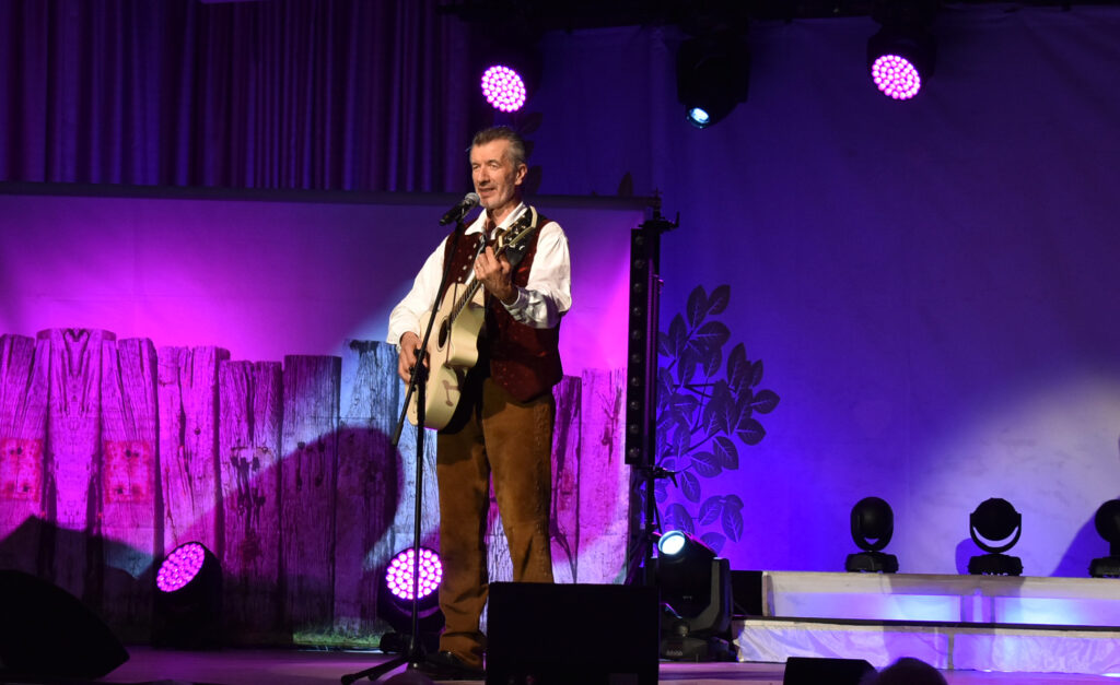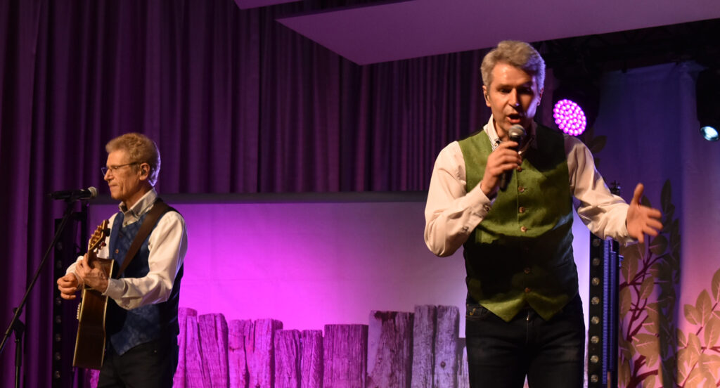 Zusammen mit Nadin aus Berlin sang Oswald von der Alm „Komm, ich zeig Dir die Berge“, passend zur Berlinerin, obwohl Nadin viel in Südtirol ist, auch dort 2023 geheiratet hat, wie sie erzählt. Das Finale des 1. Teil des Abends aller Künstler zusammen war grandios: Verschiedene Wander- und Berglieder wurden gemeinsam mit dem Publikum gesungen. Für unter-40-Jährige hätte es mit den Texten wohl gehapert, aber so erfüllte munterer Gesang den schönen Wurzacher Kursaal.