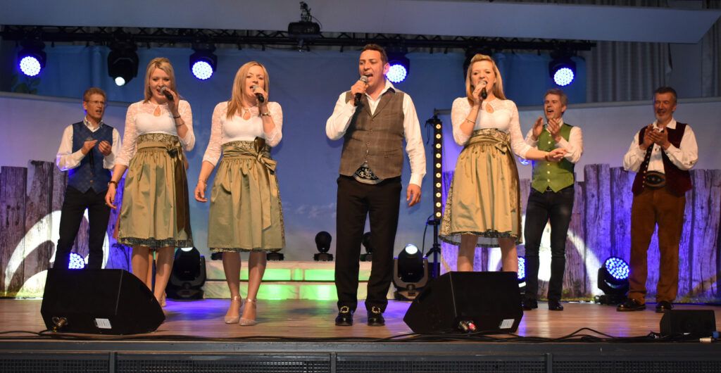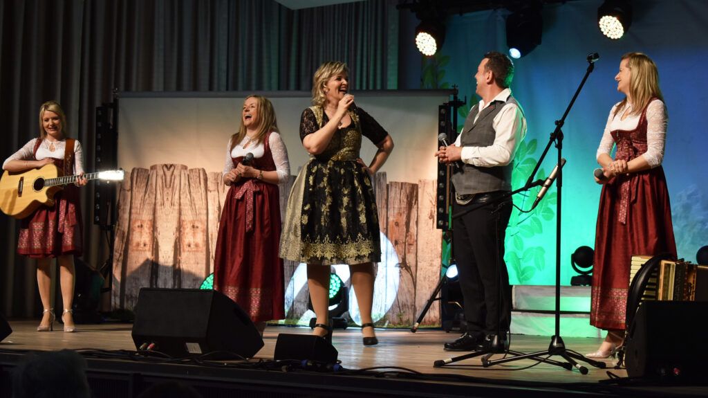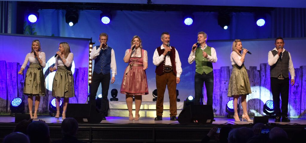 Beim nochmals sehr erfrischenden zweiten Teil des Abends kamen wieder alle Musiker und Sänger auf die Bühne, mit anderem Outfit, neuen Liedern und noch mehr Stimmung im Gepäck. „So samma – so bleib‘mr“ war gleich der Mitsing-Renner der Niederbacher-Geschwister, ebenso beliebt das noch bekanntere Lied, die Hymne von Südtirol, wer kennt ihn nicht: Den „Bozener Bergsteiger-Marsch“.