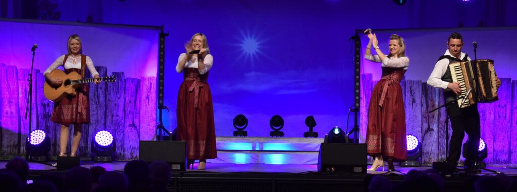 Mit flottem Polka-Rhythmus machten die vier Geschwister Niederbacher mit Liedern von der „Hoimat“ den Auftakt, erzählten von ihrem Bergbauernhof im Pustertal, wo sie alle aufgewachsen sind, und zudem in zweiter Generation mit eigenen Volksmusiksongs öffentlich auftreten. Wunderschöne Stimmen der drei Schwestern Christina, Angelika und Andrea, begleitet mit zünftiger Akkordeonmusik ihres Bruders Manfred sorgten gleich für Stimmung im Saal, man klatschte und sang zu den einzelnen Liedern, oder lauschte zu ruhigeren, besinnlichen Titeln.