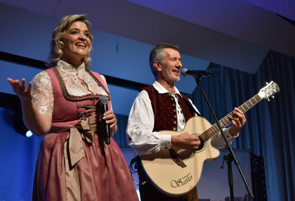 Wenn auch Oswald Sattler mit seiner Gitarre kaum einen Hauch von Choreografie bietet, steht er doch da wie ein Südtiroler Fels, ein Urgestein, ein Kerl von einem Mann mit wundervoller Tenorstimme. Die Gäste sind hingerissen, applaudieren, was das Zeug hält. „Ich könnt ohne Berge nicht leben“, singt der Mann, der in den Dolomiten zu Hause ist, und alle im Saal begleiten ihn stimmlich. Der „Rose von Südtirol“ folgt der „Sommerwind“, ein Welt-Klassiker, und noch ein Liebes- und ein Hoimat-Lied obendrauf, rauschender Beifall ertönt.