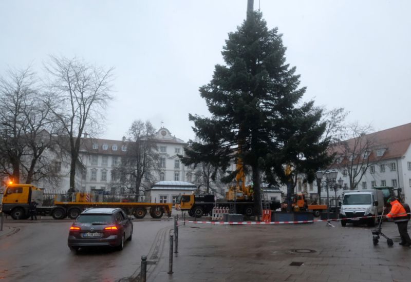 Bad Wurzach – Mithilfe eines Autokranes und zahlreichen helfenden Händen des städtischen Bauhofes konnte – traditionsgemäß am Mittwoch vor dem Weihnachtsmarkt – der große Christbaum für die Stadtmitte, der in diesem Jahr bei einem Privathaus in Baierz geschlagen wurde – nach Überwindung zahlreicher Hindernisse – zum Zielort transportiert werden.