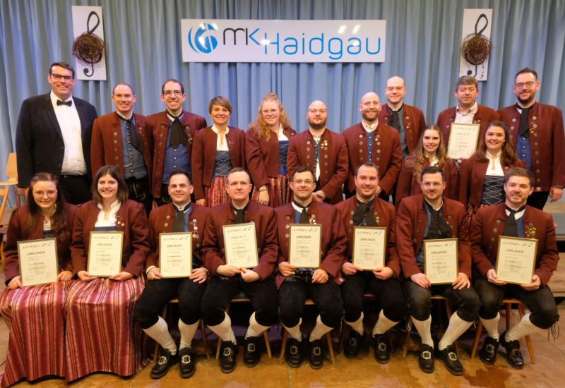 Hadgau – Im Rahmen des diesjährigen Jahreskonzertes der Musikkapelle Haidgau in der Turn- und Festhalle Unterschwarzach wurden langjährige Musiker durch den stellvertretenden Kreisverbandsvorsitzenden des Blasmusikkreisverbandes Ravensburg und langjährigen ehemaligen Dirigenten der Haidgauer Musiker Klaus Wachter – assistiert wurde er dabei übrigens von Bürgermeisterin Alexandra Scherer – geehrt.