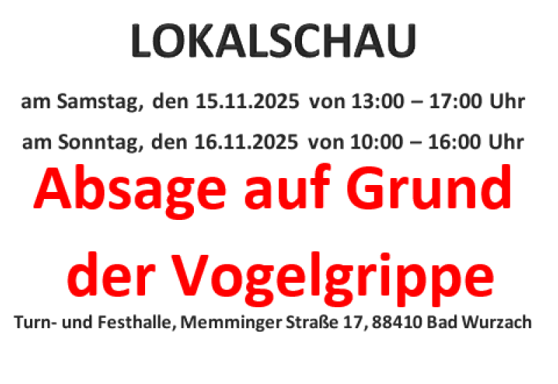 Bad Wurzach – Der Kleintierzuchtverein Bad Wurzach muss dieses Jahr auf Grund der Vogelgrippe seine Ausstellung in der Turn- und Festhalle Bad Wurzach, die für den 15. und 16. November geplant war, absagen. Wir wünschen Allen eine besinnliche Weihnachtszeit sowie einen guten Rutsch ins neue Jahr.