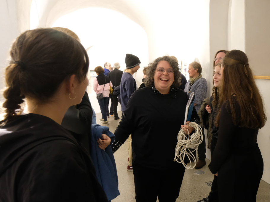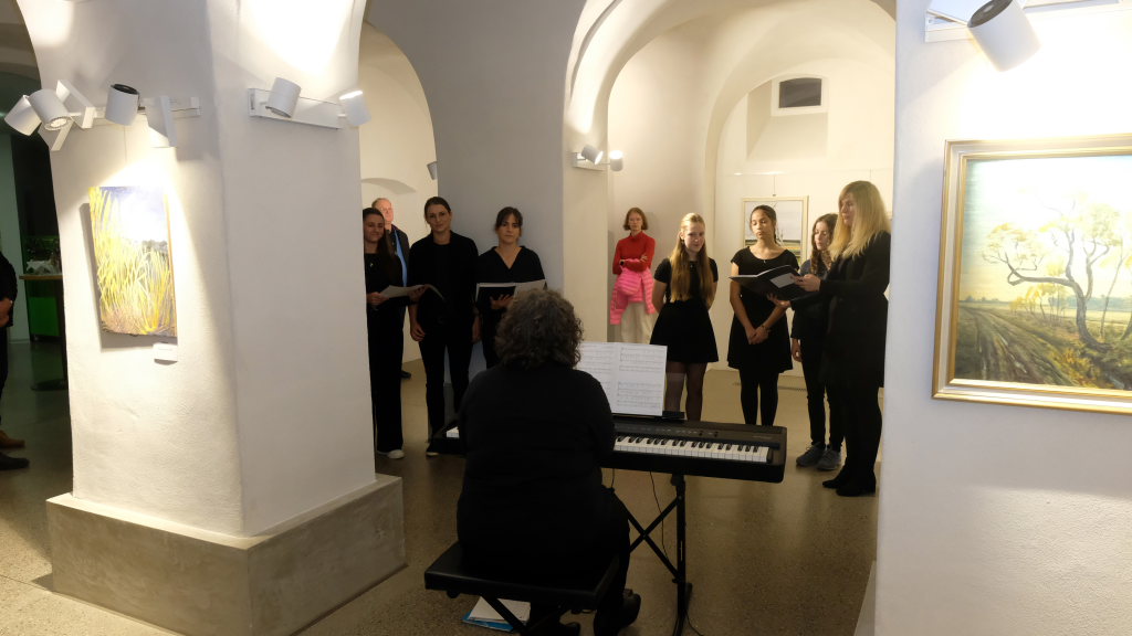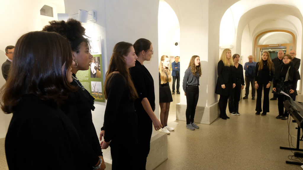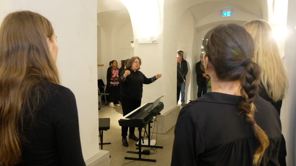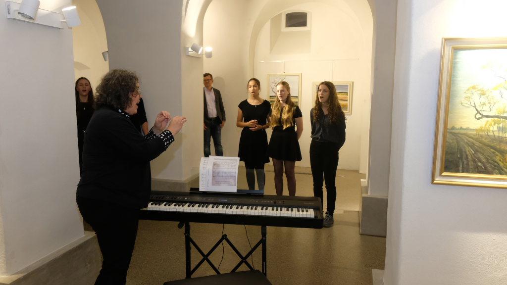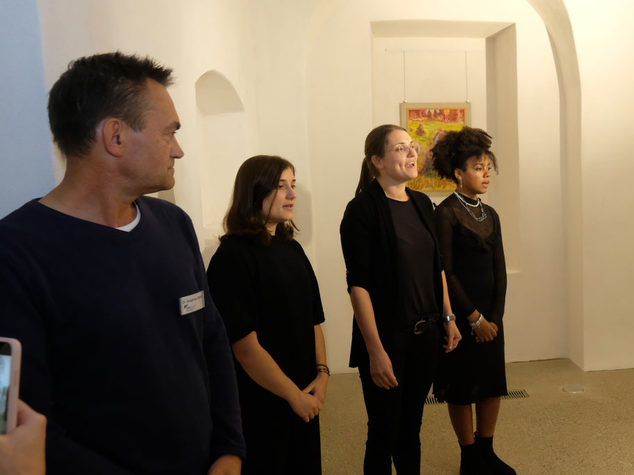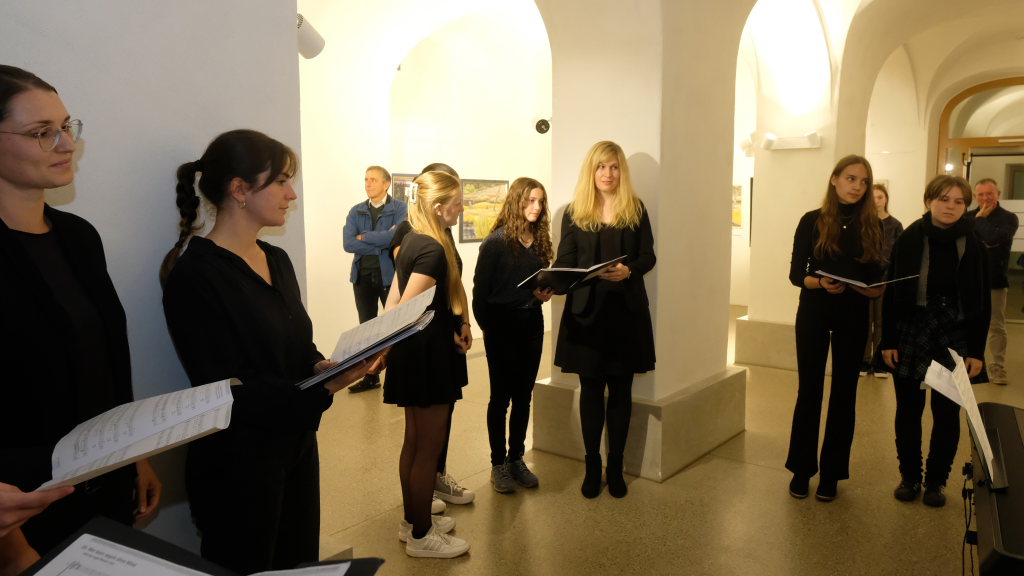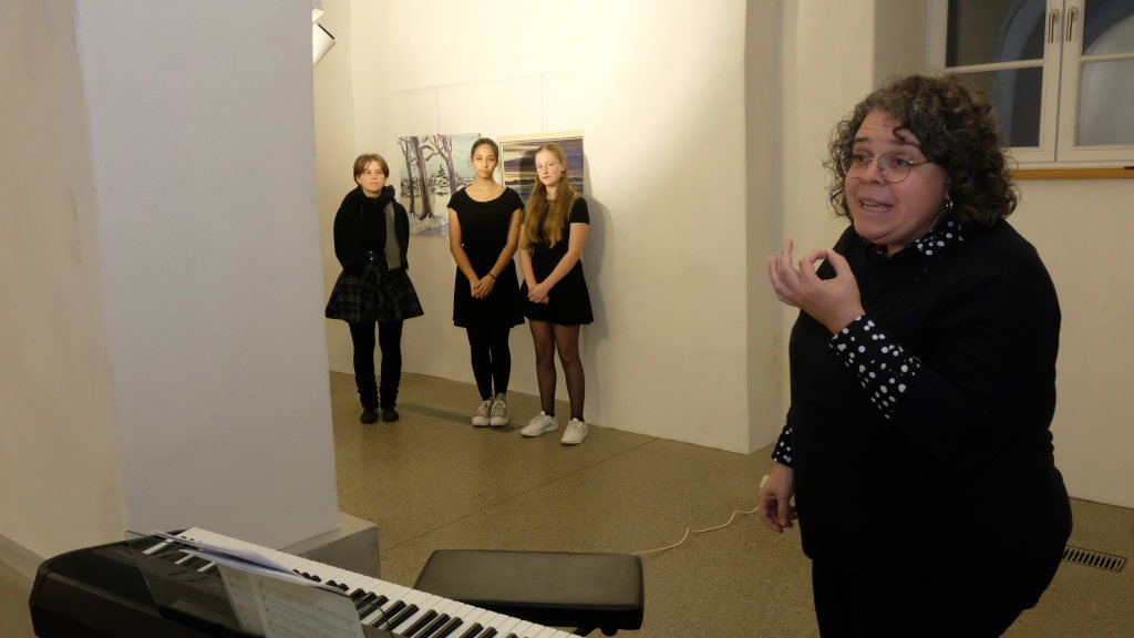 Christine Braig, Musiklehrerin am Salvatorkolleg, eröffnete mit dem Vokalensemble der Schule im Gewölbegang, in dem die Bilder ausgestellt werden, die Vernissage mit dem schwedischen Kanon „Livet“ (Leben).