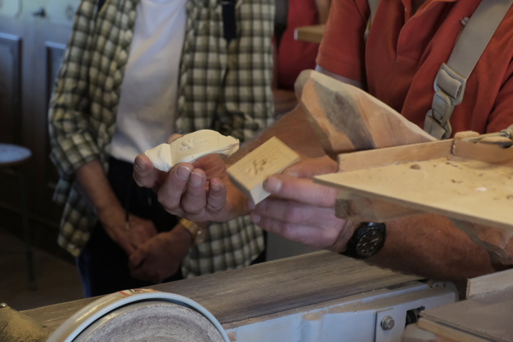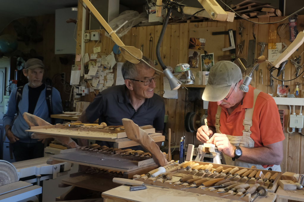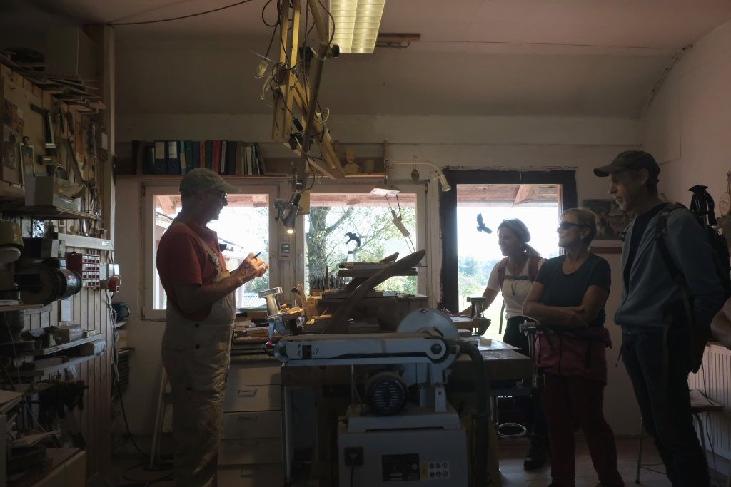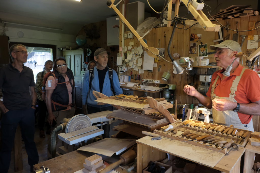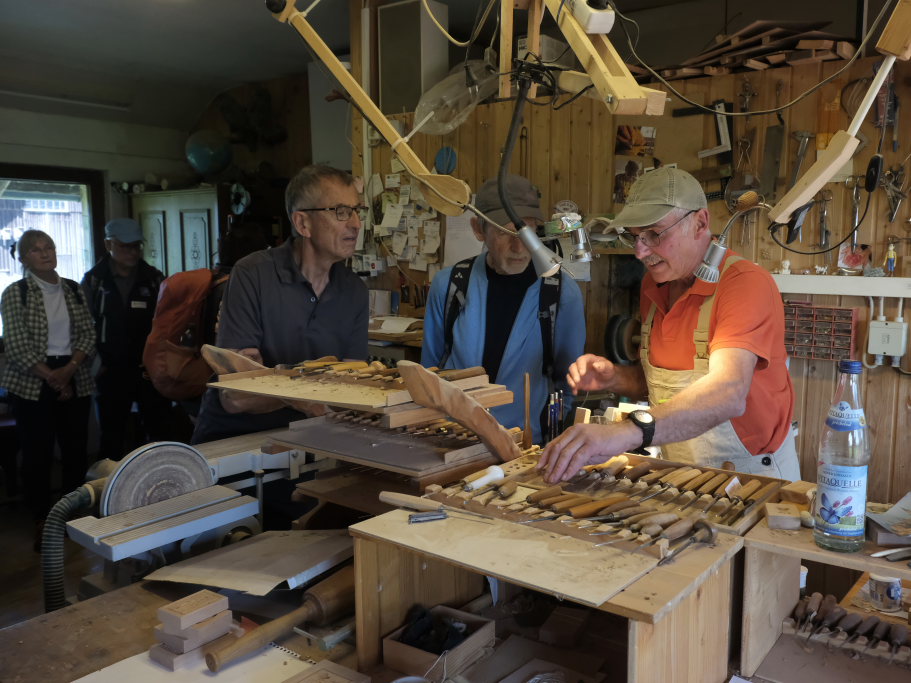 Ihr erster Weg führte die Gruppe zunächst zu dem nur wenige hundert Meter vom Wachbühl entfernt lebenden und arbeitenden Holzmodelschnitzer Leonhard Angele, dessen von außen unscheinbare Werkstatt bei Rad- oder Autotouren gerne übersehen werden würde. Dieser präsentierte während des halbstündigen Besuchs sein Können: Innerhalb von Minuten zauberte er aus einem Stück Holz ein einfaches Modelmotiv. Und klagte darüber, dass es in diesem wunderschönen Beruf keinen Nachwuchs mehr gibt. Früher habe er noch ab und zu Praktikanten gehabt. Wie in anderen – nicht nur kreativen – Bereichen auch, müsse man „für die Sache brennen“, und das vermisse er heutzutage sehr.