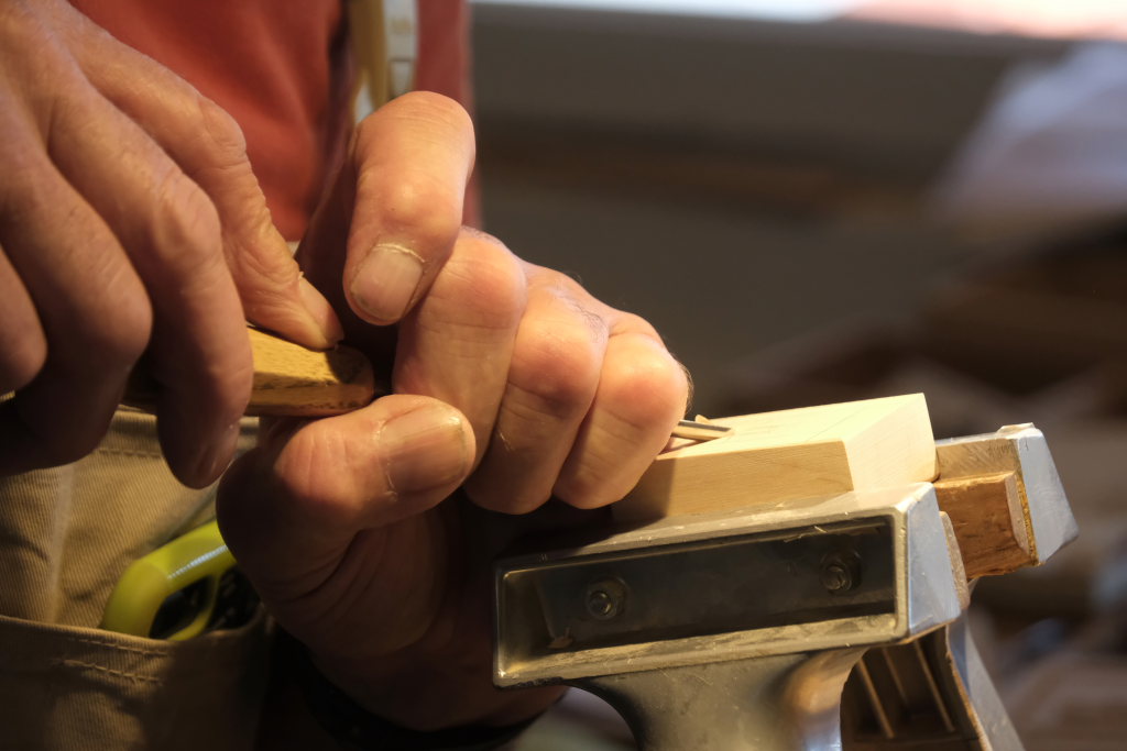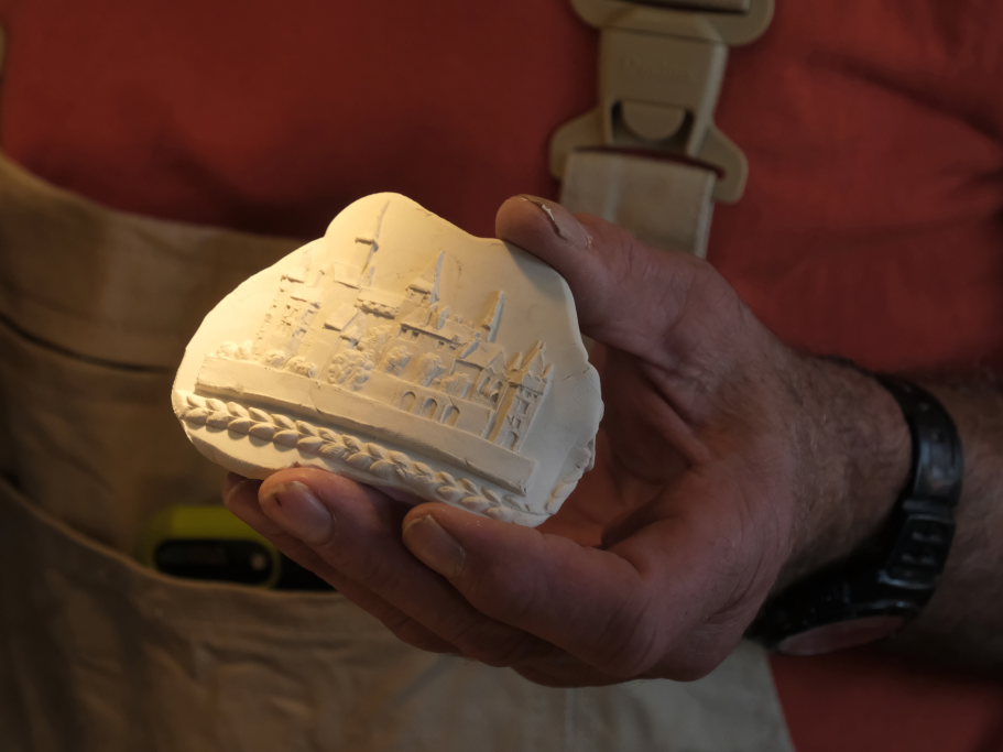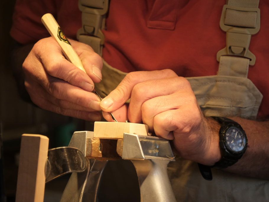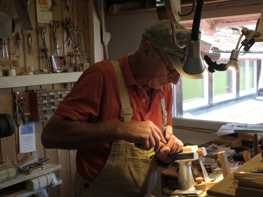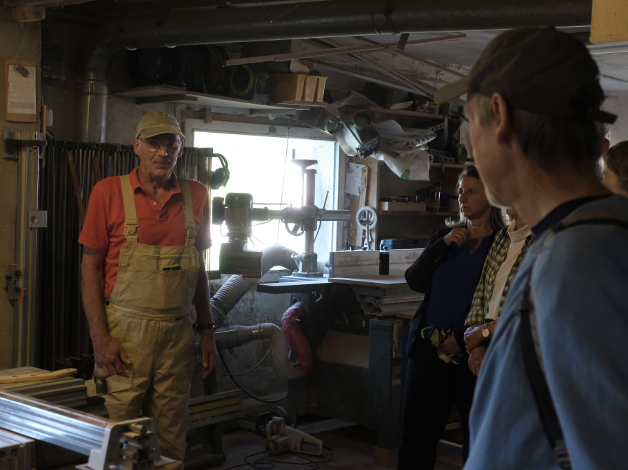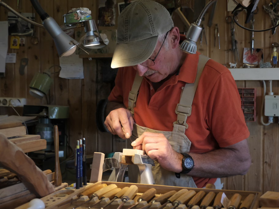 Ihr erster Weg führte die Gruppe zunächst zu dem nur wenige hundert Meter vom Wachbühl entfernt lebenden und arbeitenden Holzmodelschnitzer Leonhard Angele, dessen von außen unscheinbare Werkstatt bei Rad- oder Autotouren gerne übersehen werden würde. Dieser präsentierte während des halbstündigen Besuchs sein Können: Innerhalb von Minuten zauberte er aus einem Stück Holz ein einfaches Modelmotiv. Und klagte darüber, dass es in diesem wunderschönen Beruf keinen Nachwuchs mehr gibt. Früher habe er noch ab und zu Praktikanten gehabt. Wie in anderen – nicht nur kreativen – Bereichen auch, müsse man „für die Sache brennen“, und das vermisse er heutzutage sehr.