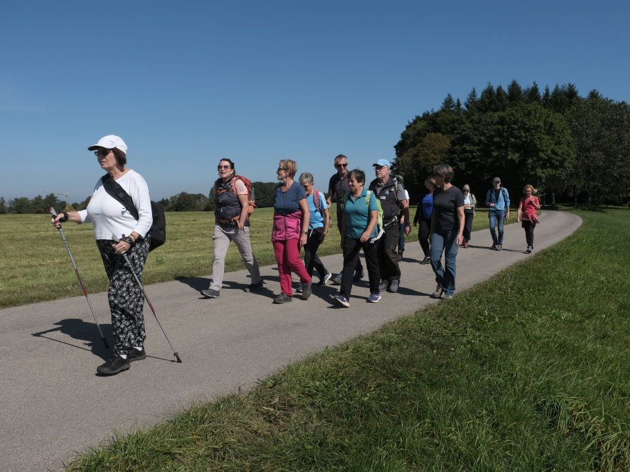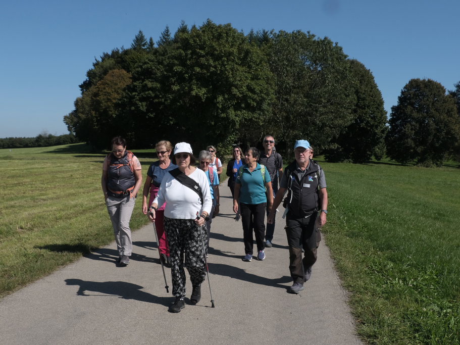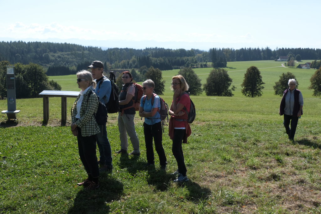 Von Gospoldshofen aus ging es wieder bergan, zum Ausguck auf das Säntismassiv. Doch war davon an diesem warmen Spätsommertag wenig zu sehen: Er hüllte sich, wie der Rest der Alpenkette, in einen Dunstschleier, kein Wunder, liegt doch davor der Bodensee, dessen Wassermassen zu entsprechender Verdunstung führen. Auf dem Weg durch den Stadtwald erzählte Peter Depfenhart einiges Interessantes zur Bewirtschaftung der dort gelegenen Weiher. Bei Albers öffnete sich dann wieder der Blick auf das Wurzacher Ried. Und entlang des Riedes führte der Weg dann wieder zurück zum Ausgangspunkt bei der Kurhaus-Kulturschmiede.