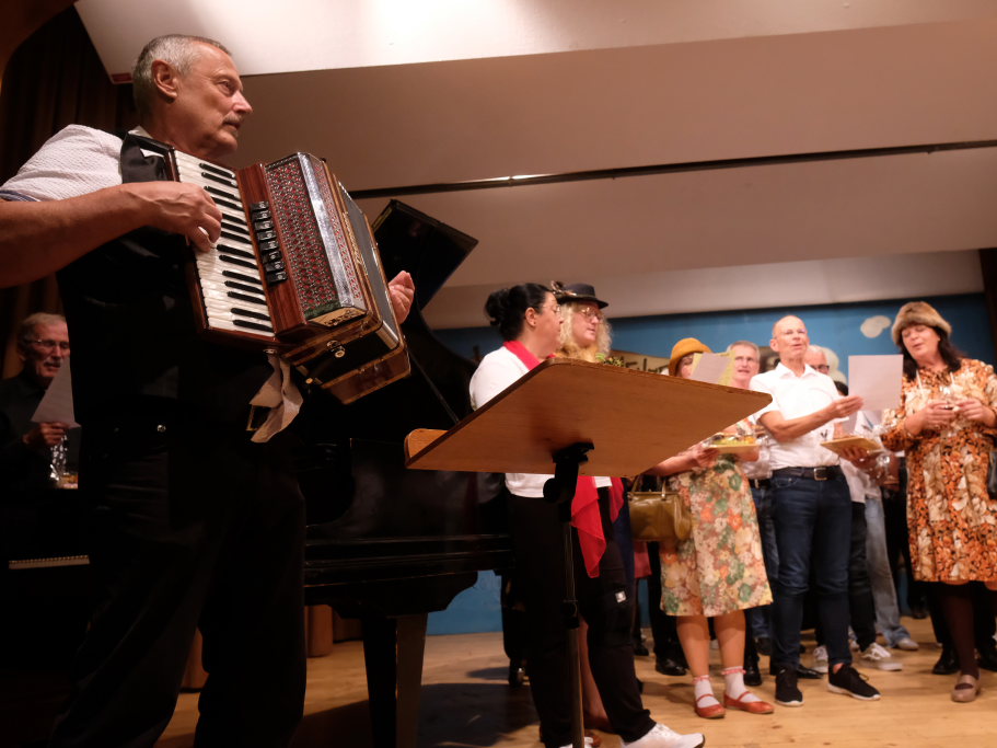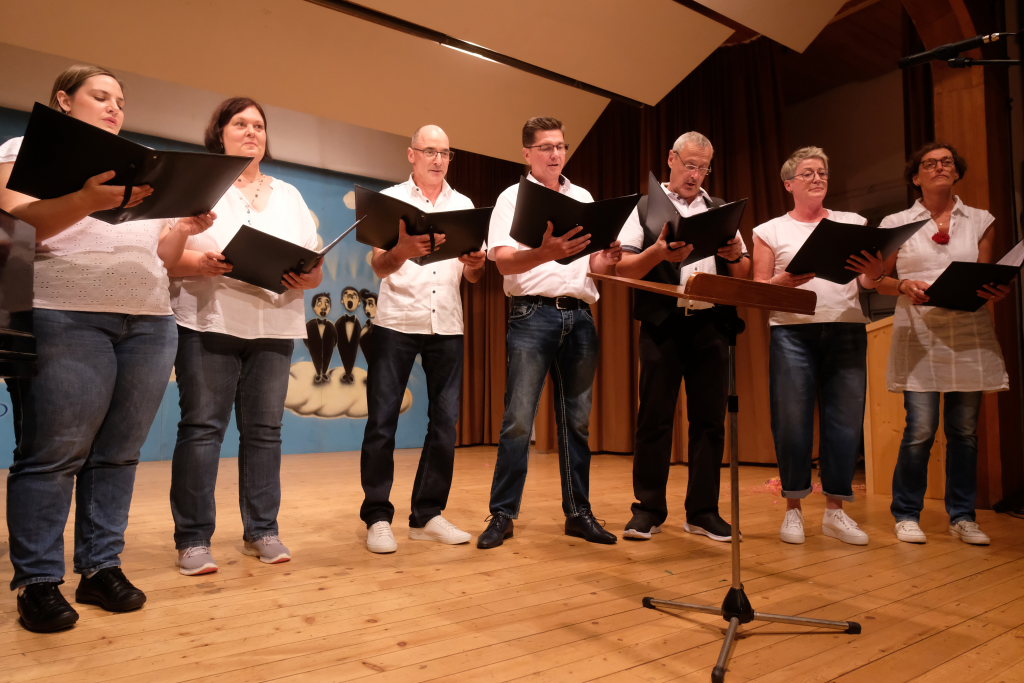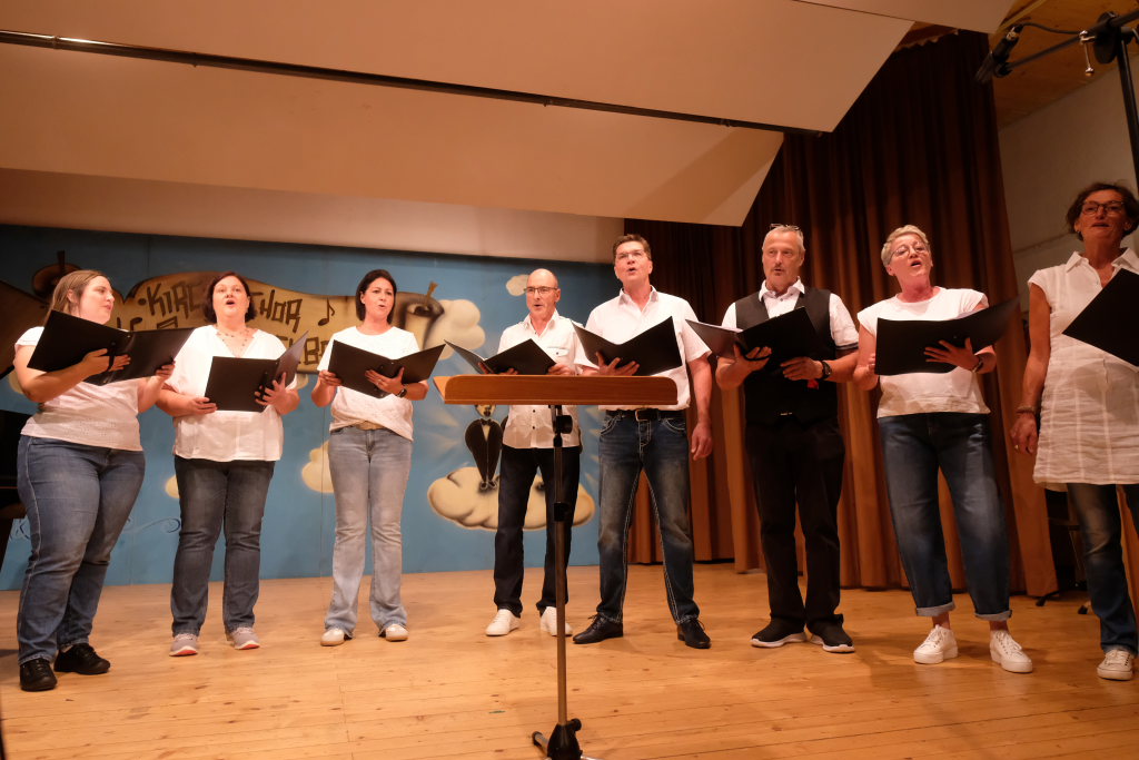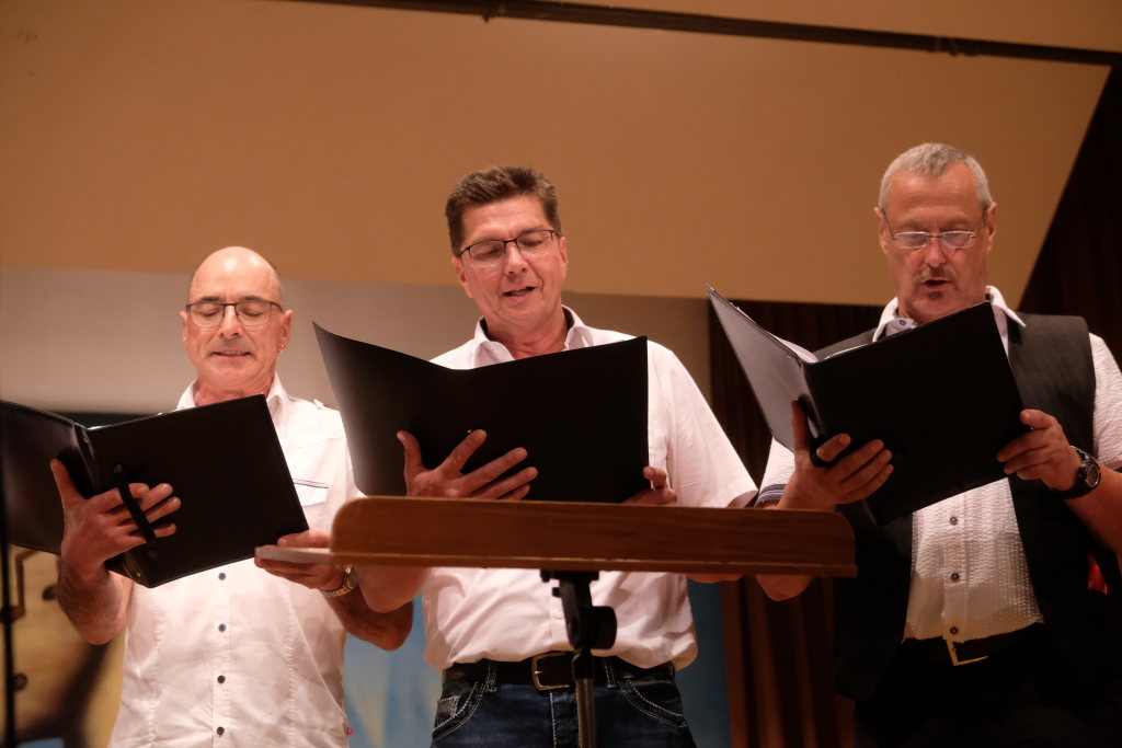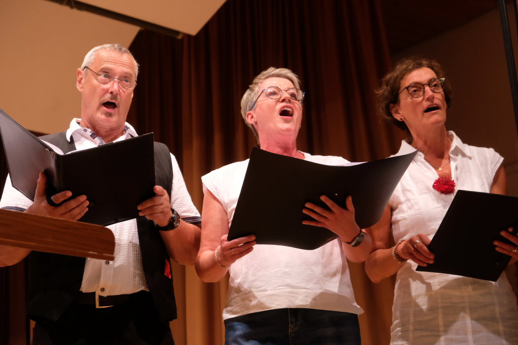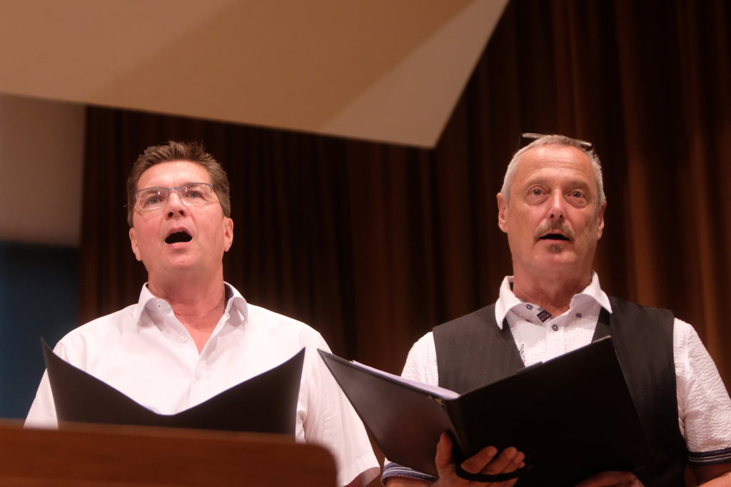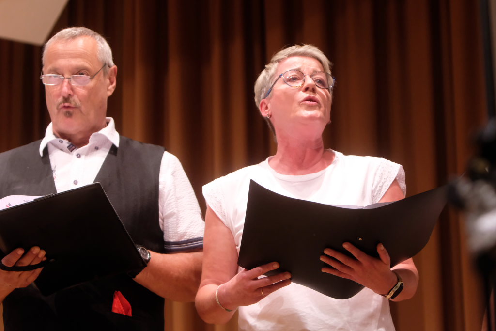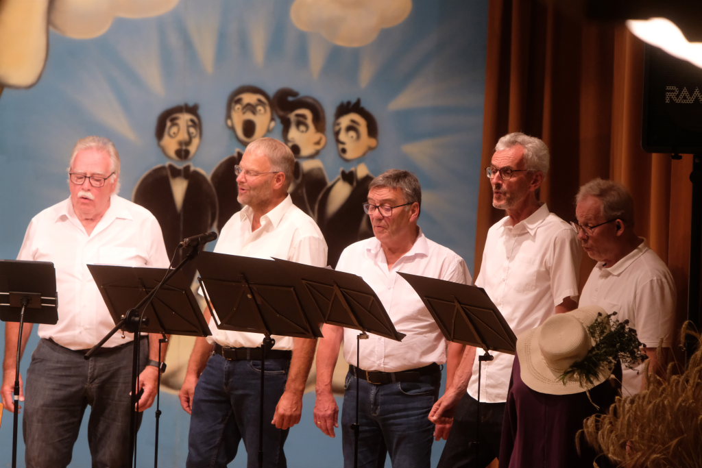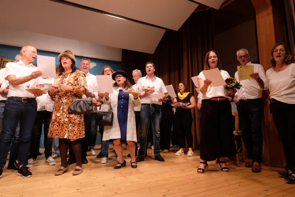 Tine Wespel und Günter Musch baten am Schluss alle Sängerinnen und Sänger, sich noch einmal auf der Bühne zu versammeln, um ein Präsent in Empfang zu nehmen. Aber vor allem auch, um gemeinsam mit dem Publikum „Heute hier, morgen dort“ von Hannes Wader zu singen. Und natürlich, um zum nächstjährigen A-Capella-Abend, der am 19. September 2026 stattfinden wird, einzuladen.