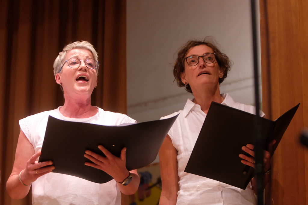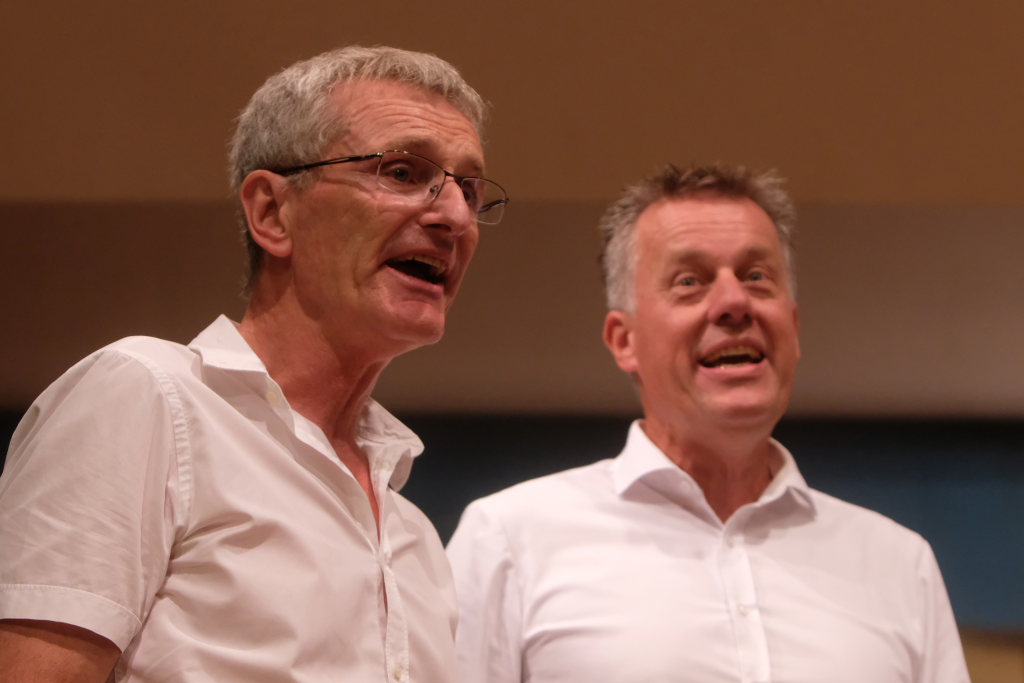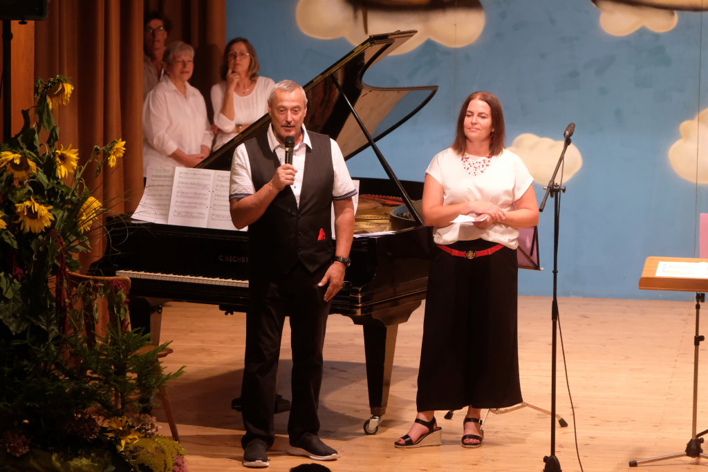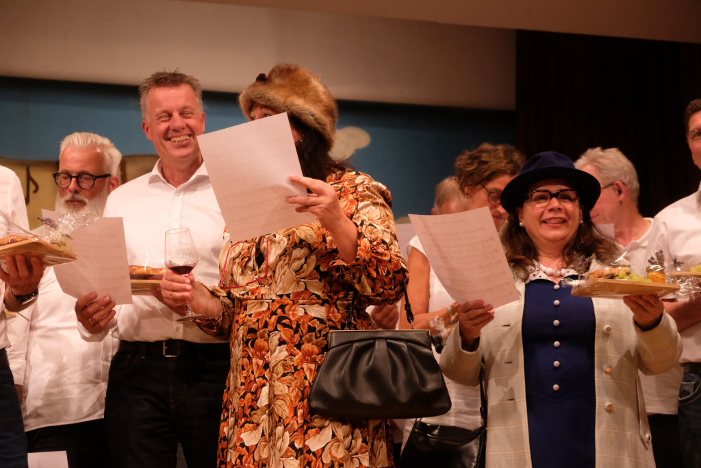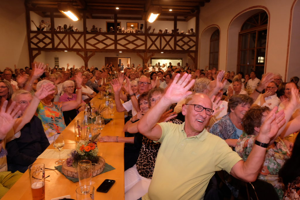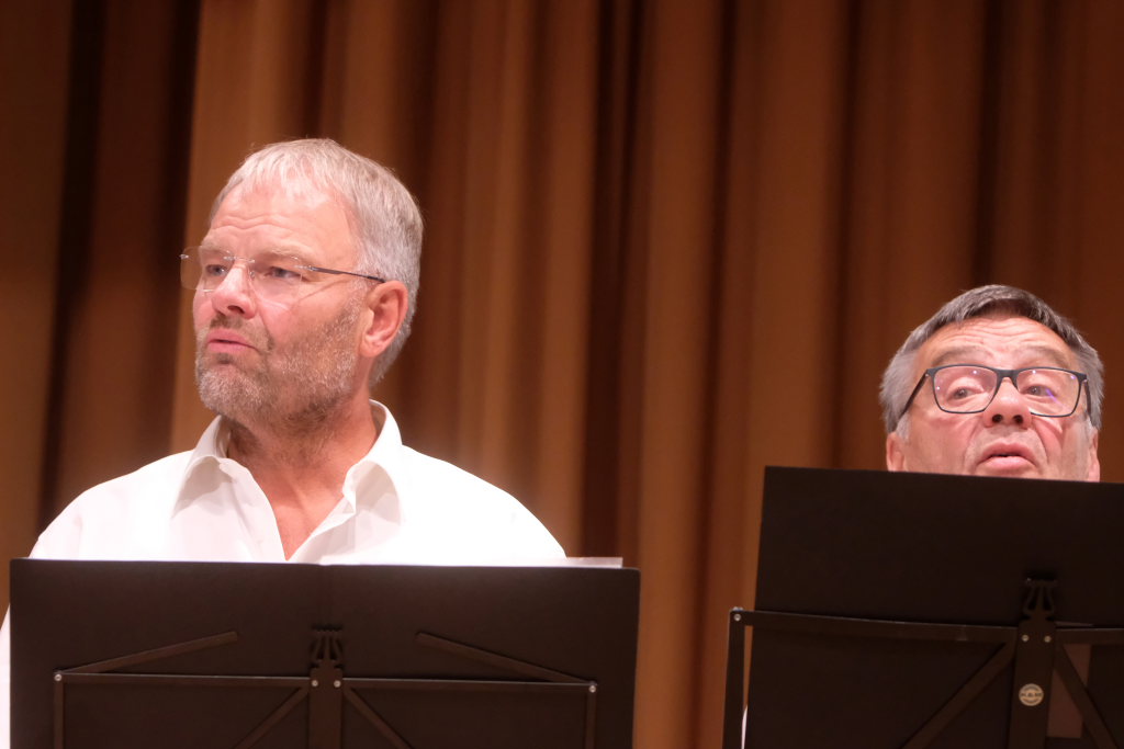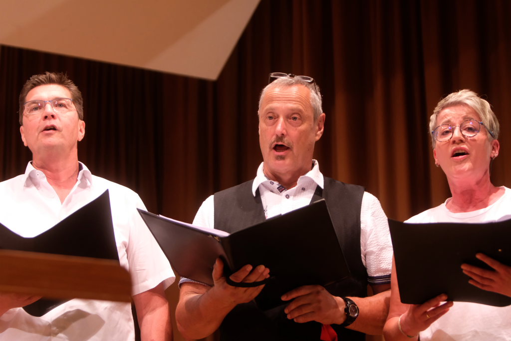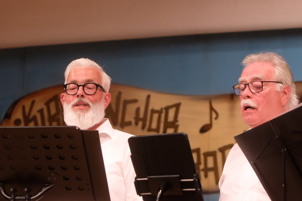 Tine Wespel und Günter Musch baten am Schluss alle Sängerinnen und Sänger, sich noch einmal auf der Bühne zu versammeln, um ein Präsent in Empfang zu nehmen. Aber vor allem auch, um gemeinsam mit dem Publikum „Heute hier, morgen dort“ von Hannes Wader zu singen. Und natürlich, um zum nächstjährigen A-Capella-Abend, der am 19. September 2026 stattfinden wird, einzuladen.
