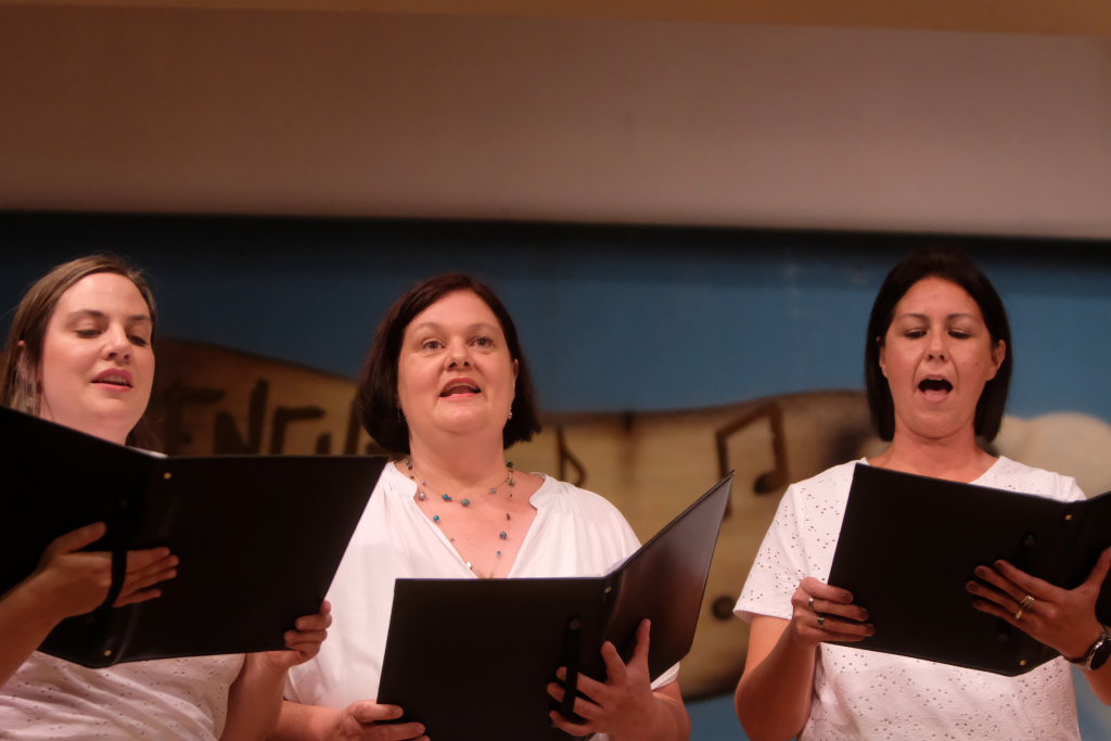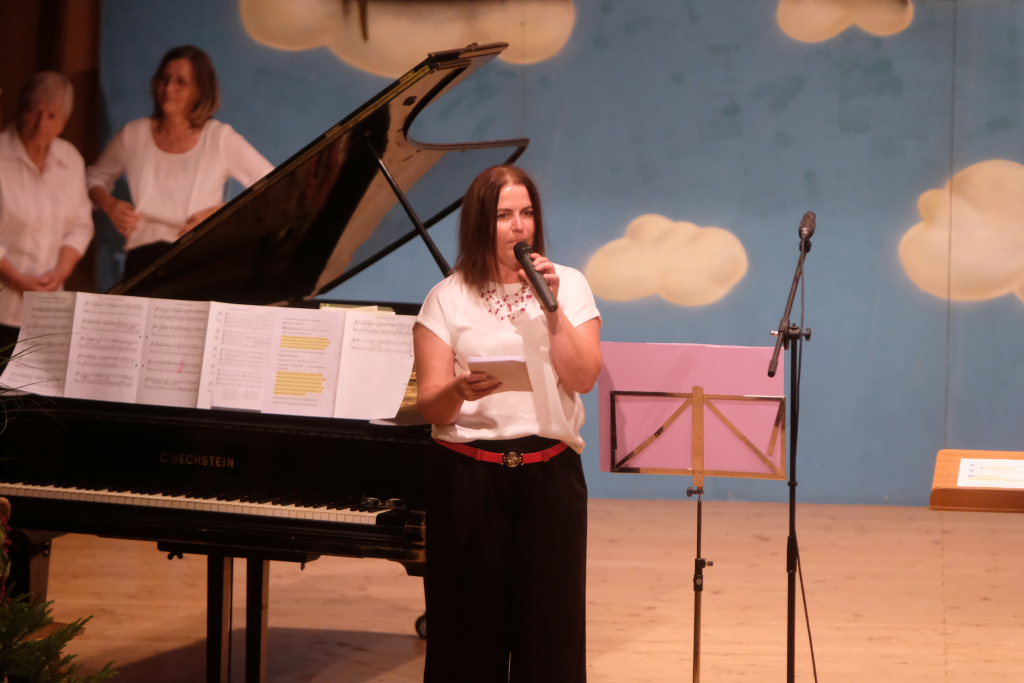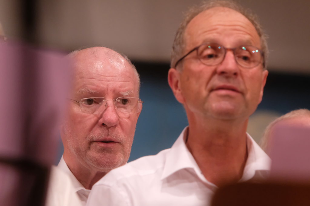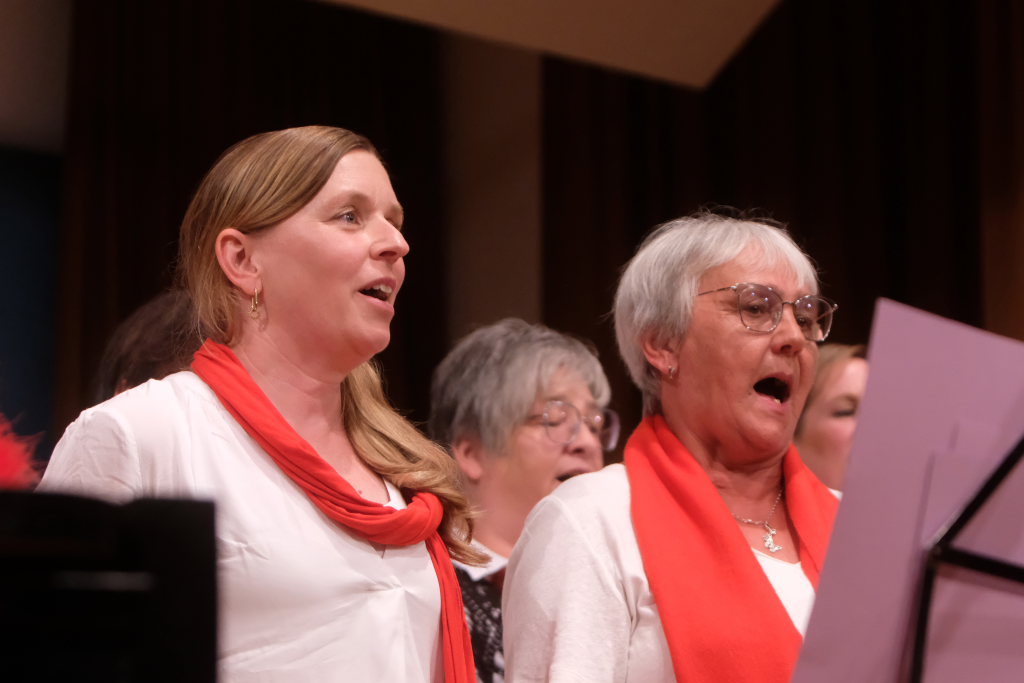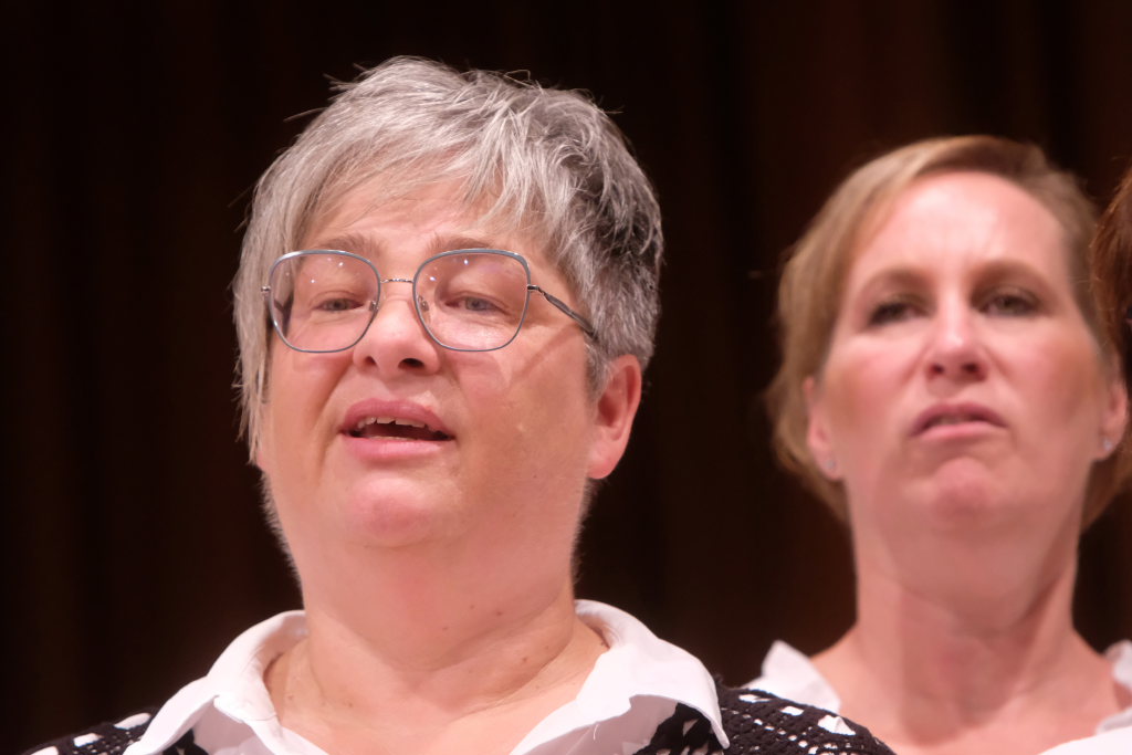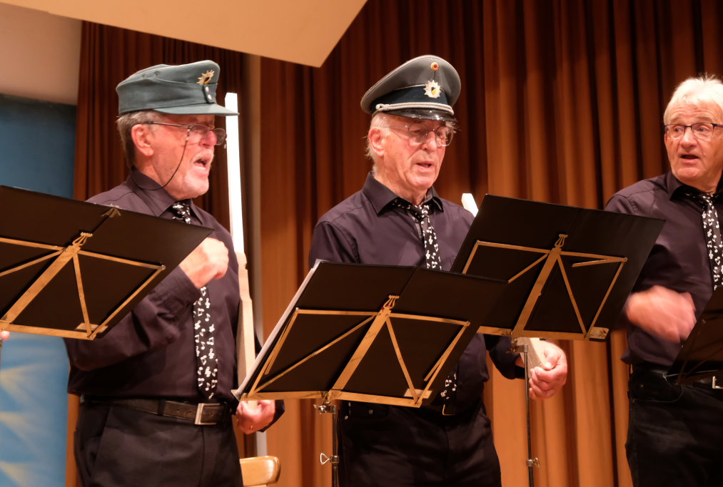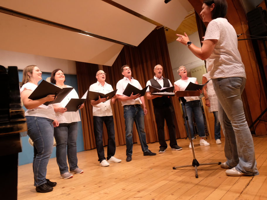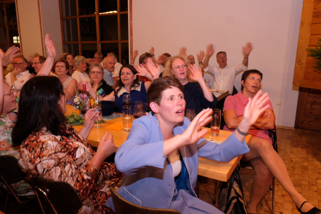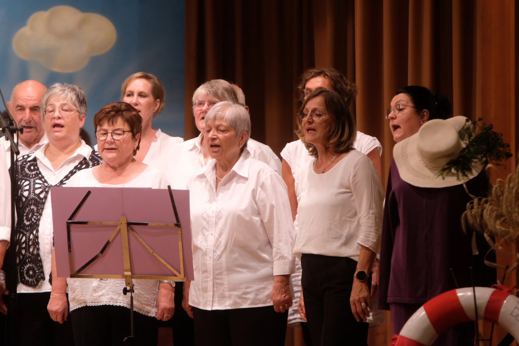 Tine Wespel und Günter Musch baten am Schluss alle Sängerinnen und Sänger, sich noch einmal auf der Bühne zu versammeln, um ein Präsent in Empfang zu nehmen. Aber vor allem auch, um gemeinsam mit dem Publikum „Heute hier, morgen dort“ von Hannes Wader zu singen. Und natürlich, um zum nächstjährigen A-Capella-Abend, der am 19. September 2026 stattfinden wird, einzuladen.