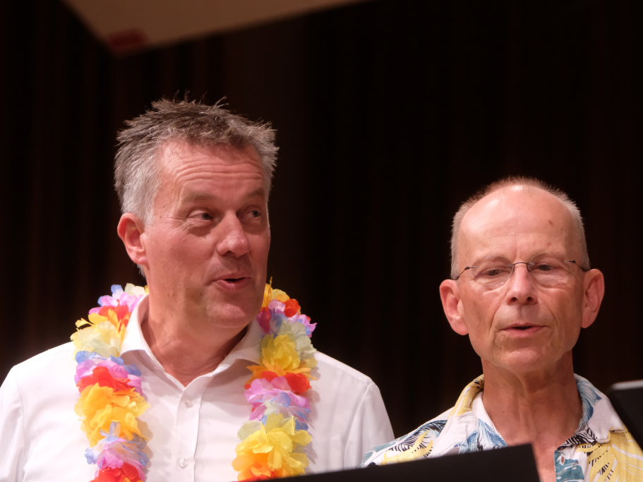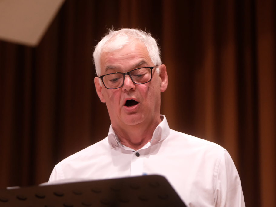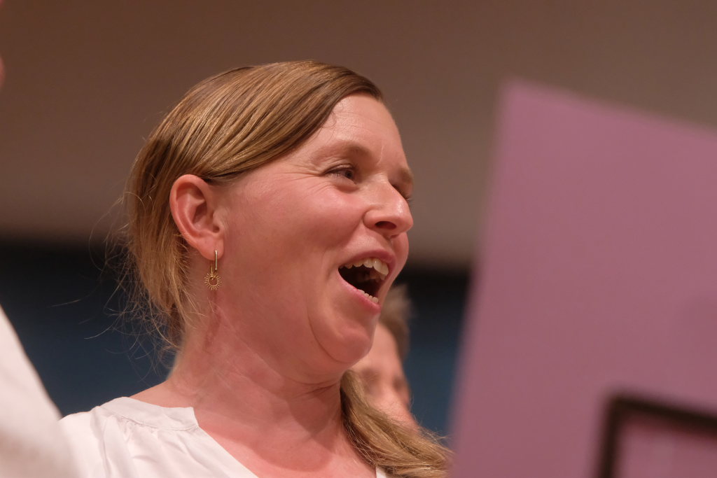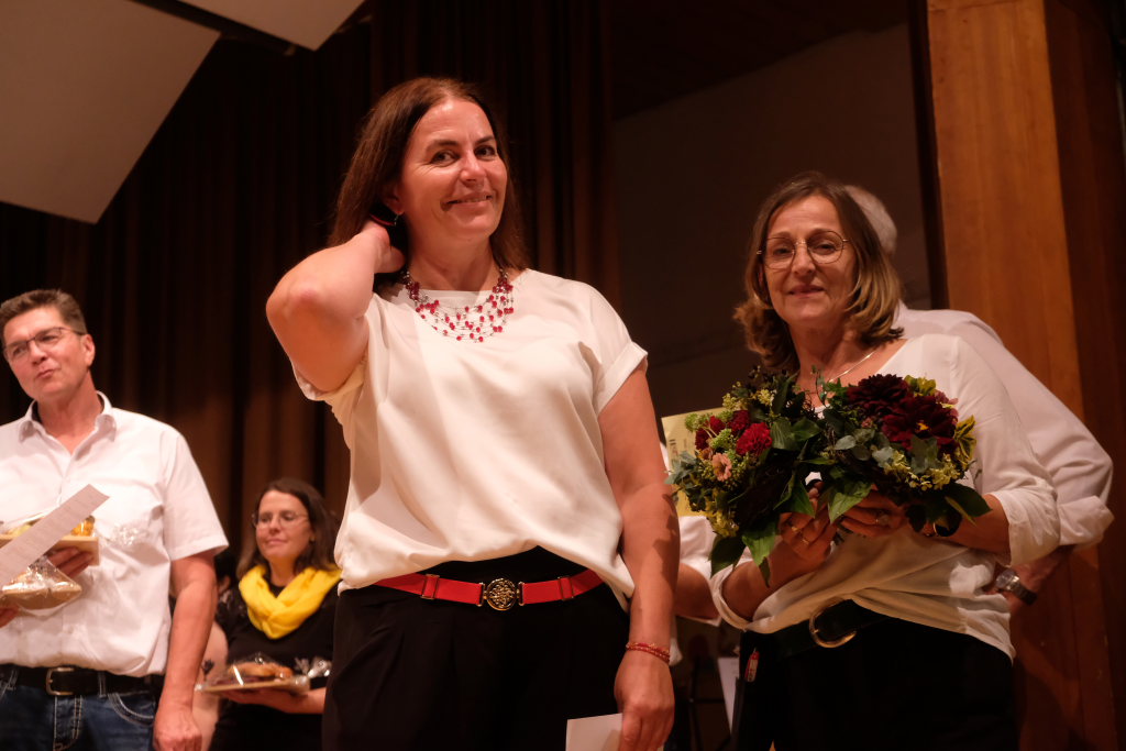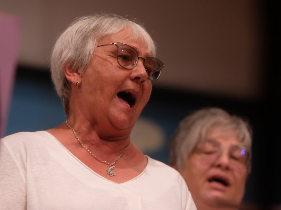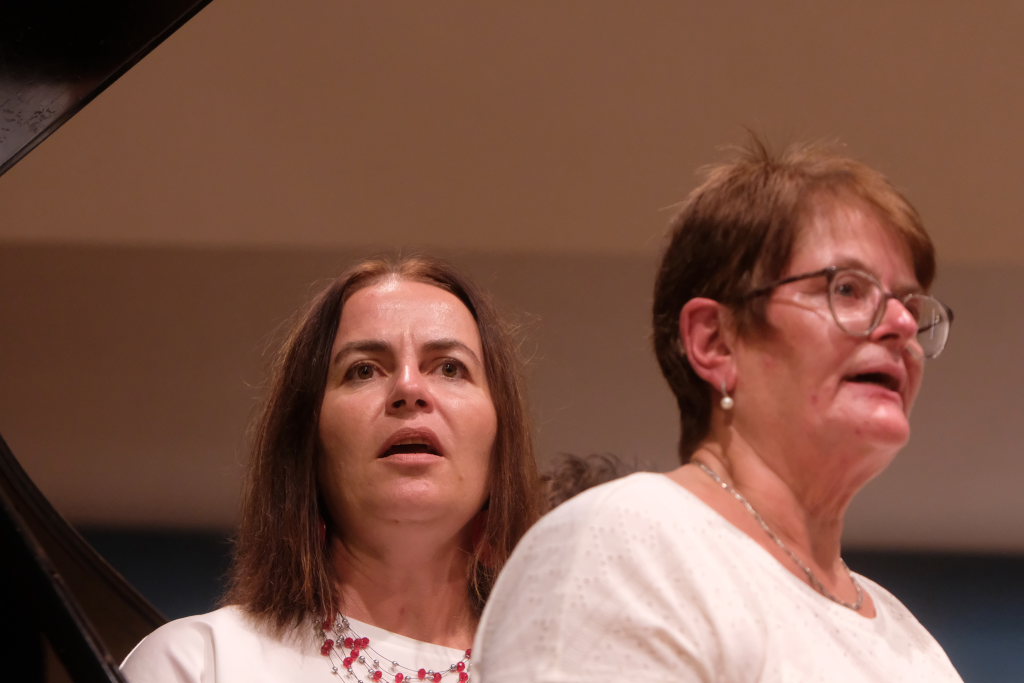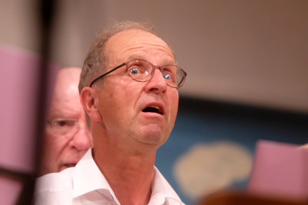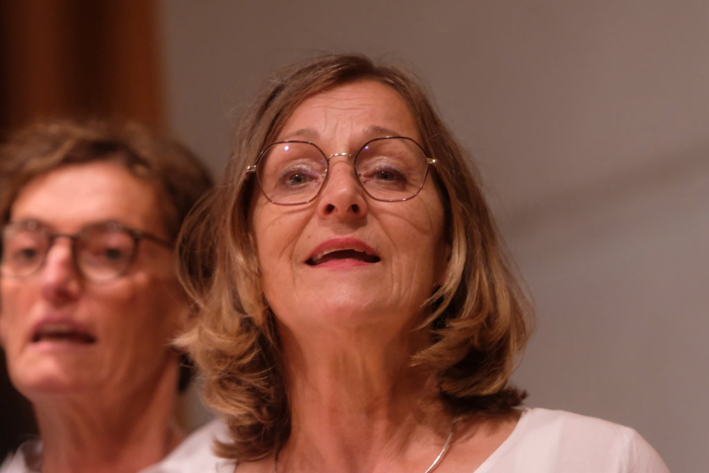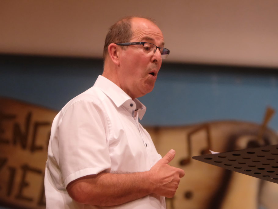 Tine Wespel und Günter Musch baten am Schluss alle Sängerinnen und Sänger, sich noch einmal auf der Bühne zu versammeln, um ein Präsent in Empfang zu nehmen. Aber vor allem auch, um gemeinsam mit dem Publikum „Heute hier, morgen dort“ von Hannes Wader zu singen. Und natürlich, um zum nächstjährigen A-Capella-Abend, der am 19. September 2026 stattfinden wird, einzuladen.