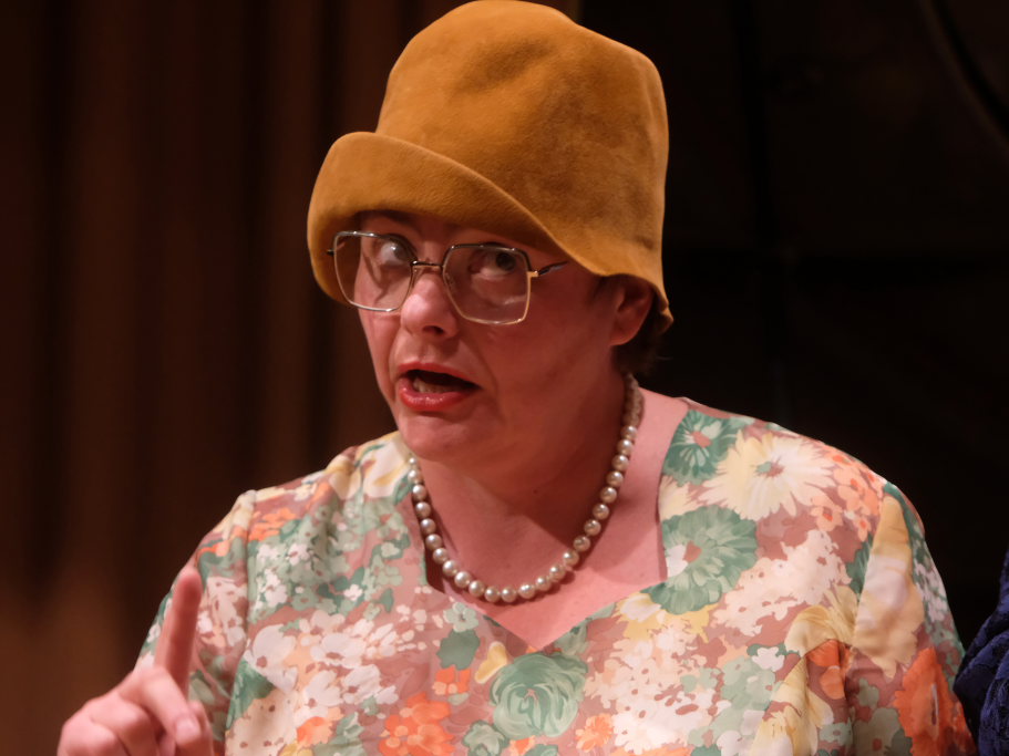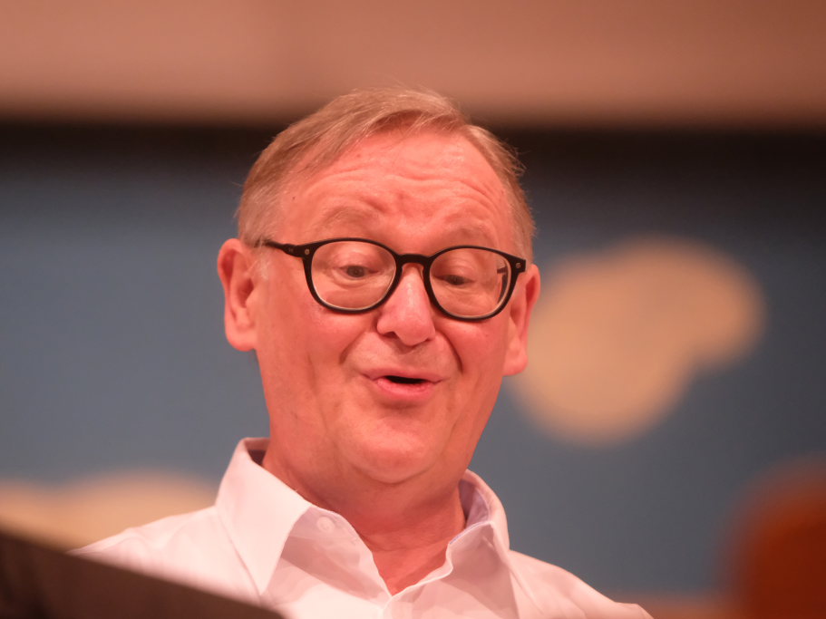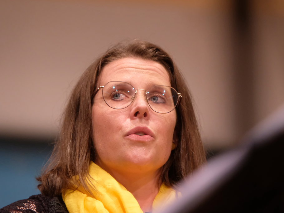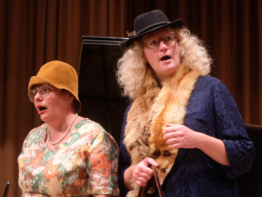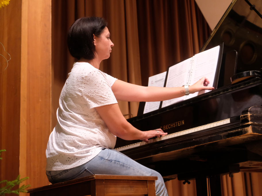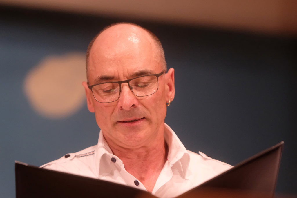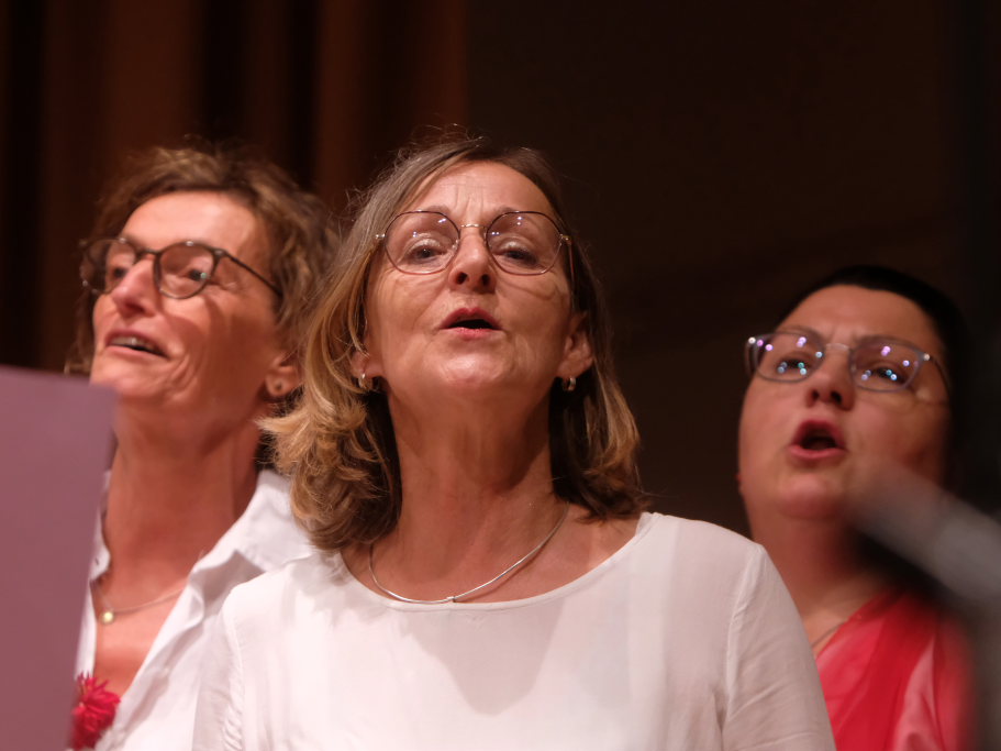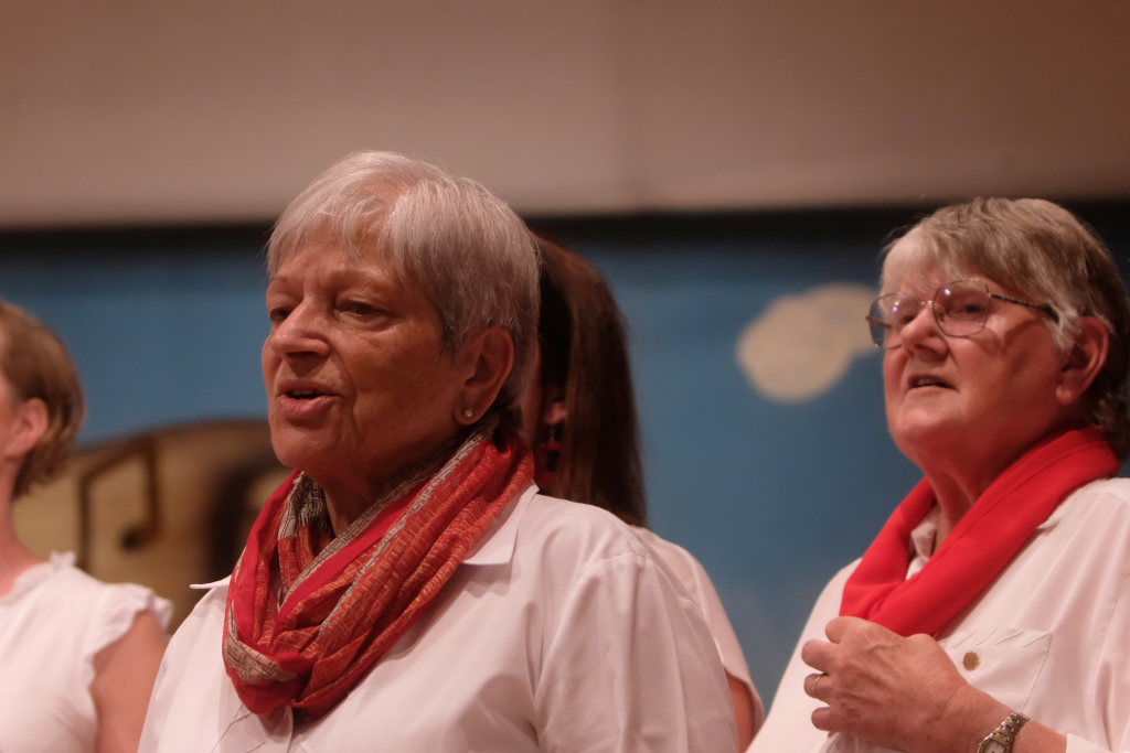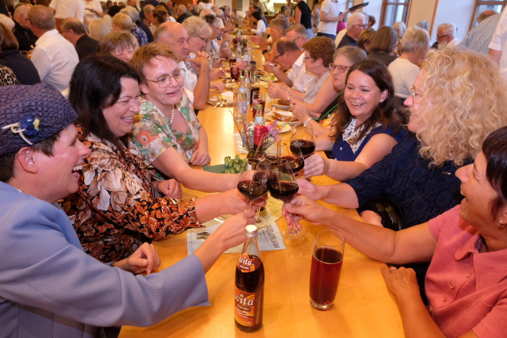 Tine Wespel und Günter Musch baten am Schluss alle Sängerinnen und Sänger, sich noch einmal auf der Bühne zu versammeln, um ein Präsent in Empfang zu nehmen. Aber vor allem auch, um gemeinsam mit dem Publikum „Heute hier, morgen dort“ von Hannes Wader zu singen. Und natürlich, um zum nächstjährigen A-Capella-Abend, der am 19. September 2026 stattfinden wird, einzuladen.