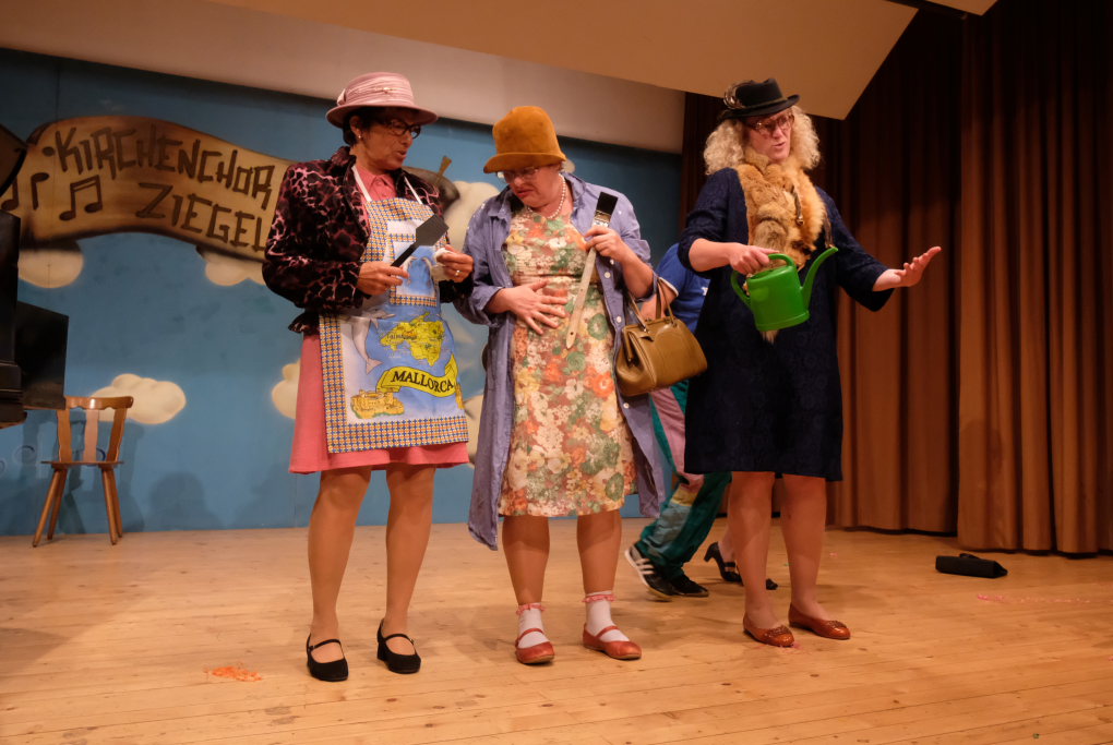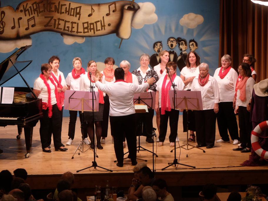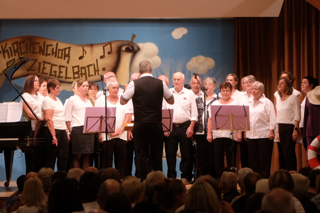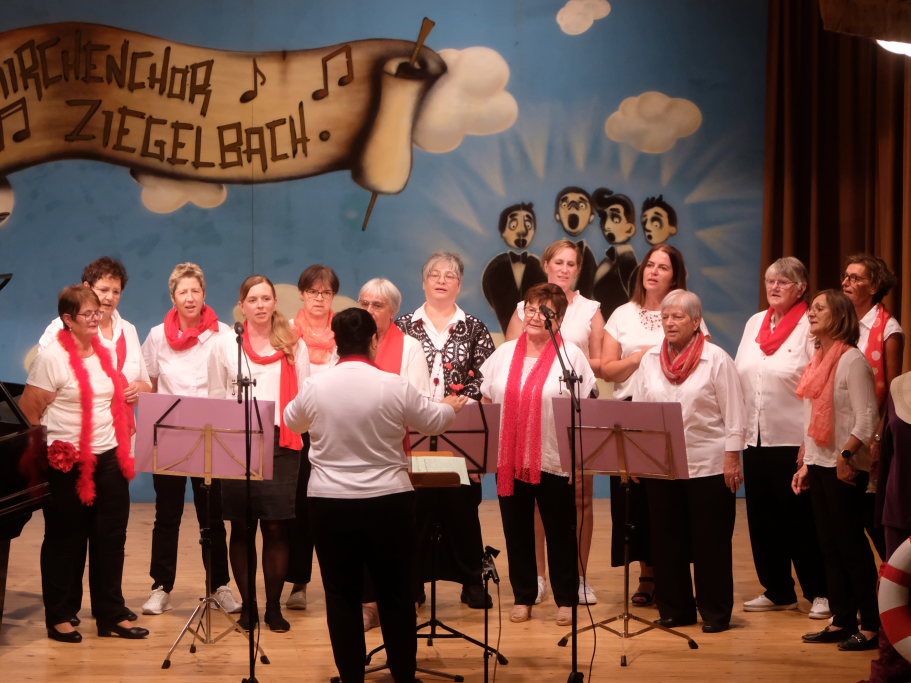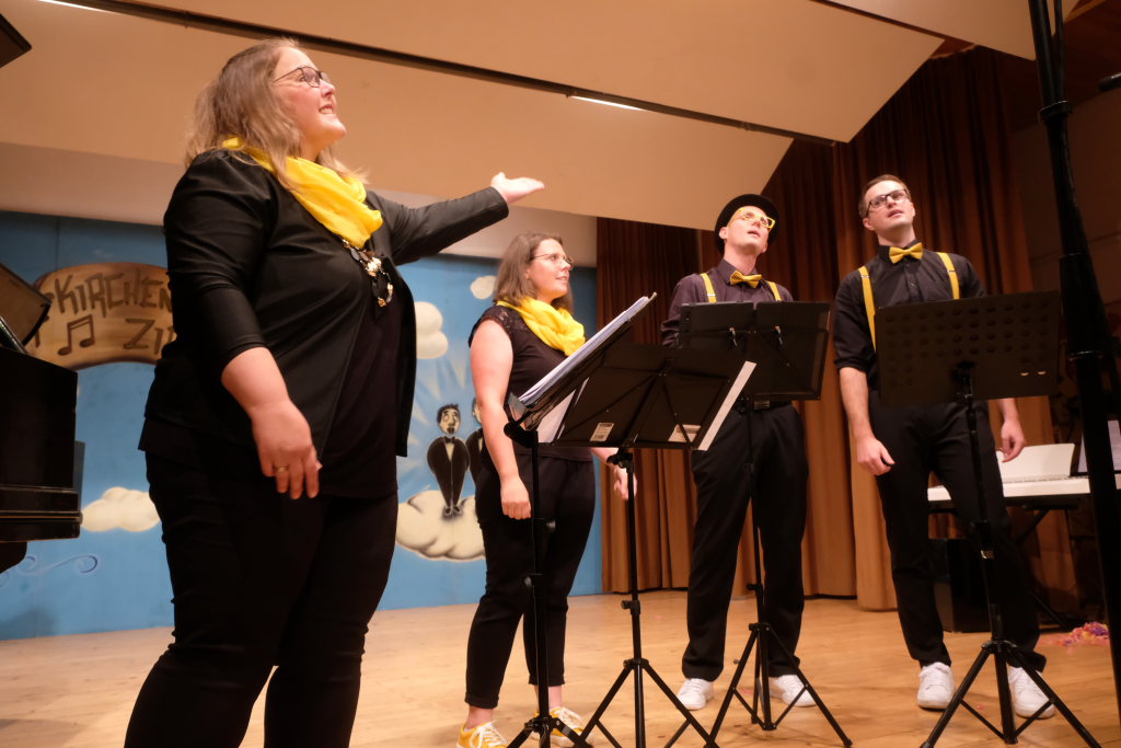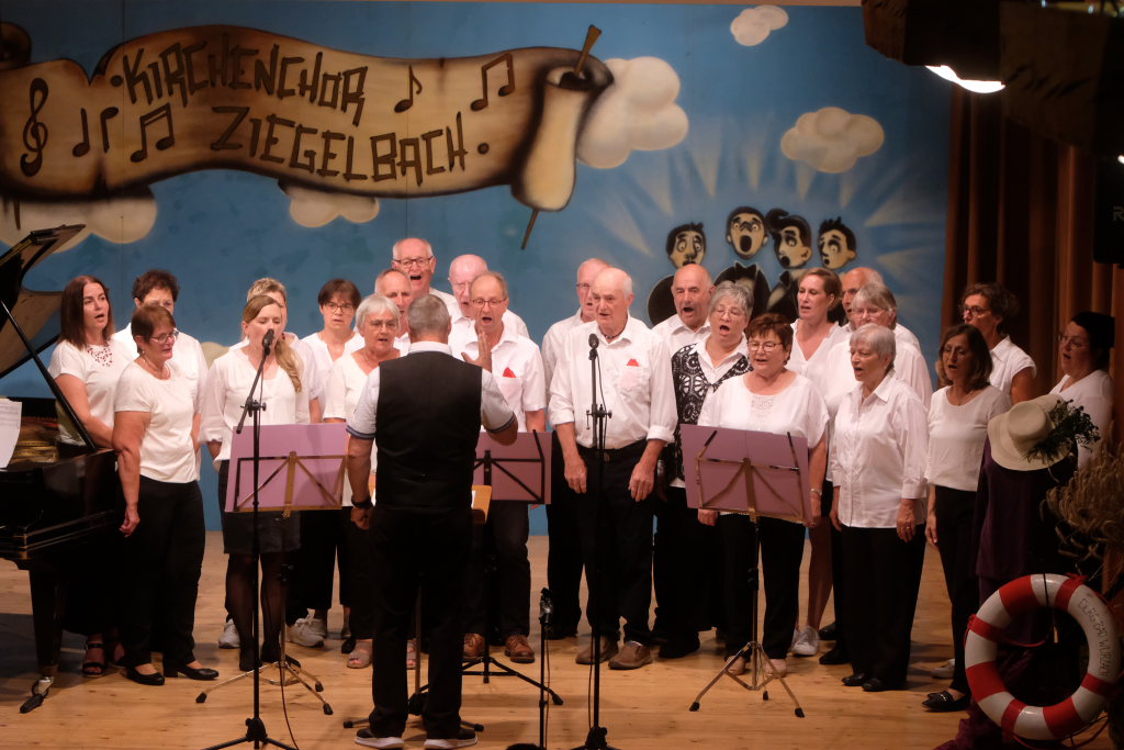 Beim diesjährigen Jubiläums-A-Capella Abend konnte Vorständin Tine Wespel, die wieder gemeinsam mit Dirigent Günter Musch durchs Programm führte, sieben Gruppen auf der Bühne begrüßen: Es waren dies neben dem gastgebenden Kirchenchor Ziegelbach, die ‘Singing men Group’ aus Kisslegg, die ‘Dilldappa’ aus Bad Wurzach, das Männerquartett ‘ChaRRmant’ aus Bad Schussenried und der ‘VierAgsang’ aus Ziegelbach. Das Männerensemble ‘GIS’ (‘Gut in Schuss’ oder ‘Ganz in Schwarz’?) aus Wurmlingen hatte im letzten Jahr seine Ziegelbach-Premiere gefeiert, während die (alt)bekannten Damen der Comedy-Truppe von ‘Halba drui’ aus Unteropfingen sich bereits zum x-ten Mal beim A-Capella-Abend die Ehre gaben.