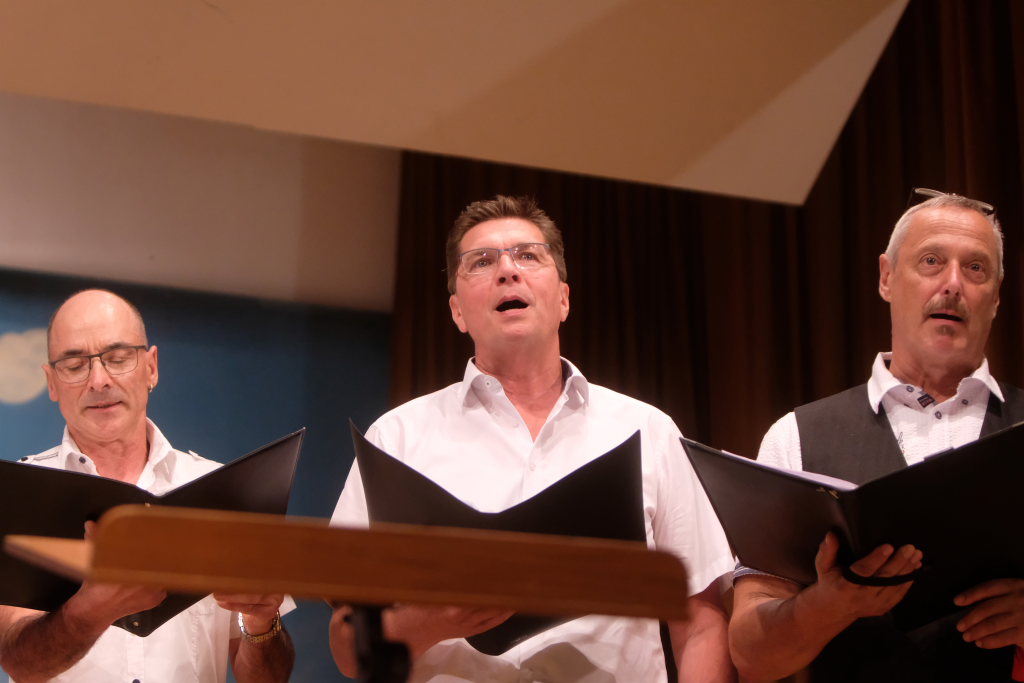 Ihnen folgten die ‘Dilldappa’, bei denen auch Günter Musch mit zur Notenmappe griff. Sie starteten mit „Barbara Ann“ von den Beach Boys in ihren ersten Auftritt des Abends. Danach begeisterten sie den Saal mit dem Liebeslied „Only You“, das in der A-Capella-Version der Flying Pickets zum Welthit geworden war.