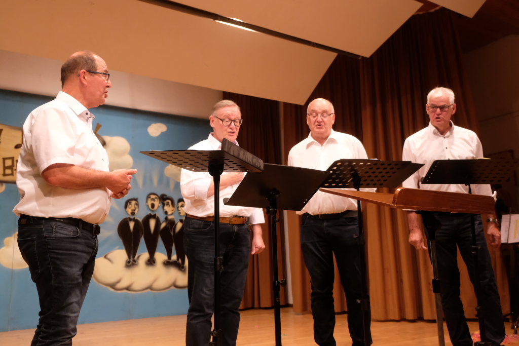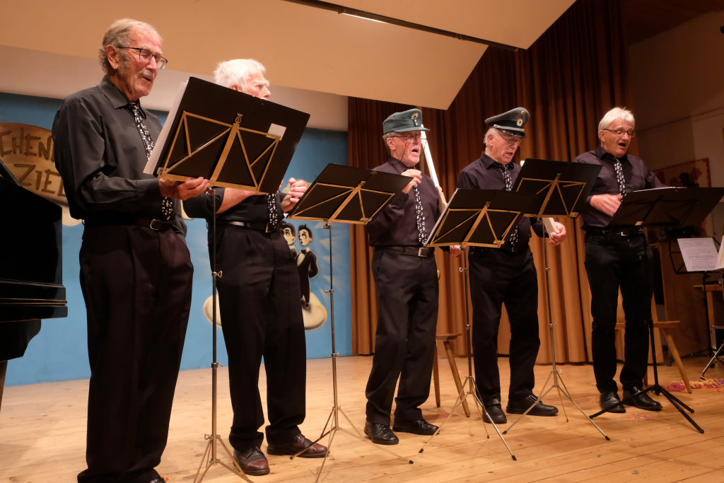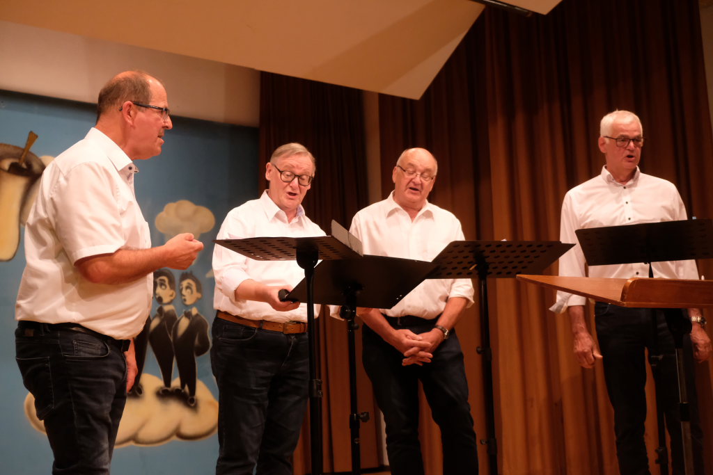 Dass auch die Gruppe ‘VierAgsang’ nicht ohne Zugabe von der Bühne gelassen würde war nach dem mit schwäbischen Texten versehen “‘Let it be” klar. Doch bei ihrem selbst arrangierten Schlagermedley mit den Titel-Melodien verschiedenster Fernsehserien, die allerdings, um im Bild zu bleiben nicht synchron liefen: Wickie bekam z.B. den Text von Biene Maya usw… Für das Publikum natürlich eine Mordsgaudi.