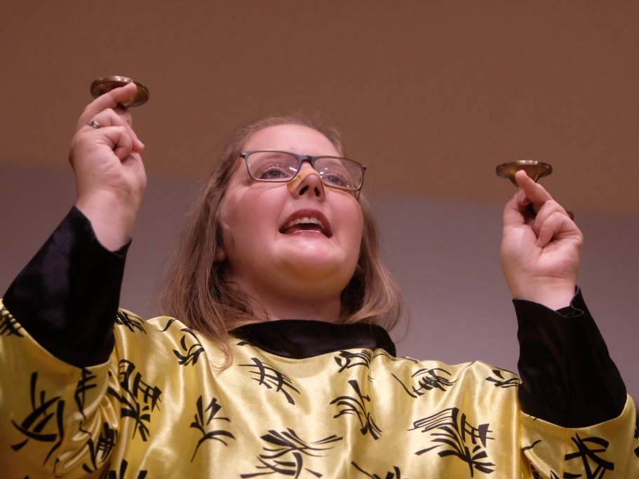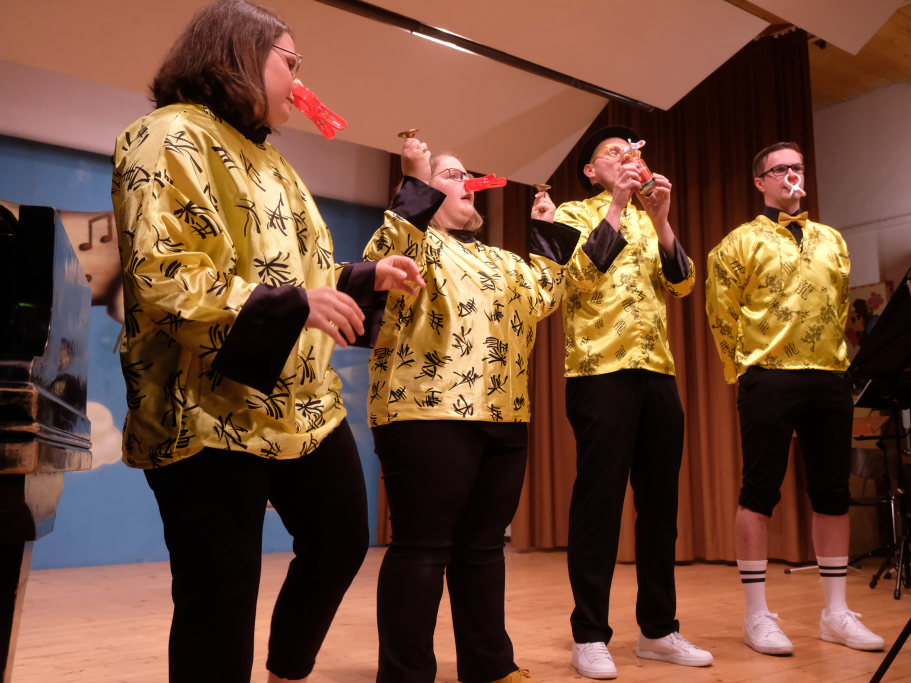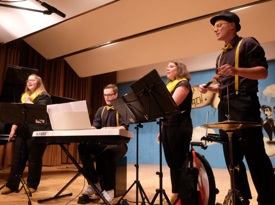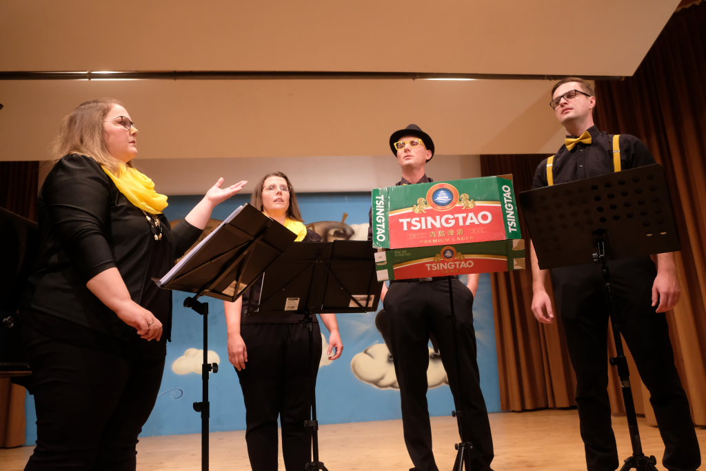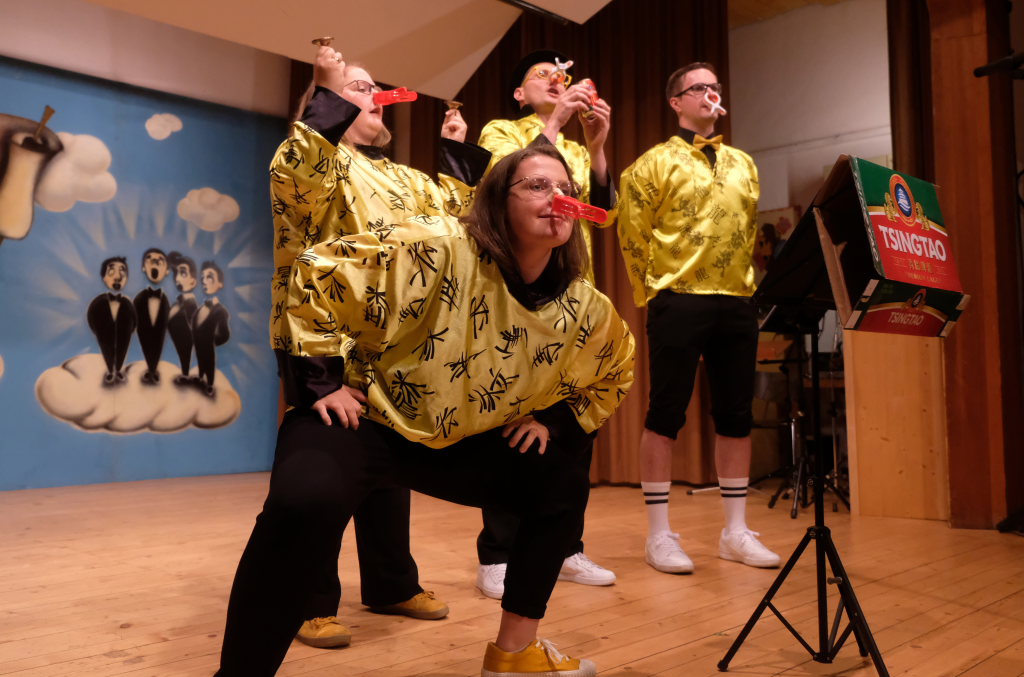 Direkt aus Ziegelbach waren die Akteurinnen und Akteure der nächsten Gruppe: Der ‘VierAgsang’ ist eine Gruppe junger MusikerInnen, die beim A-capella-Abend inzwischen schon zum lebenden Inventar gehören. Mit „Tsingtao“ priesen sie einen Zaubertrank an, in Mandarin-Gewändern, mit Nasen-Klammer und exklusiven Instrumenten. Mit dem eher besinnlichen „Amazing Grace“ in der A-Capella-Version von Pentatonix wußten die Vier aber ebenso zu begeistern wie im eher komödiantischen Tsingtao.