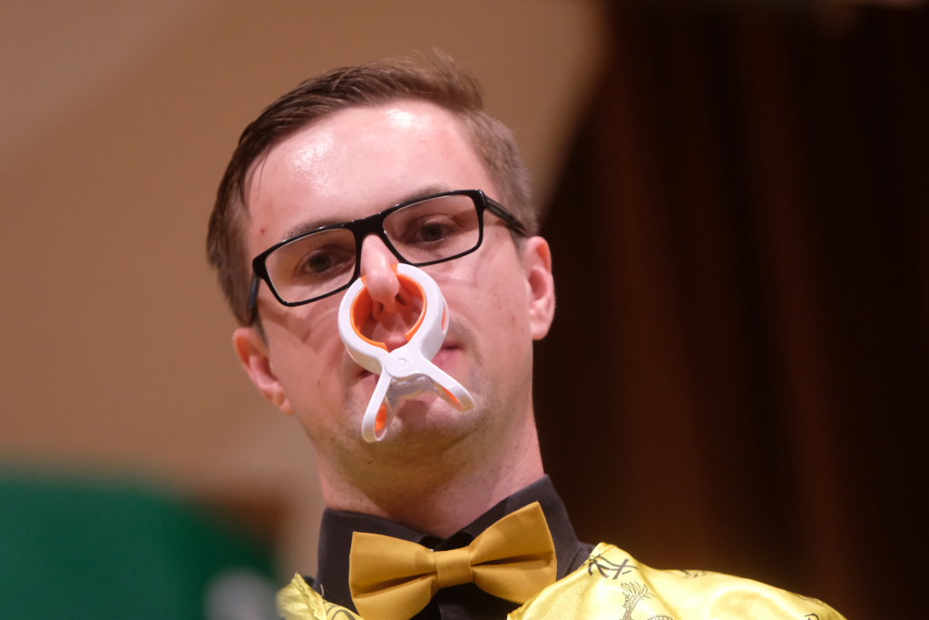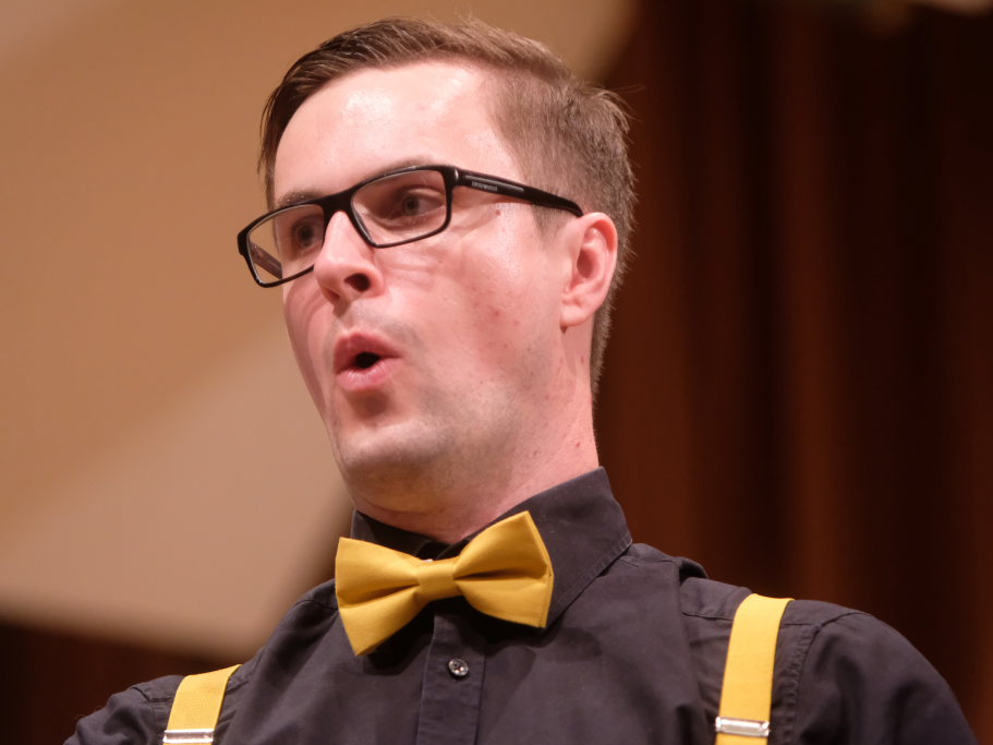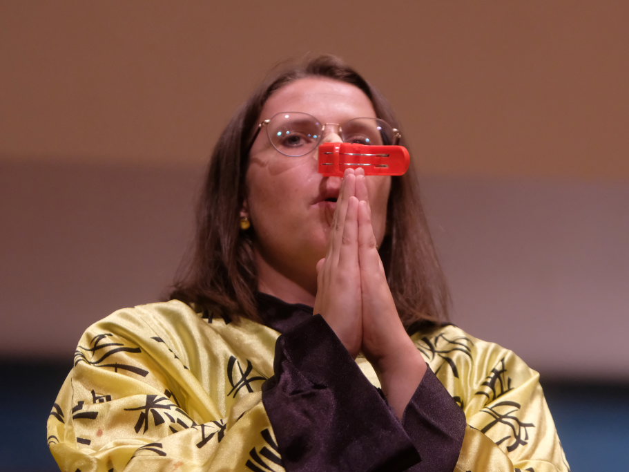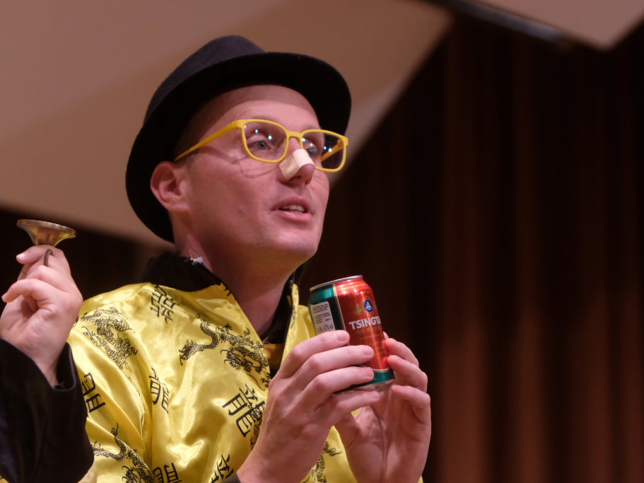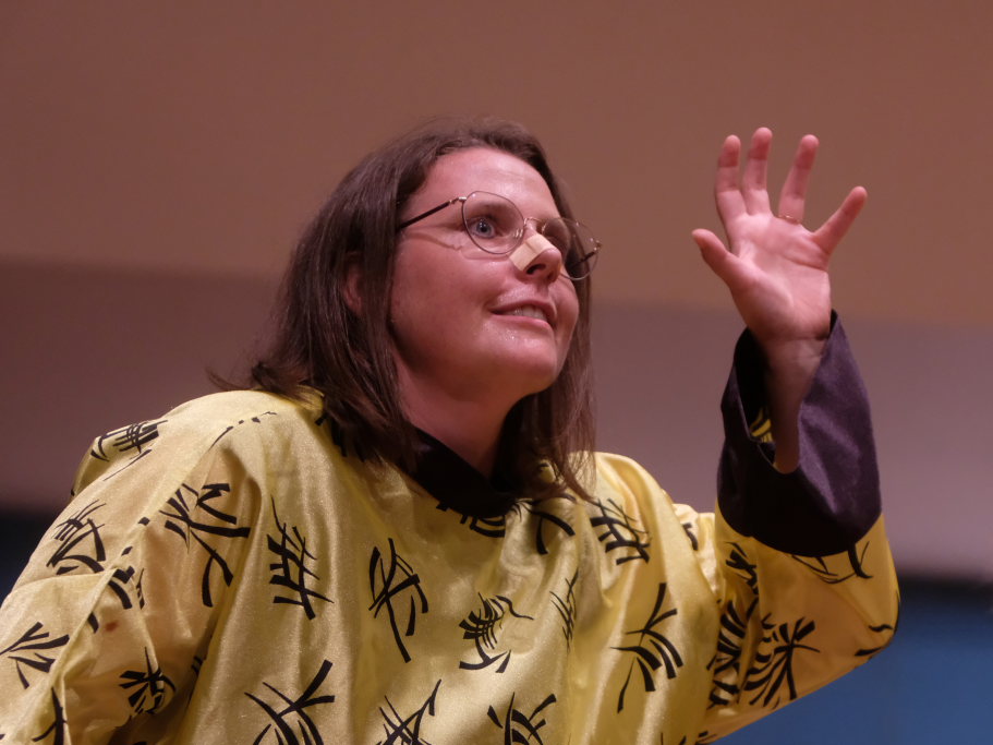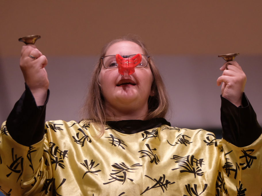 Direkt aus Ziegelbach waren die Akteurinnen und Akteure der nächsten Gruppe: Der ‘VierAgsang’ ist eine Gruppe junger MusikerInnen, die beim A-capella-Abend inzwischen schon zum lebenden Inventar gehören. Mit „Tsingtao“ priesen sie einen Zaubertrank an, in Mandarin-Gewändern, mit Nasen-Klammer und exklusiven Instrumenten. Mit dem eher besinnlichen „Amazing Grace“ in der A-Capella-Version von Pentatonix wußten die Vier aber ebenso zu begeistern wie im eher komödiantischen Tsingtao.
