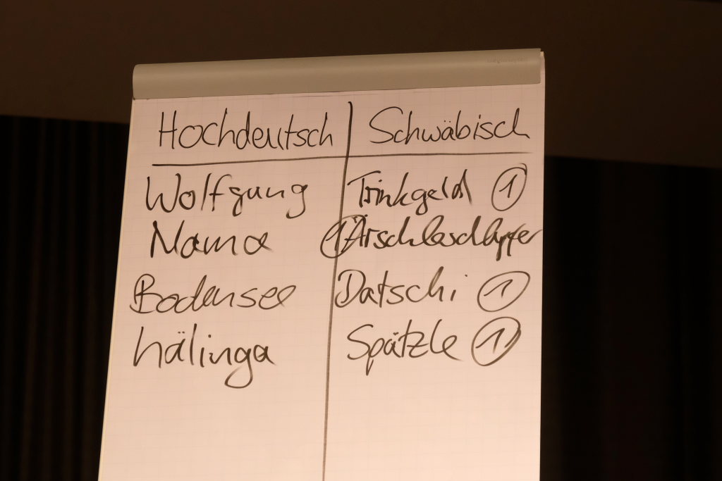 Mit solchen Bonmots zum Schwabentum eröffnete Heyer seinen Kurs „Schwäbisch für Einsteiger“: Wo die Suppe noch in die Soße gedunkt wird, wo der Ranza „an der Front“ getragen wird anstatt auf em Buckel und wo unsere Eltern den Kindern zum Einschlafen aus Sparbüchern vorgelesen haben, ja da zeigt sich :„Der Dialekt hot halt en reata Charme, do wird’s oim ums Herz ganz warm.“