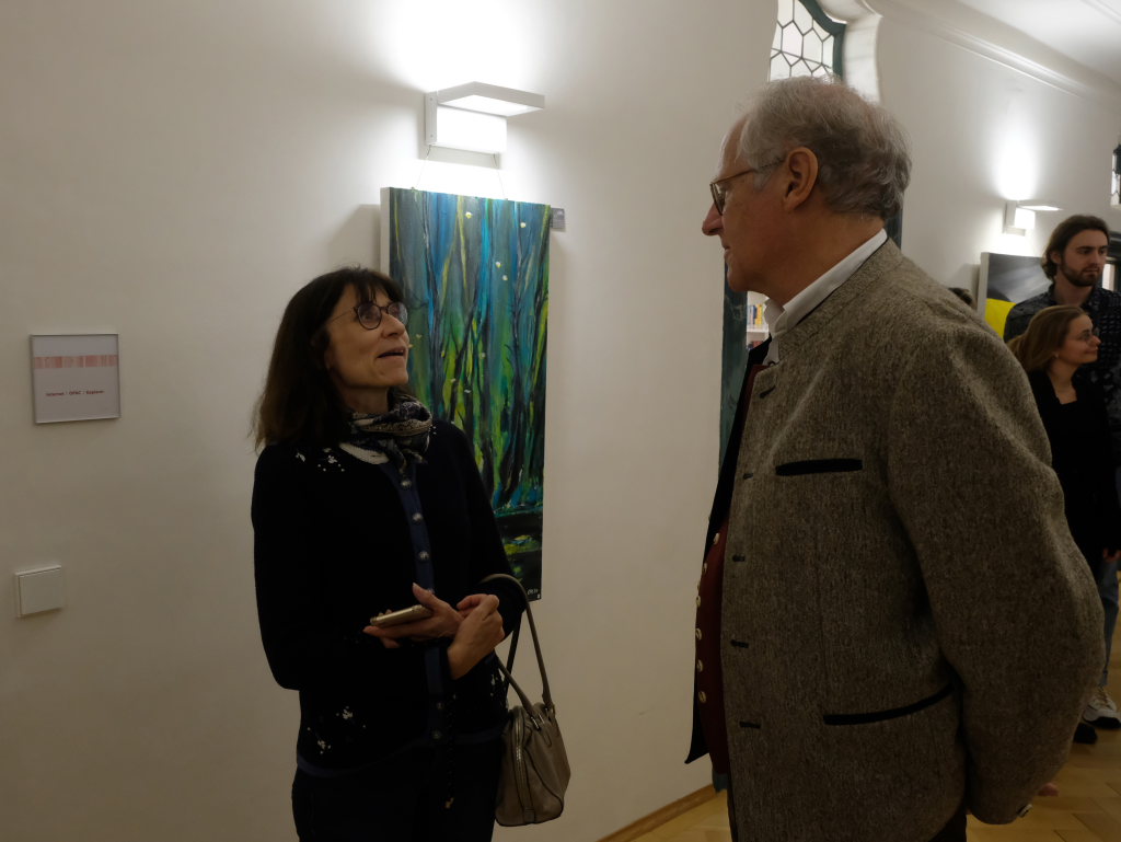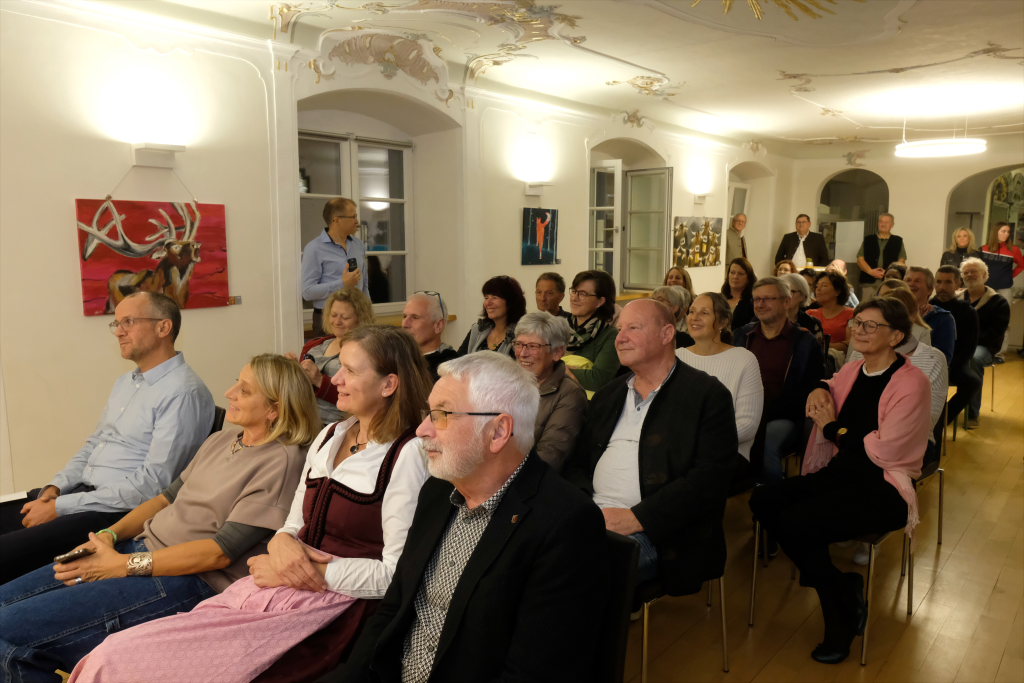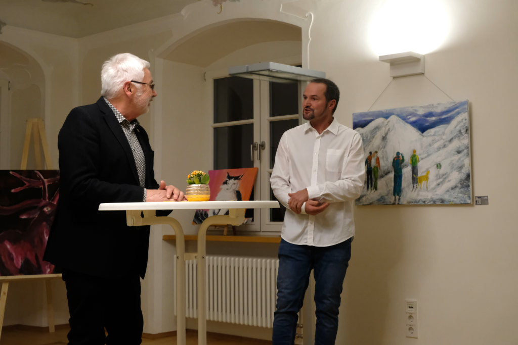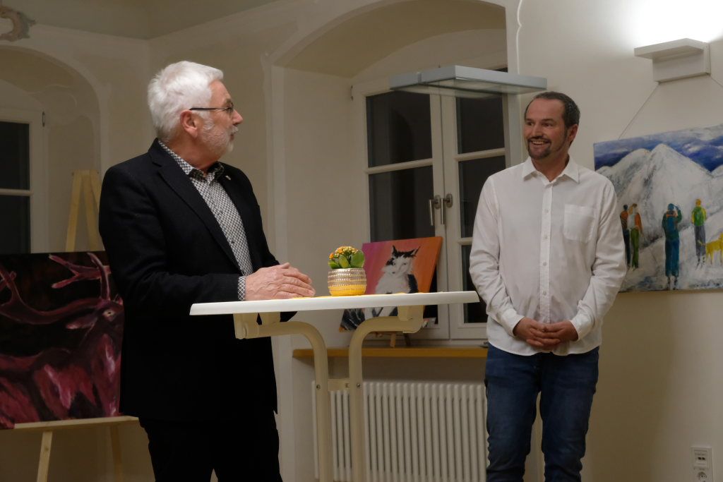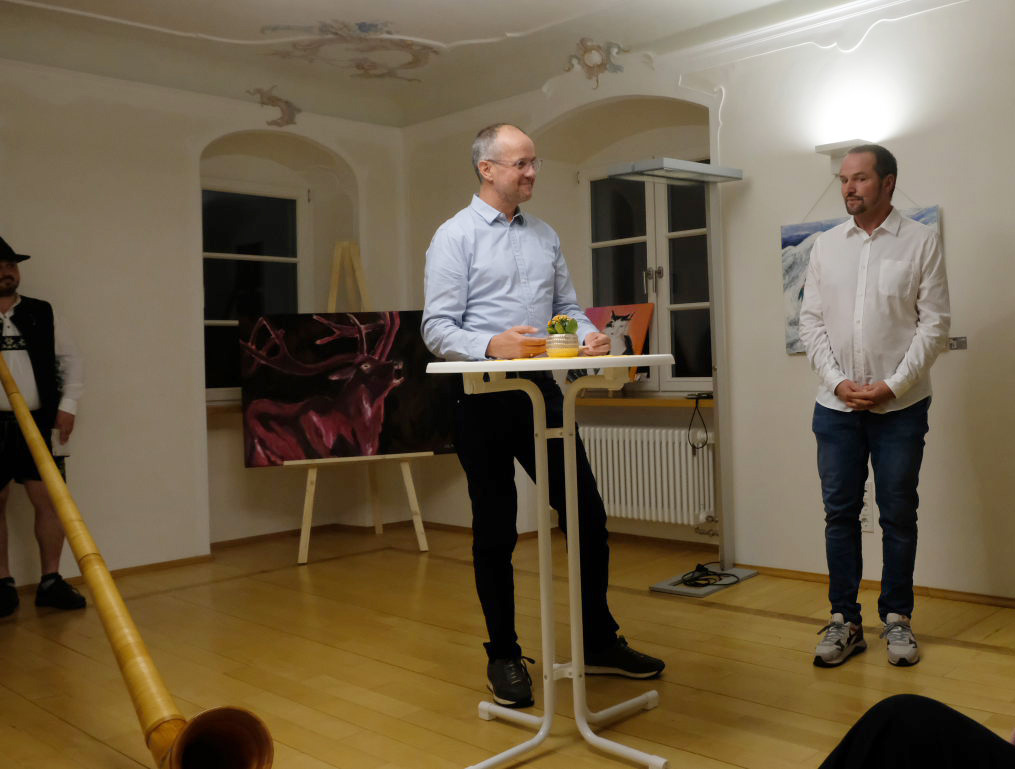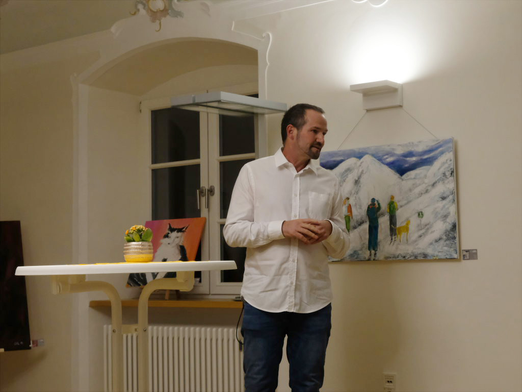 Jürgen Rieker hielt die Laudatio auf den Künstler. Er kennt diesen von Kindesbeinen an – er war mit ihm in Frauenzell aufgewachsen und ist seit langem mit ihm befreundet; natürlich hatte Rieker einige Anekdoten zu Christoph Reich, der seine Brötchen als Mediengestalter und Grafiker verdient, auf Lager.
