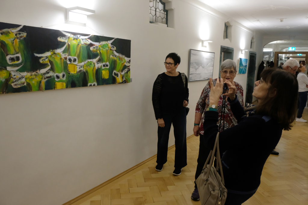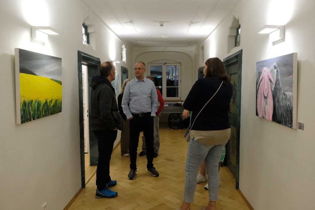 Und noch ein Bonmot hatte der Laudator auf Lager: Weil der Künstler nicht nur grüne Kühe malt, sondern auch bunte Hühner, grüne Hasen, pinke Schafe oder rote Katzen, da hätten sich die Leute im kleinen Frauenzell bei seinen ersten Ausstellungen erst einmal die Augen gerieben. Auf Rad- und Skitouren geht der Künstler seinem Hobby nach: Fotografieren. Aus diesen Bildern schöpft er dann die Inspiration für die entsprechenden Bilder, die auch in der Ausstellung zu sehen sind.