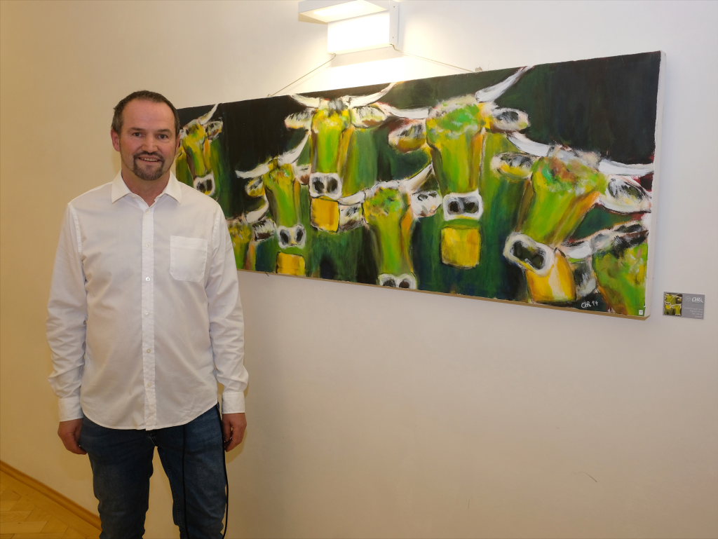 Mit dem Malen angefangen hatte Christoph Reich schon als Bub auf dem elterlichen Hof: Weil Papier knapp war, bemalte er damals die Rückseiten von ausgemusterten Tapetenbüchern. Auf dem Hof gab es jede Menge Malmotive: Pfaue, Kühe, Schweine, Hunde und Katzen. Daraus entwickelten sich dann im Laufe der Jahre viele Motive der jetzt ausgestellten Bilder. Zu seinem Markenzeichen wurden die „Grünen Kühe“, die in Variationen in der Ausstellung auftauchen. Warum diese nicht braun oder gar lila, sondern grün sind, das entziehe sich seiner Kenntnis erzählte Rieker mit einem Augenzwinkern. „Fragt ihn am besten selbst.“