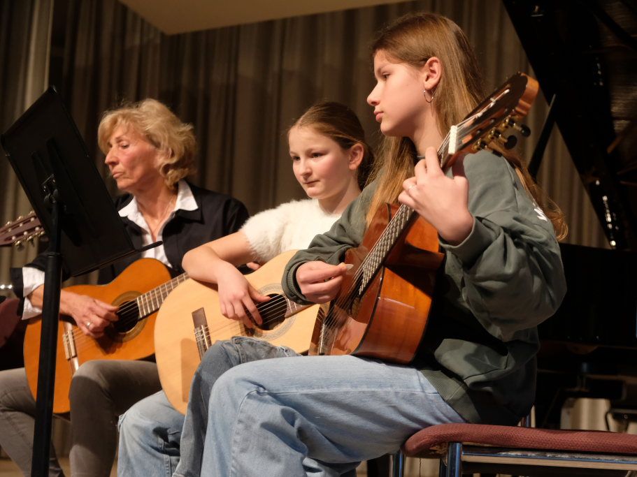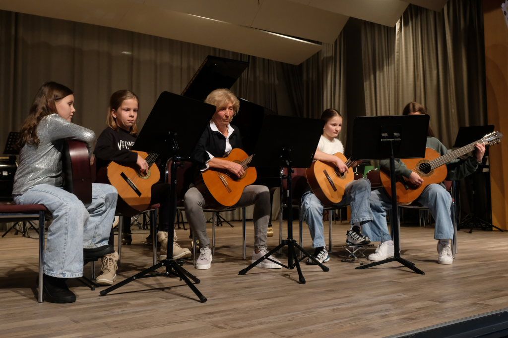 Und noch einen weiteren Auftritt mit ihren Schülerinnen hatte Dorith Strobel: Ihre Gitarrenklasse – Mirja Schad, Lennja Osterkamp, Katharina und Valentina Bohr – spielte die Titelmelodie von „Drei Haselnüsse für Aschenbrödel“ in Deutschland besonders bekannt in der Version von Ella Endlich „Küss mich, halt mich, lieb mich“.