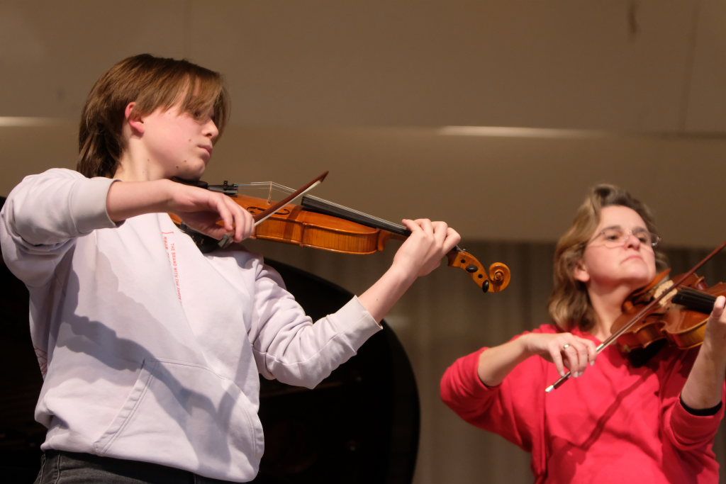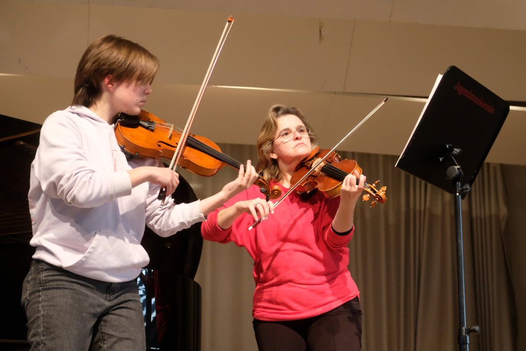 Ebenfalls schon hervorragend ihr Instrument, die Geige, im Griff hat Elise Katzenmaier. Sie spielte zusammen mit ihrer Lehrerin Theresia Weber, die seit September mit im Team der Jugendmusikschule ist, zwei Klezmer Stücke: „Sephardic Walz“ und „Las esuegras de agora“.