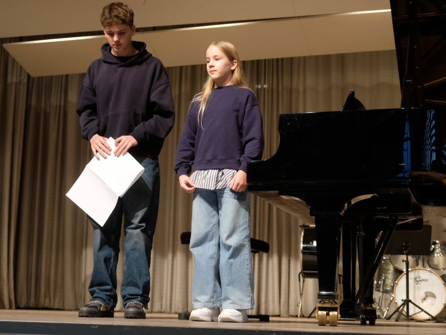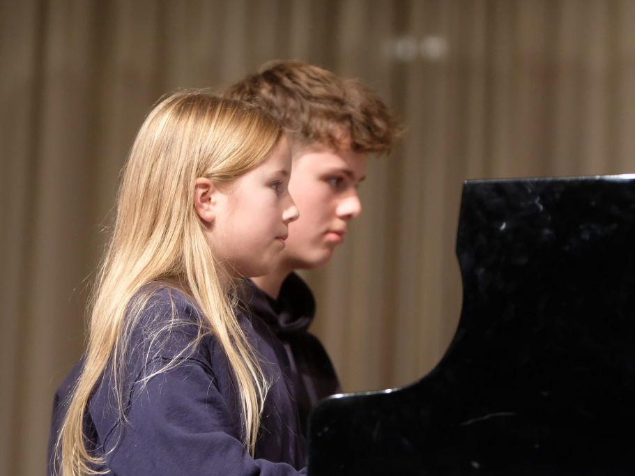 Mit Klavier zu vier Händen ging es weiter: Die beiden Geschwisterpaare Josephina und Anton Fessler mit dem Titel „Hürdenlauf“ und Antonia und Hannes Pfeiffer mit „New York bei Nacht“ aus der Klavierklasse von Martina Blum machten den Flügel zum Ensembleinstrument.