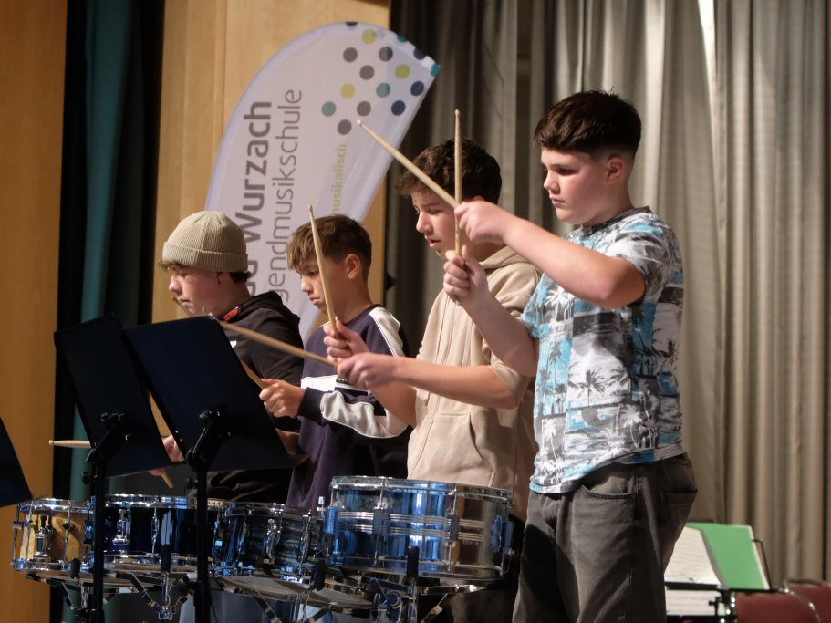Danach wurde es laut: Die Schlagzeugklasse von Michael Porter hatte sich etwas besonderes einfallen lassen. Mit vier Snare-Drums interpretierten die vier Jungs Vitus Vincon, Linus Reich, Luis Faßnacht und Samuel Schöllhorn jeweils mit Pokerface das Stück „Pole Position“ von Eckhard Kopetzki ein wenig – ein bisschen Show muss sein – im Stile der Blue man group.