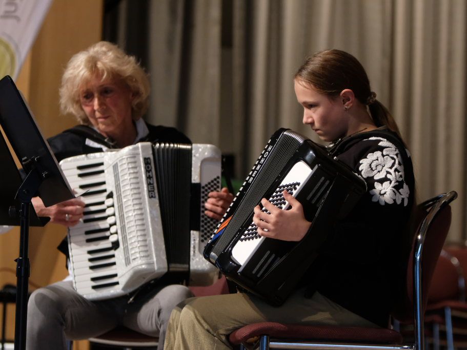 Auch beim nächsten Programmpunkt blieb die Musik poppig: Melinda Hauffler aus der Keyboardklasse von Dorith Strobel spielte „Don´t be so shy“ von Imany, das man – bezogen auf das Konzert allen Teilnehmern wünschen mochte. Aus der Akkordeon-Klasse von Dorith Strobel spielte im Anschluss Luisa Tobisch gemeinsam mit ihrer Lehrerin das Stück „Lilli und Willi, zwei Berliner Rangen“.