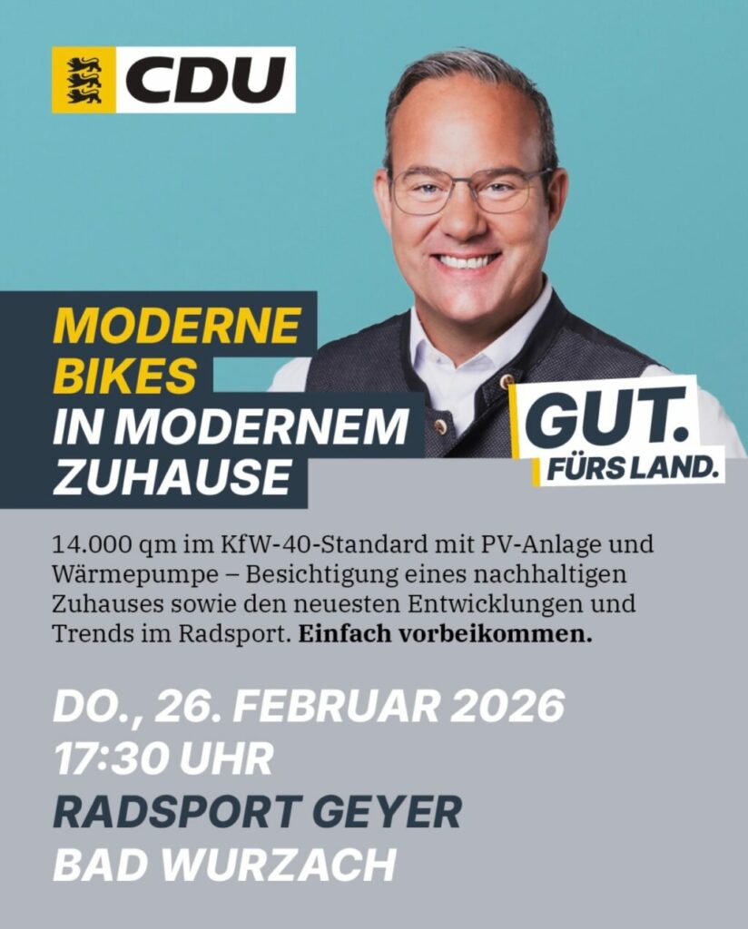 Bad Wurzach – Im Rahmen seiner Wahlkampftour besucht der Landtagsabgeordnete Raimund Haser mit der CDU Bad Wurzach am Donnerstag, 26. Februar, um 17.30 Uhr die Firma Zweiradsport Geyer, Niedermühleweg 20, Bad Wurzach. Stefan Geyer und sein Team zeigen die neuen und nachhaltigen Geschäftsräume sowie die neuesten Entwicklungen und Trends im Radsport. Interessierte Bürger sind bei diesem Firmenbesuch willkommen.