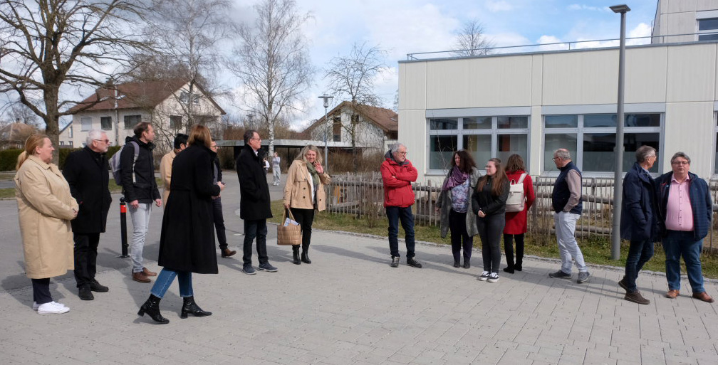 Bürgermeisterin Alexandra Scherer begann ihre Einführungsrede mit einem kleinen Rückblick: Seit seinem letzten Besuch habe sich viel getan. Sie erwähnte, dass der Turmbau nach dem Bürgerentscheid ad acta gelegt sei. Weil der Kurpark nahtlos in das Ried, das ein Naturschutzgebiet ersten Ranges ist, übergeht, aber dieses auch großen Unterhalt erfordere, werde man nach dem neugestalteten Schulhof am Nachmittag auch den Kurpark besichtigen.