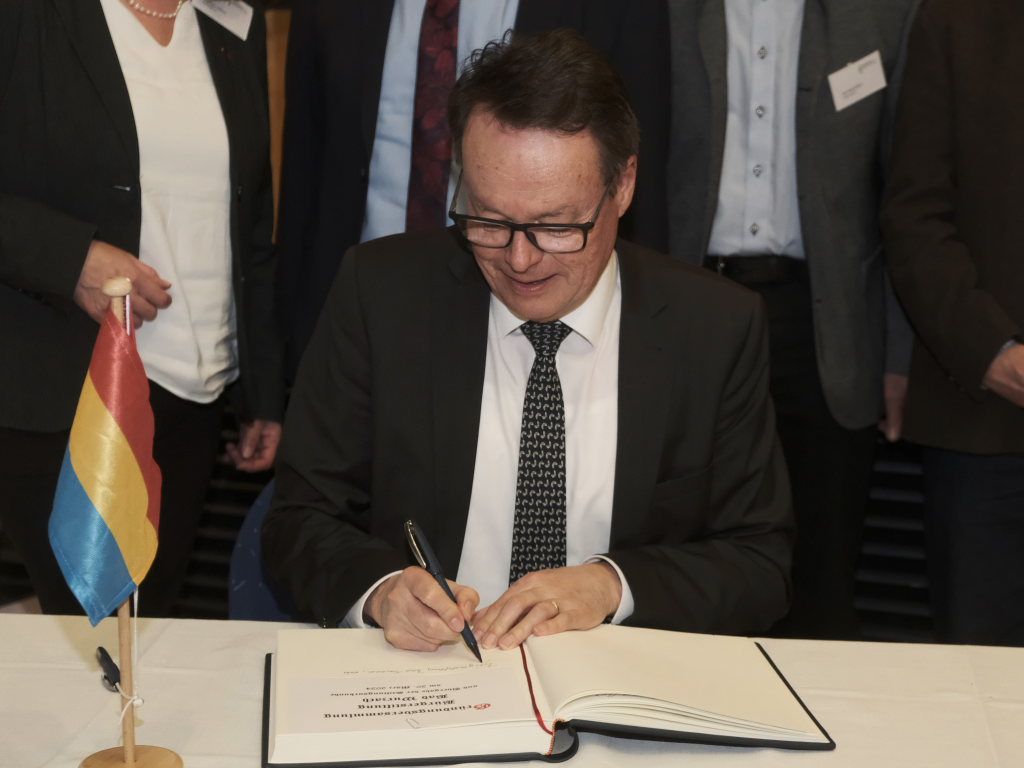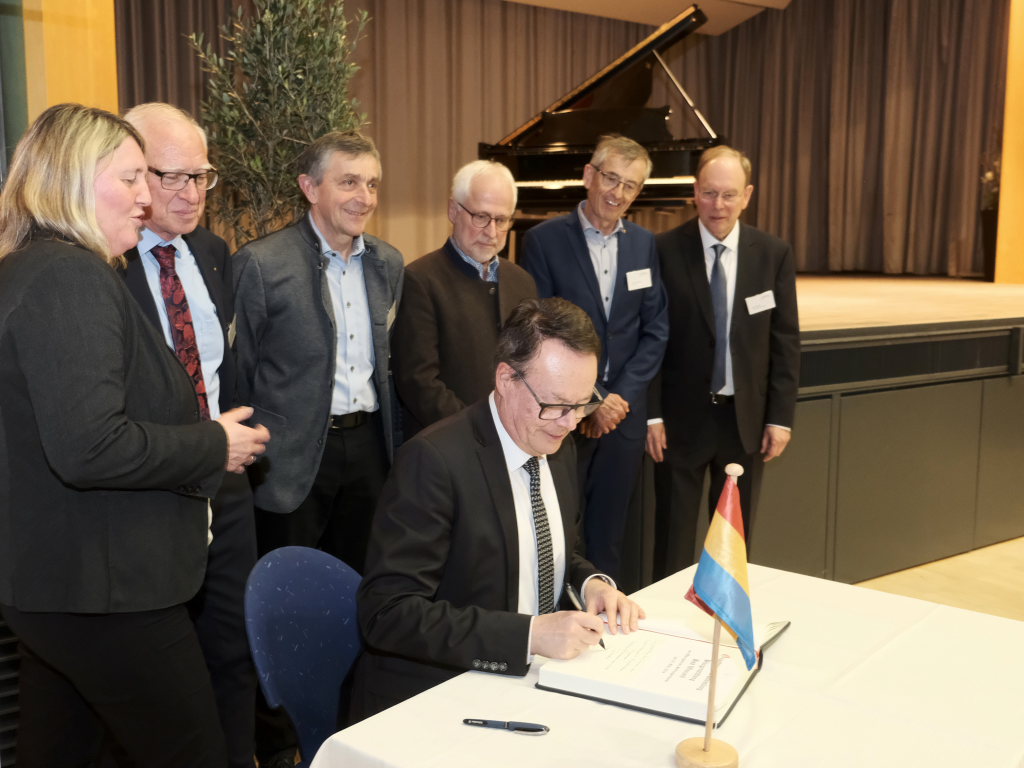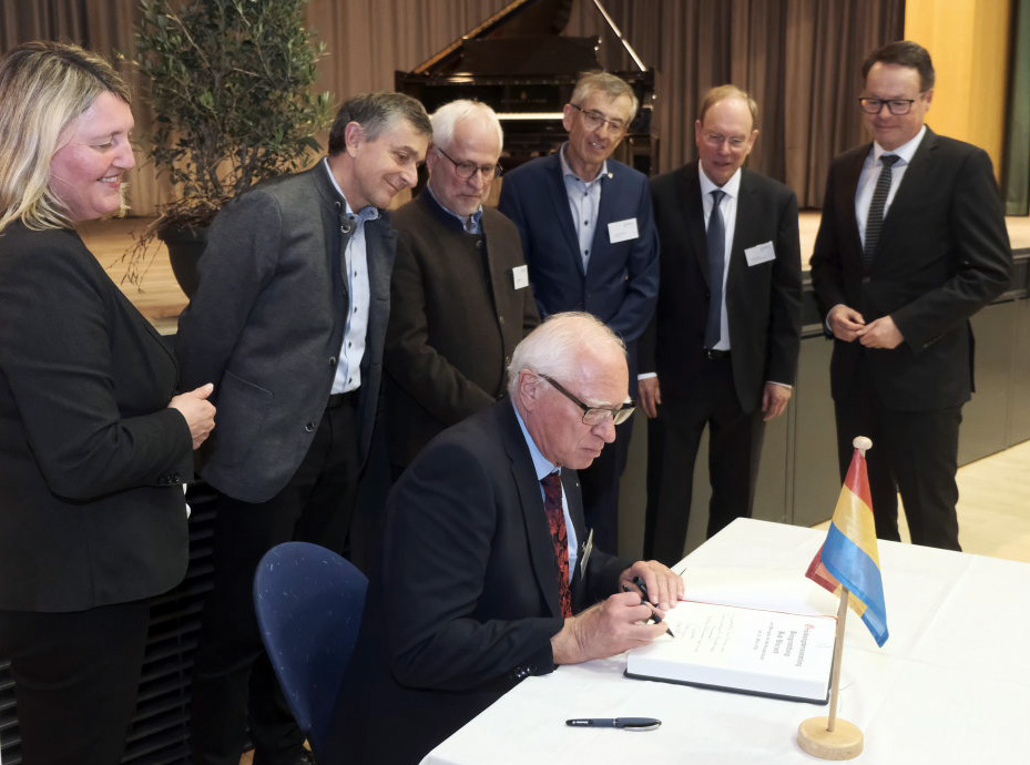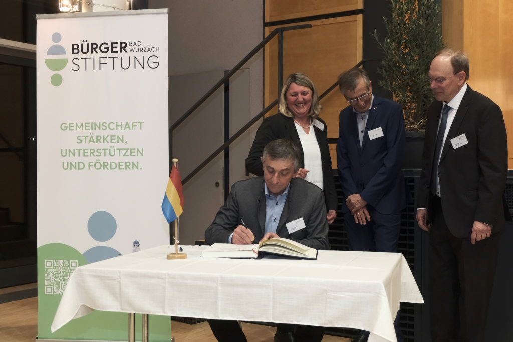 Regierungspräsident Klaus Tappeser schrieb ins Goldene Buch: „Bürgerstiftung Bad Wurzach – ein Musterbeispiel für bürgerschaftliches Engagement! Herzlichen Glückwunsch und viele Spenden!“ Dazu durften sich die fünf Initiatoren der Stiftung mit ihren Unterschriften „verewigen“.