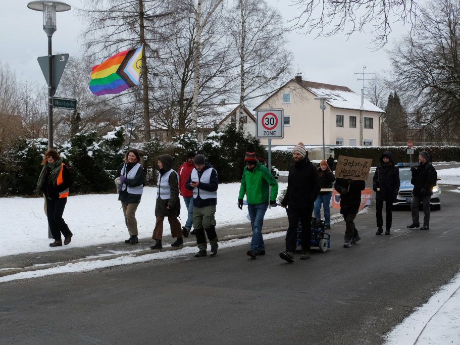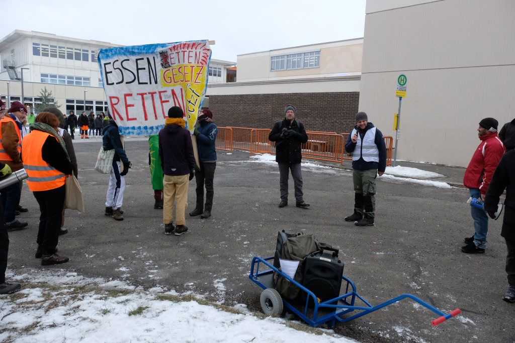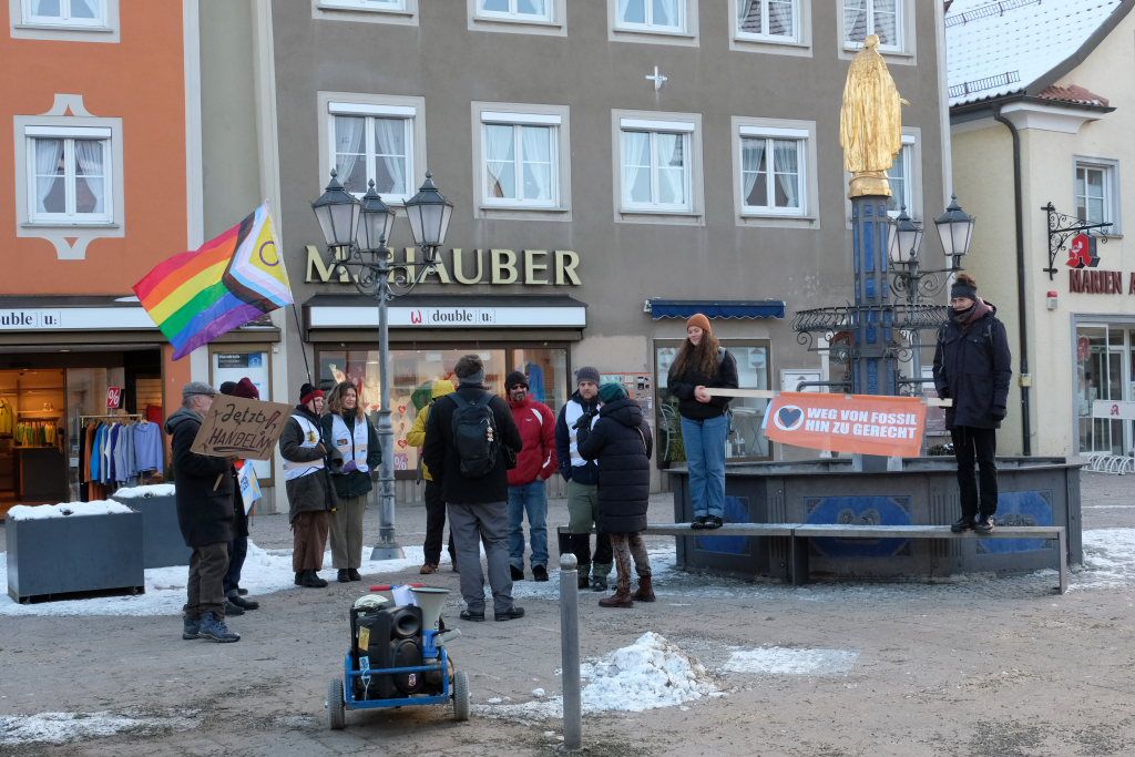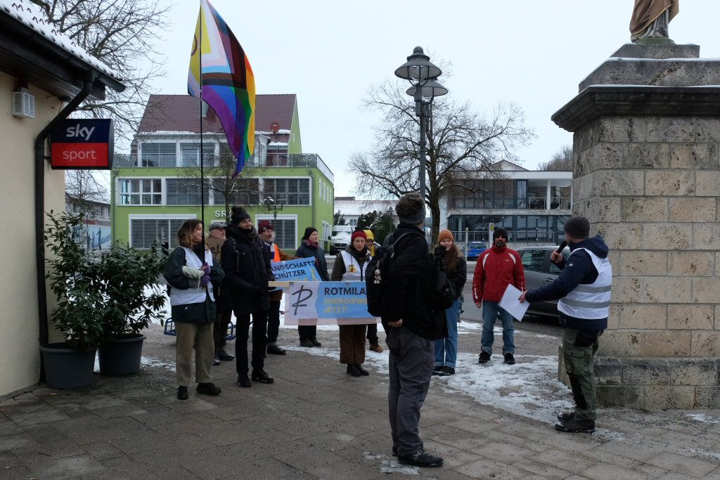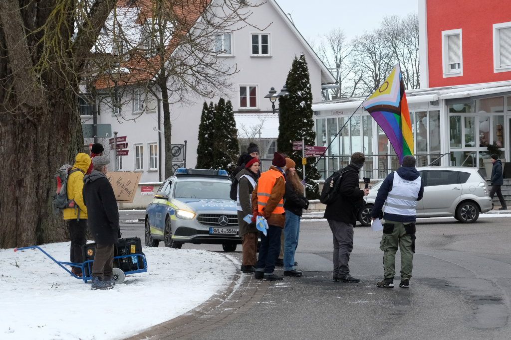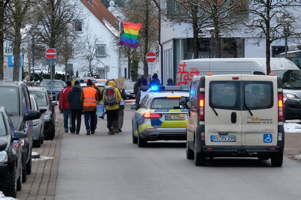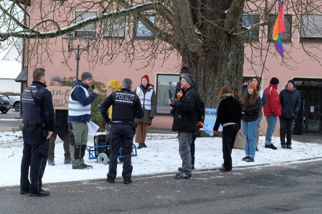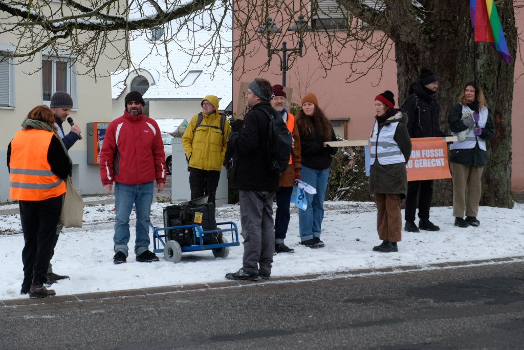 Als sich der Bus mit den Bundes-Klimaaktivisten verabschiedet hatte, blieb das Dutzend „einheimischer“ Demonstranten zurück. Diese zogen dann in Begleitung zweier Polizeiautos über die Ravensburger Straße weiter gen Busbahnhof beim Salvatorkolleg. Anders als im Vormonat durften sie jedoch mit ihren Transparenten „Rotmilan.eu – Energiewende jetzt“ und „Weg von fossil – hin zu gerecht“ nur auf die Grünfläche unter der Kastanie gegenüber. Als einige der Demonstranten wegen des dort liegenden Schnees auf die Straße ausweichen wollten, schritt die Polizei ein und wies sie auf die hierfür fehlende Genehmigung hin.