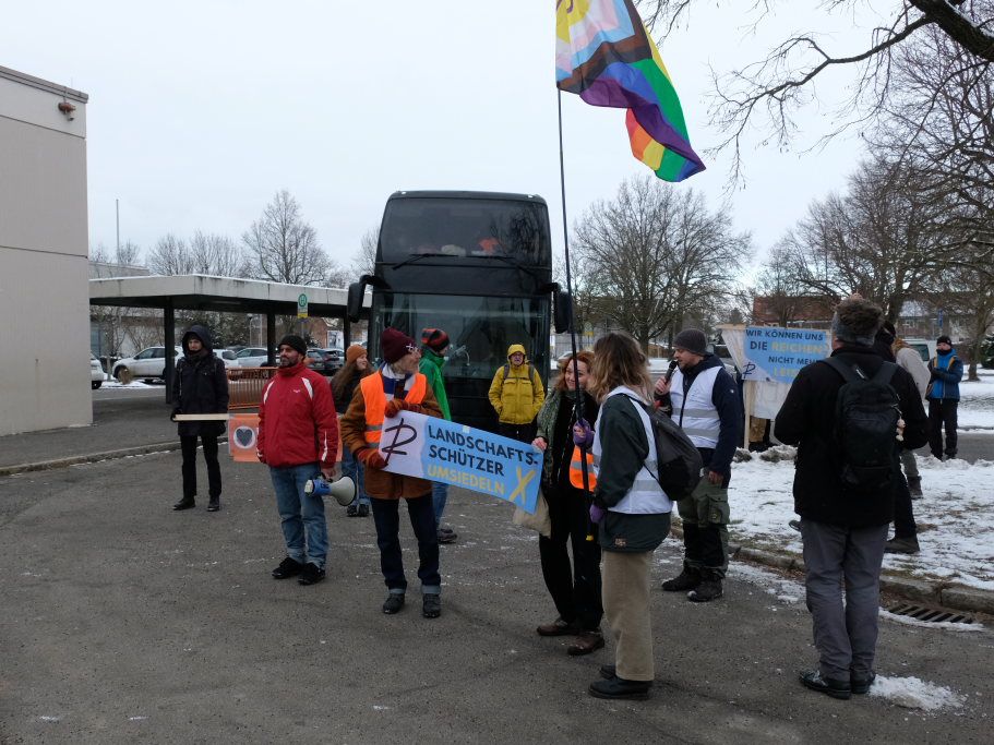 Die Klimaaktivisten forderten auf Transparenten „Landschaftsschützer umsiedeln“ und zogen einen Vergleich mit der Umsiedlung des Dorfes Lützerath bei Köln, um das lange von Klimaaktivisten gekämpft worden war und das letztlich dem Tagebau weichen musste.
