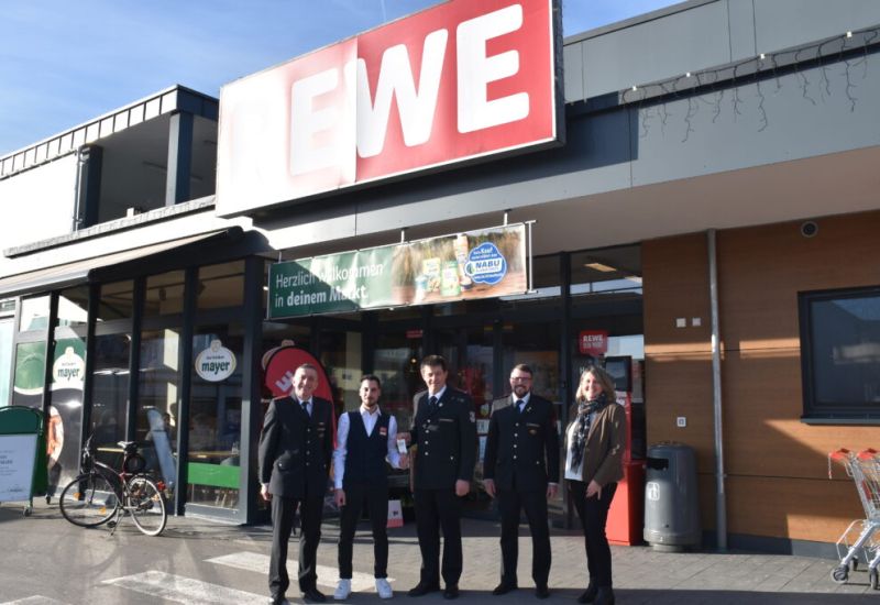 Bei der Spendenübergabe v.l.n.r.: Karl-August Mohr (Vorsitzender Förderverein Feuerwehr), Mahmut Bor (Marktleiter REWE), Rolf Butscher (Feuerwehrkommandant), Pascal Schmehl (Jugendwart Feuerwehr), Alexandra Scherer (Bürgermeisterin).