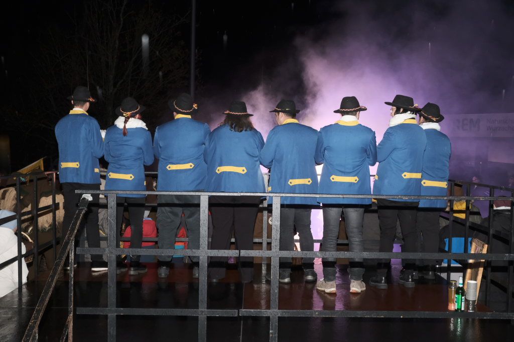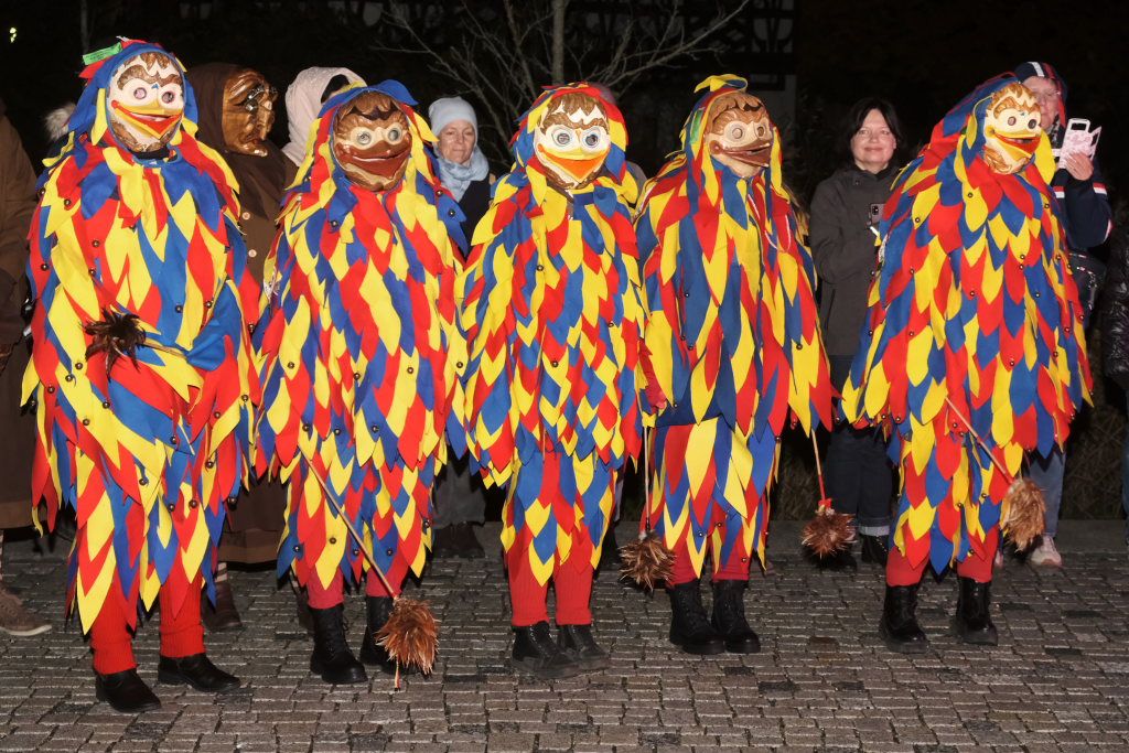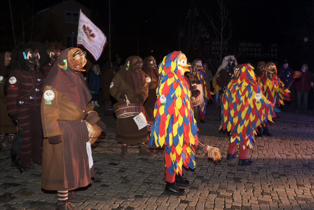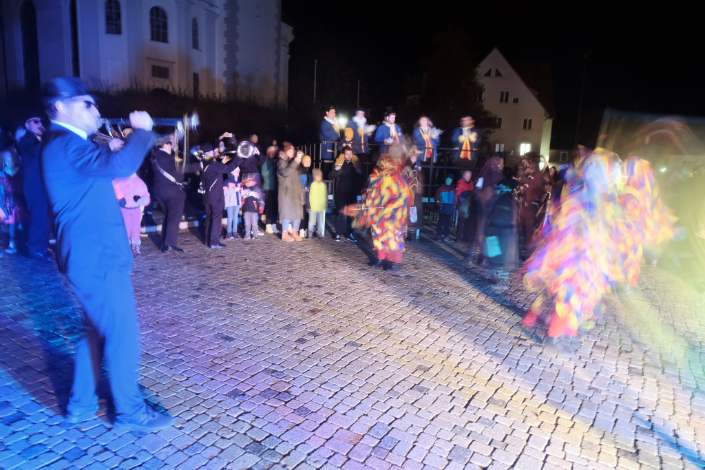Elferrat und Zunftmeister waren die nächsten, die vor die Zuschauer traten und die kleine Bühne enterten. Von dort aus trug Zunftmeister Dominik Neher – beginnend mit dem Namensgeber der Wurzacher Zunft, dem Riedmeckeler – die traditionellen Geschichten und Sagen der einzelnen Narrenfiguren vor, während diese aus dem künstlichem Nebel ins Rampenlicht vor die kleine Bühne zu Füßen von St. Verena und Maria Rosengarten traten. Riedmeckeler, Moorweibla, Burgfrau, Schnepfle – sie alle wirkten noch etwas ungelenk und verhalten, dennoch aber hochmotiviert und auch das wilde Muetesheer musste sich erst noch an die wiedergewonnene Freiheit gewöhnen.