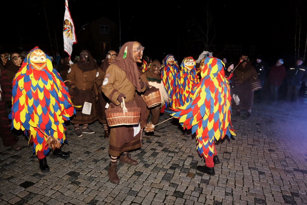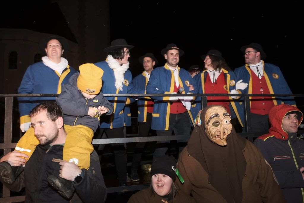 Bei einigen fetzigen Musikstücken des Fanfarenzuges wurde das G´schell von Riedmeckeler und Muetes aber doch rasch „entstaubt“ und alle Hästräger brachten sich und die Zuschauer damit für die neue Fasnetssaison in Stimmung. Auffallend viele der in den Stadtfarben blau, rot und gelb gewandete Schnepfle nahmen im Jubiläumsjahr der urkundlichen Ersterwähnung Wurzachs an dieser Fasnetseröffnung teil.