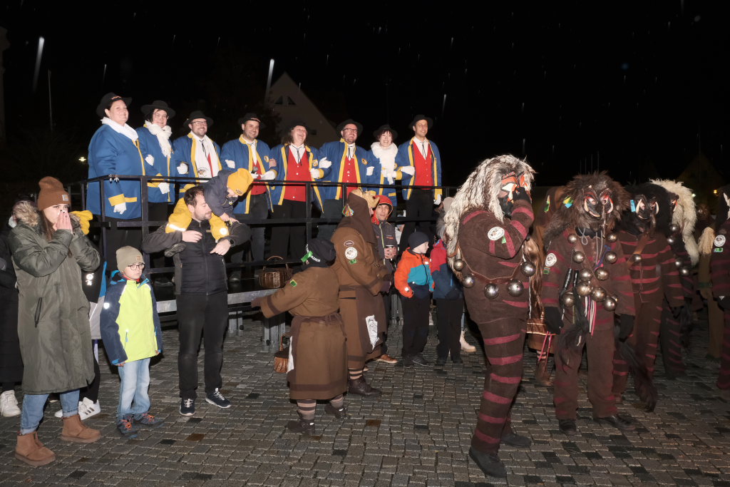 Bad Wurzach – Mit den Glockenschläge von Hells Bells, die sich an das Geläut der St. Verena- Kirchenglocken anschlossen, erfolgte am Samstagabend der Startschuss für die traditionelle Fasnetseröffnung der Bad Wurzacher Narrenzunft D´Riedmeckeler auf dem Klosterplatz.